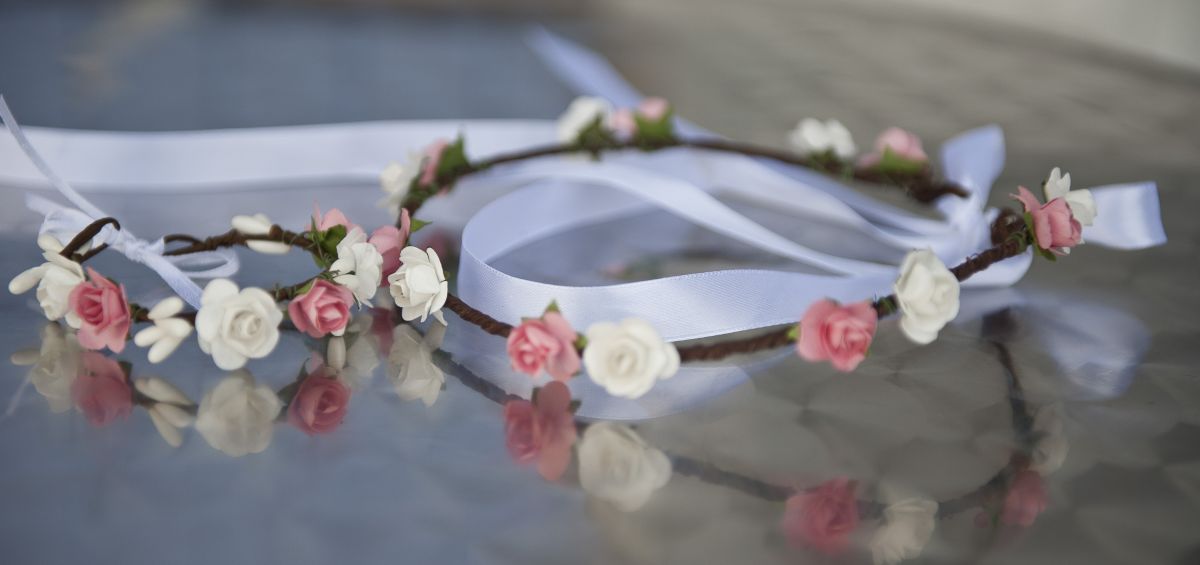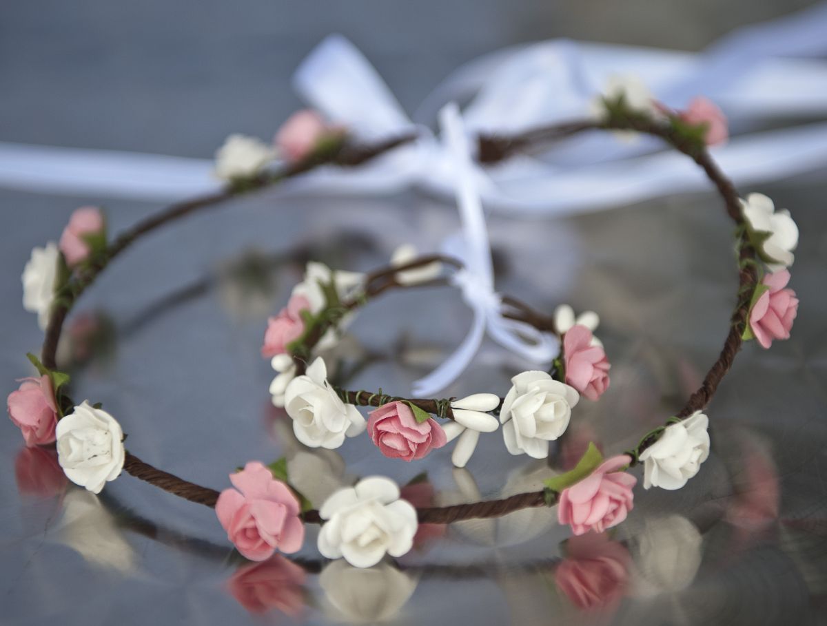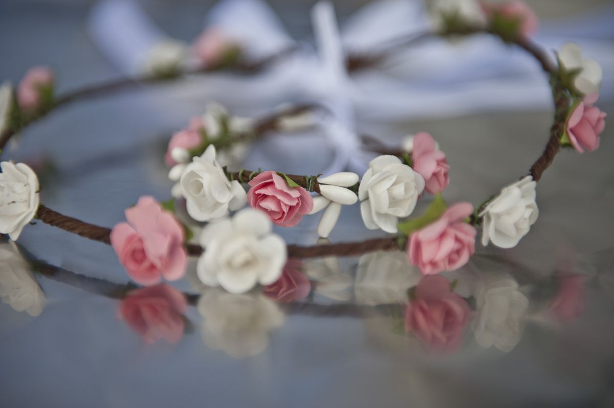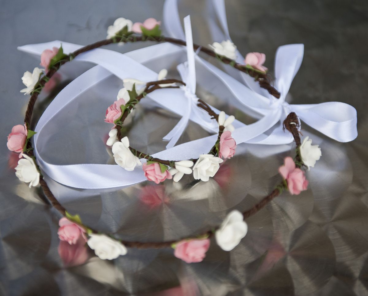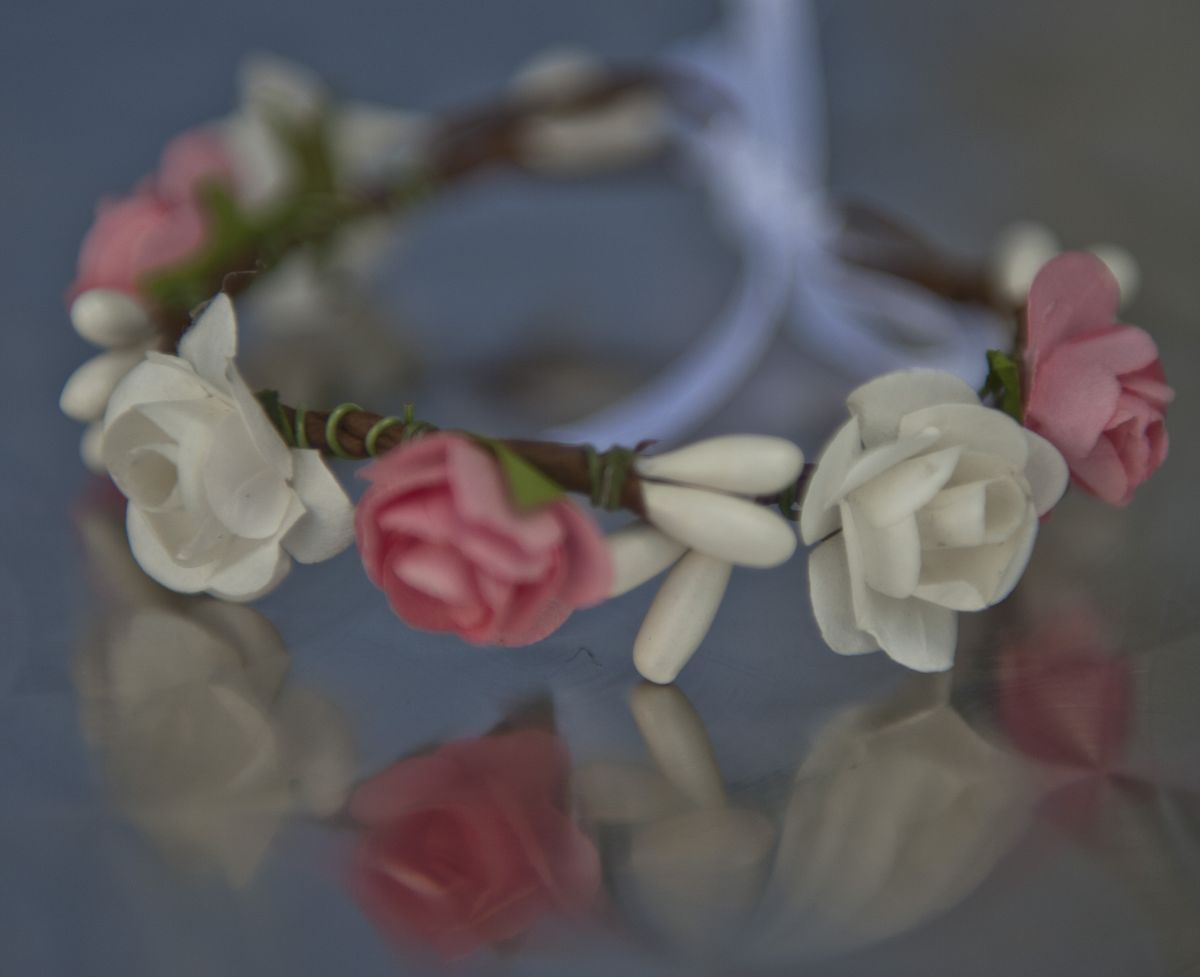 Couronne de fleurs rose saumon et blanches et son bracelet assorti pour demoiselle d'honneur ou toute autre occasion. Tour de tête environ 45cm. Fait main avec amour.