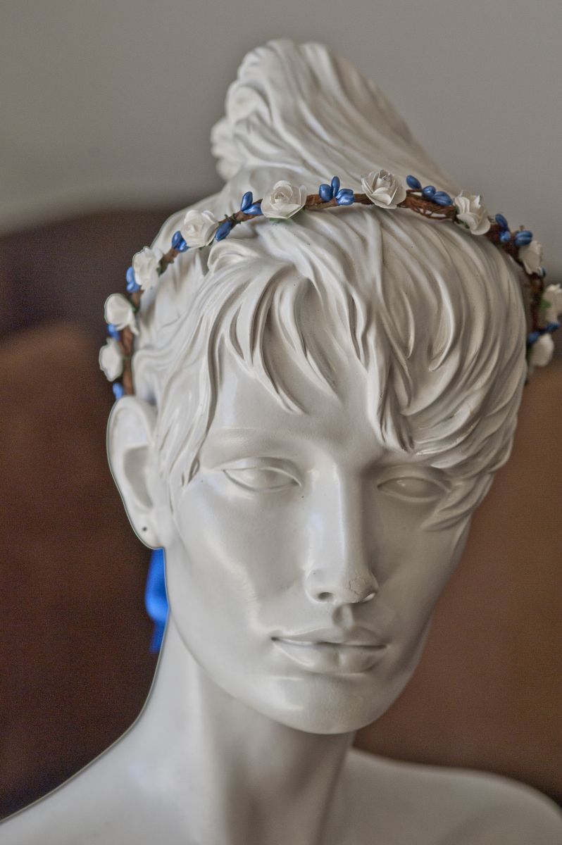 Couronne de fleurs blanches et de baies bleues et son bracelet assorti. Taille ado adulte. Fait avec amour.