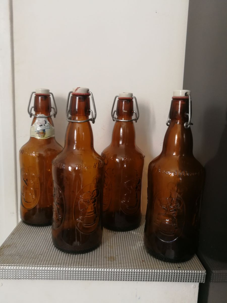 4 Bouteilles de bière d'Alsace '' FISHER'' vides' idéal pour une déco. Les caoutchoucs sont usées.