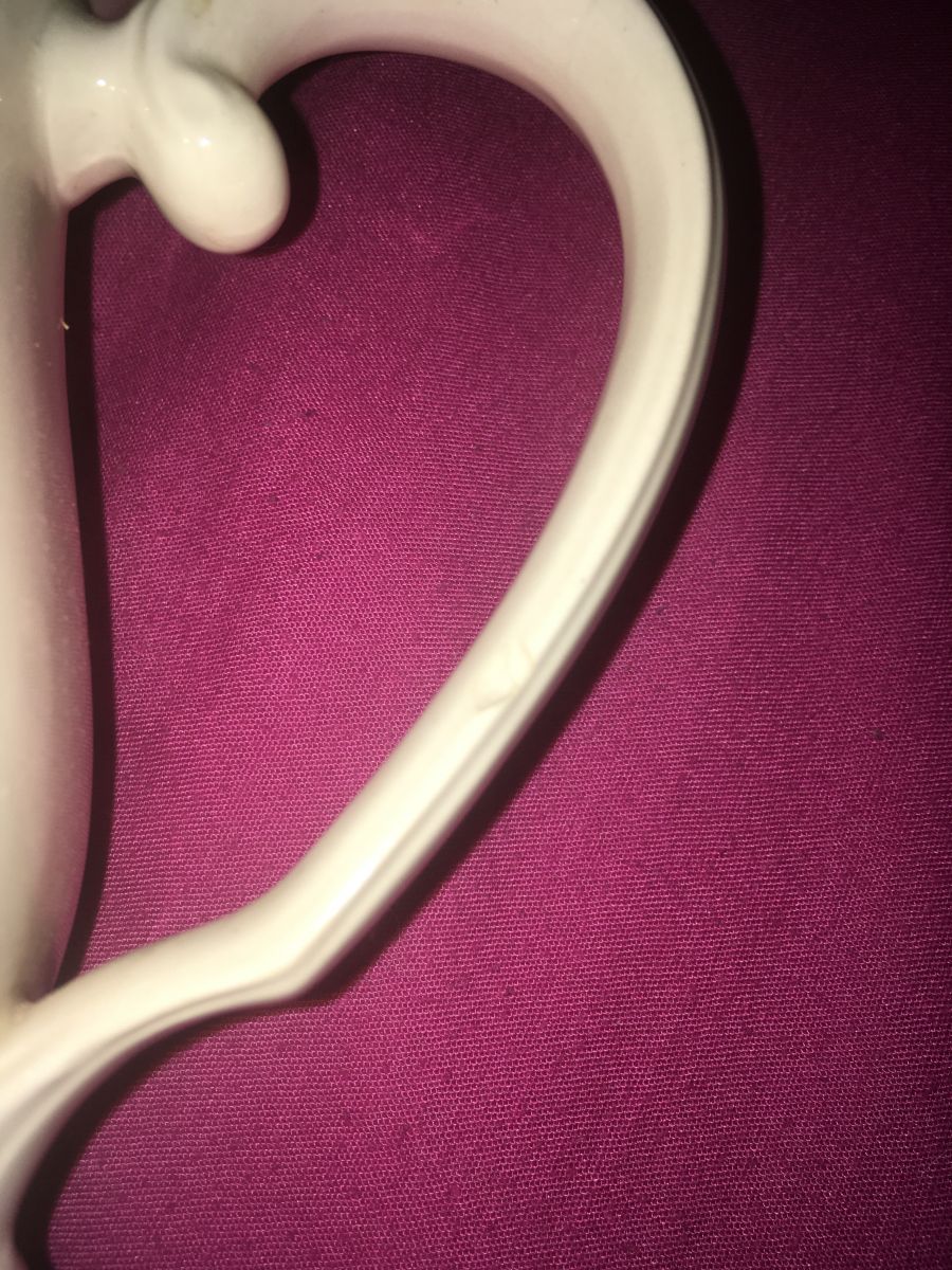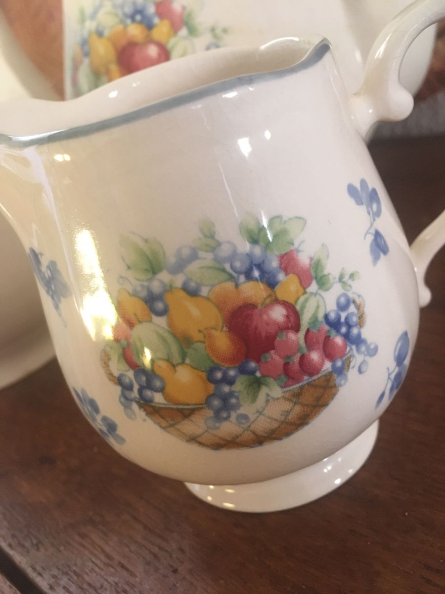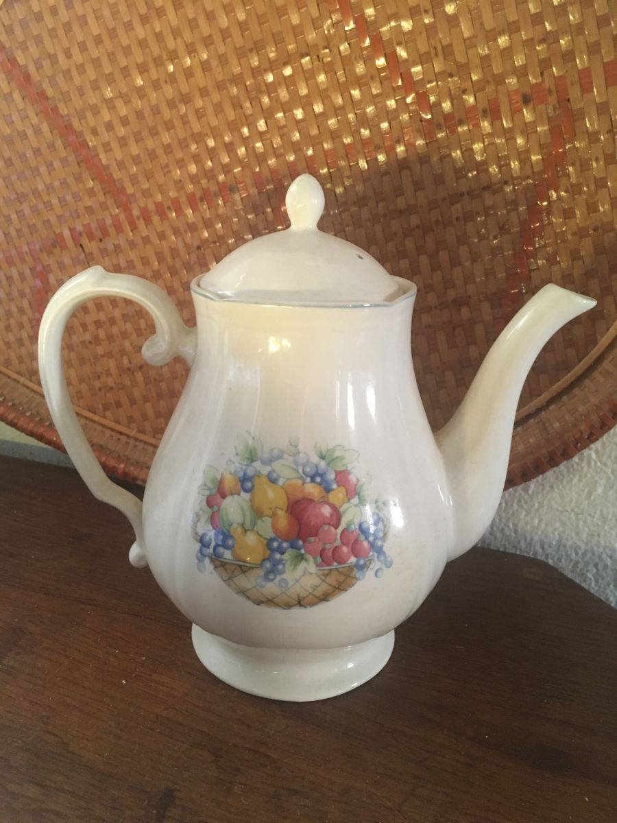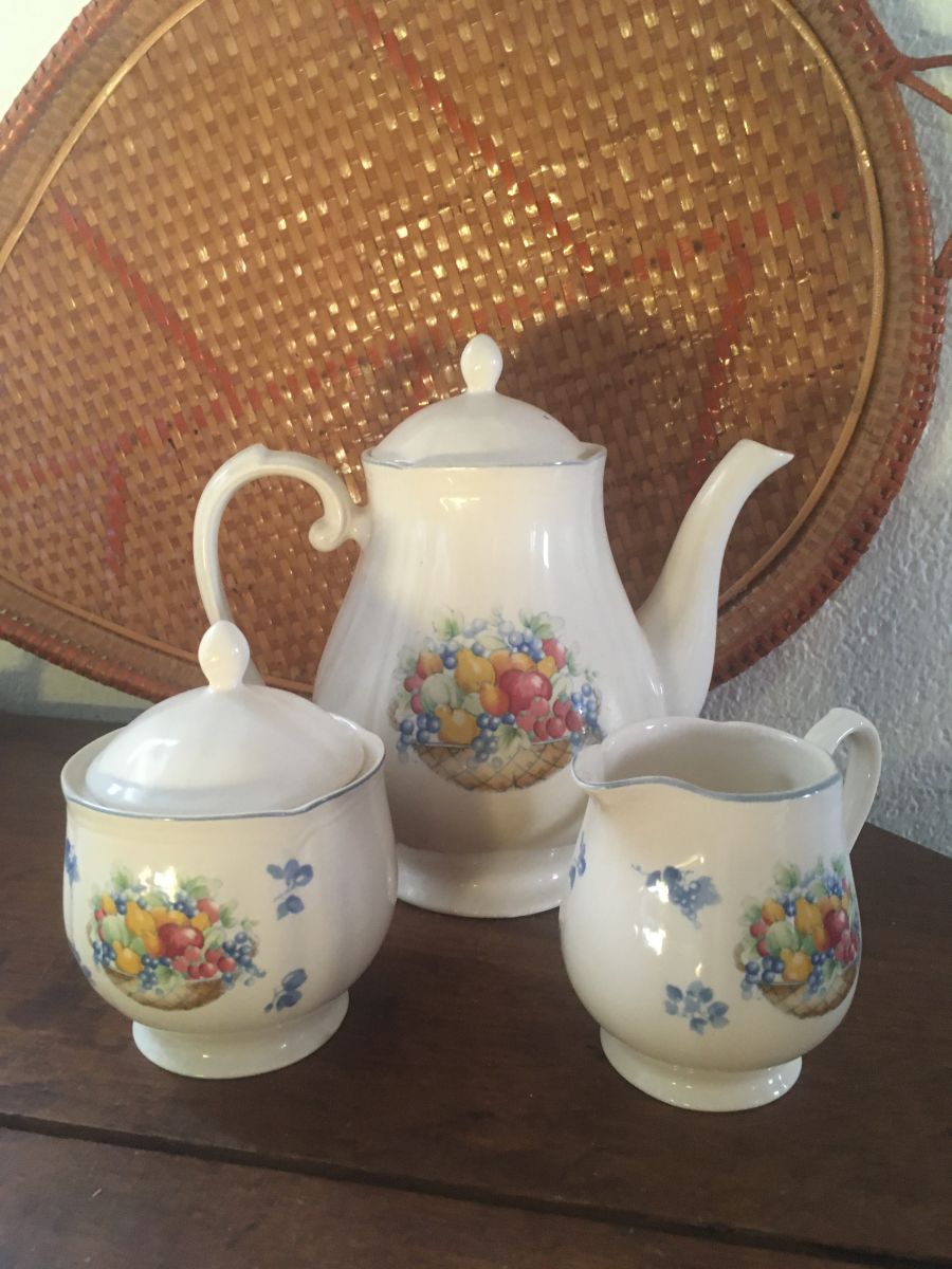 Ensemble théière ou cafetière, sucrier et pot à lait décorés de corbeille de fruits.Le tout est dans un état impeccable malgré petit éclat sur l anse de la cafetière .Hauteur cafetière 20 cm.
