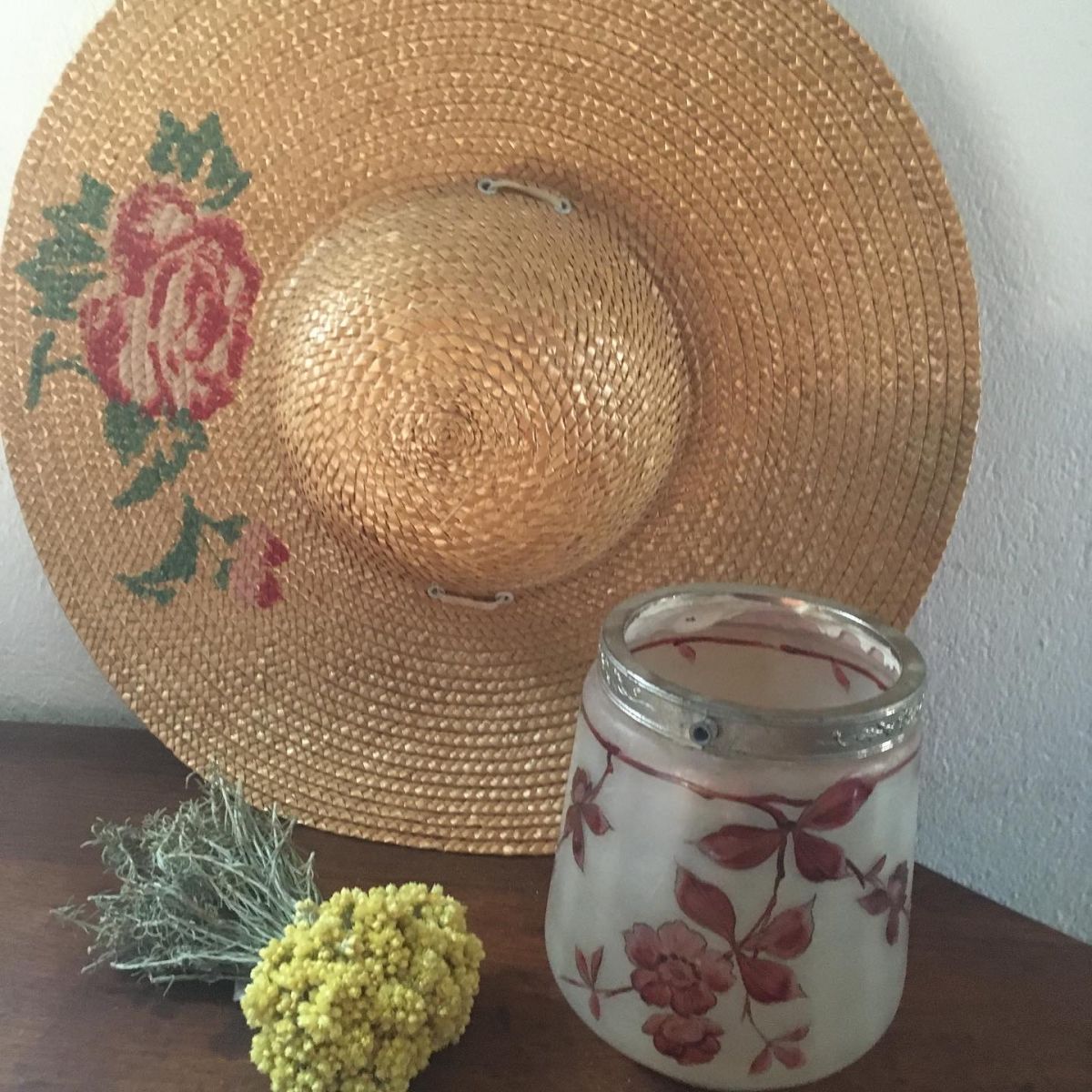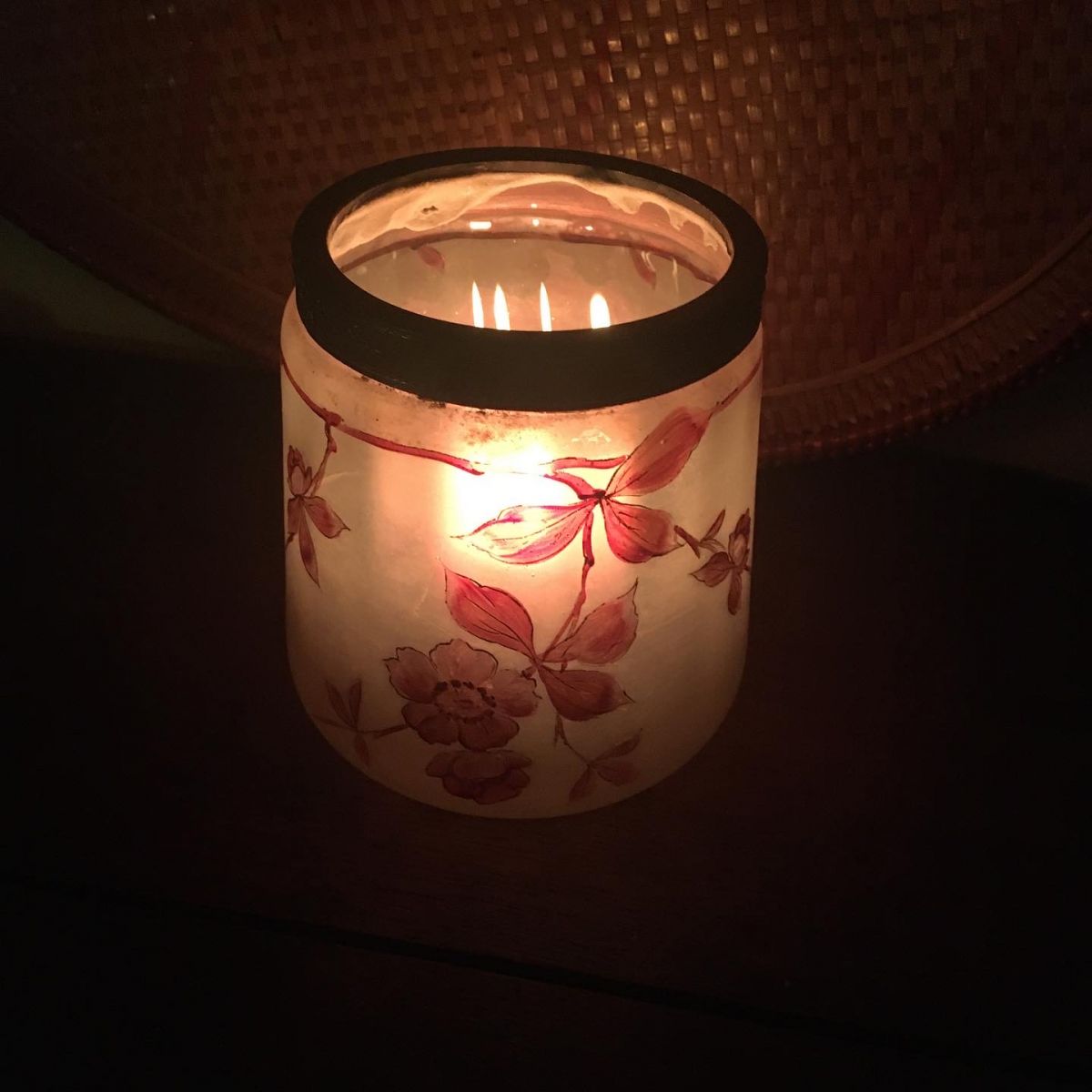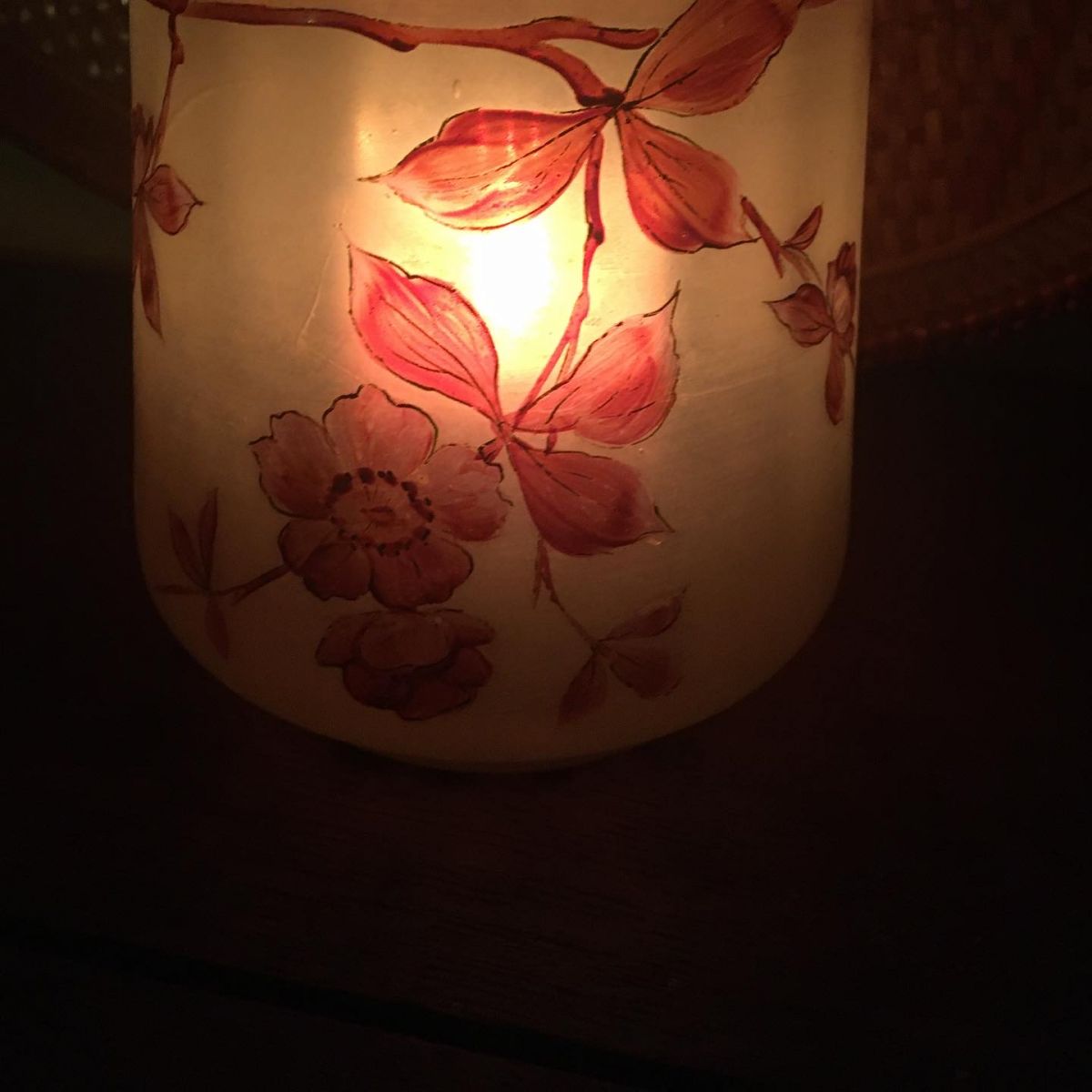 Pot à biscuits détourné en photophore.Ou comment faire d un objet ancien , une pièce unique revisitèe.De jolies fleurs sont dessinées sur un verre opaque , dépoli.Il manque l anse et trace du temps à l intérieur au niveau de la bordure, joliment travaillée.Peut aussi faire usage de vase.