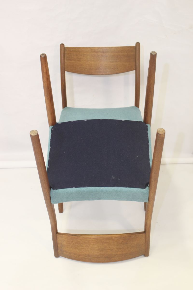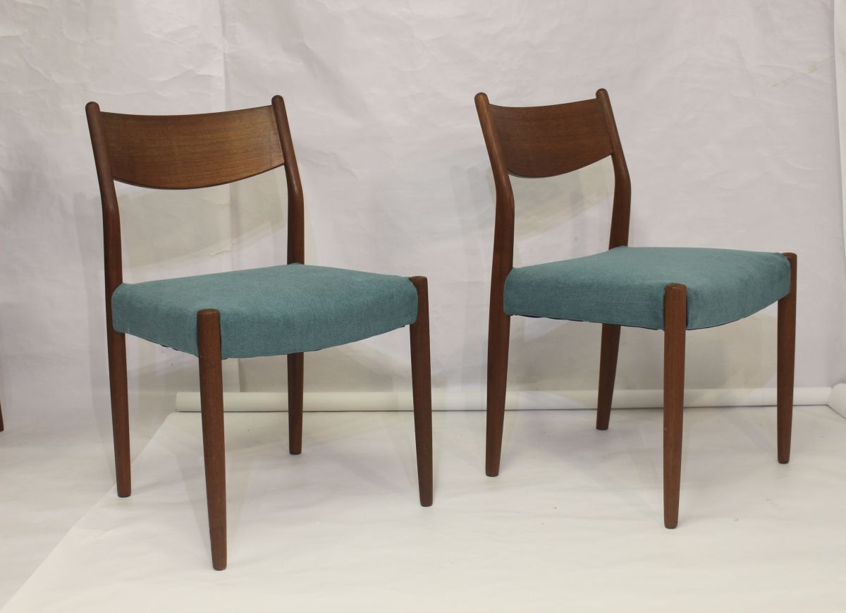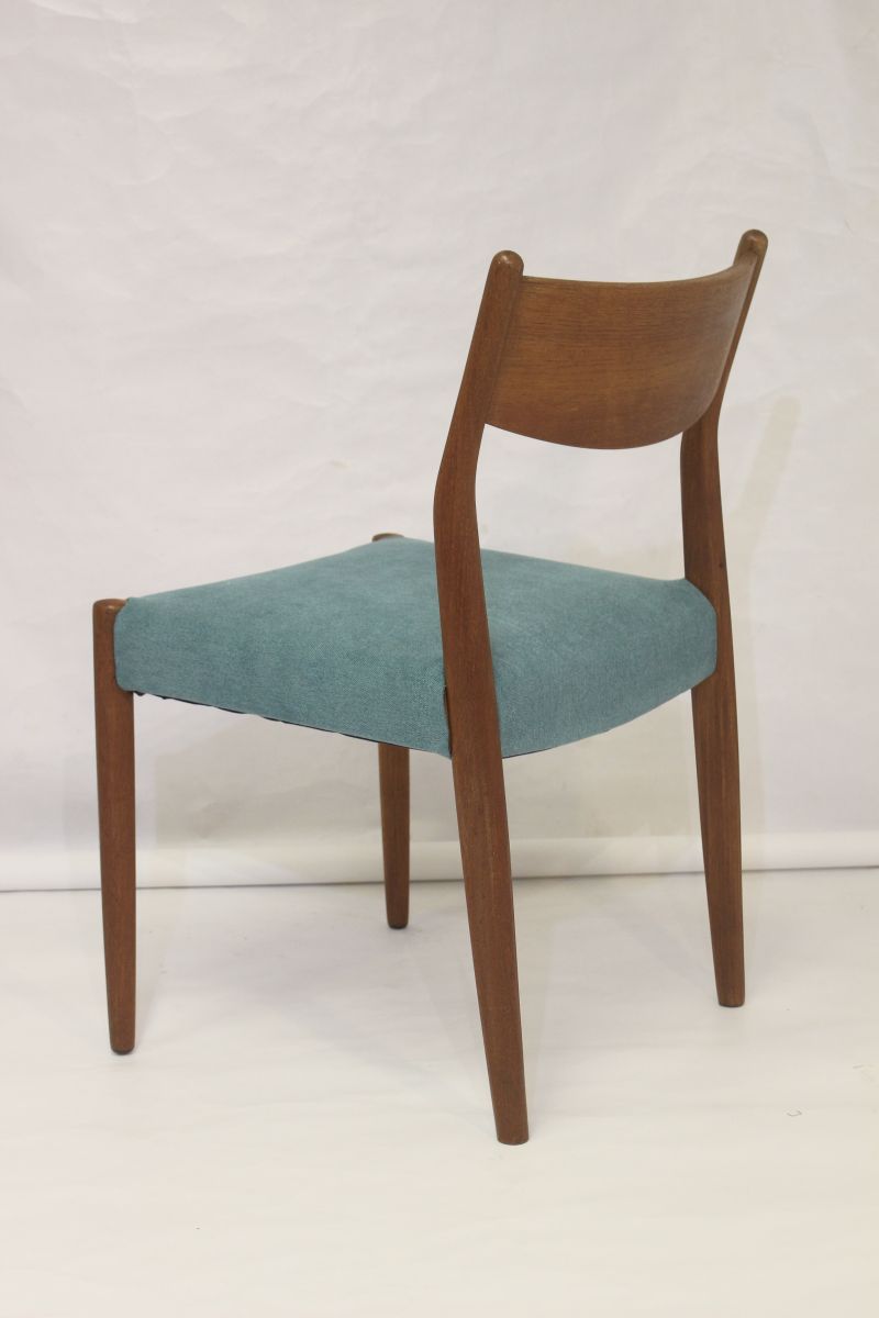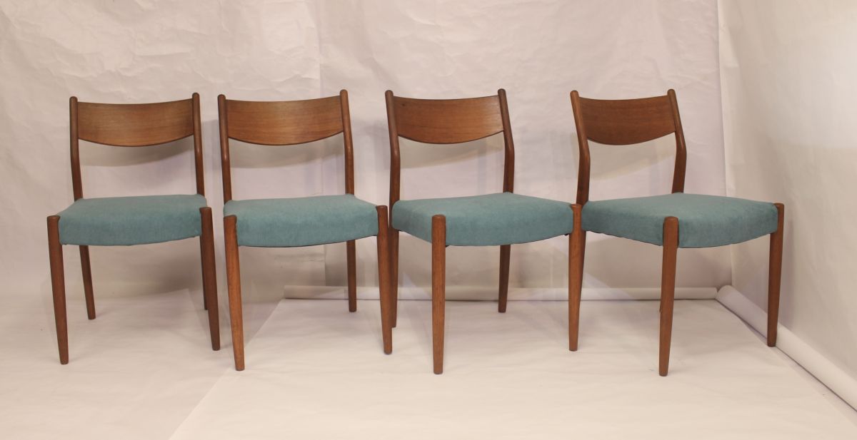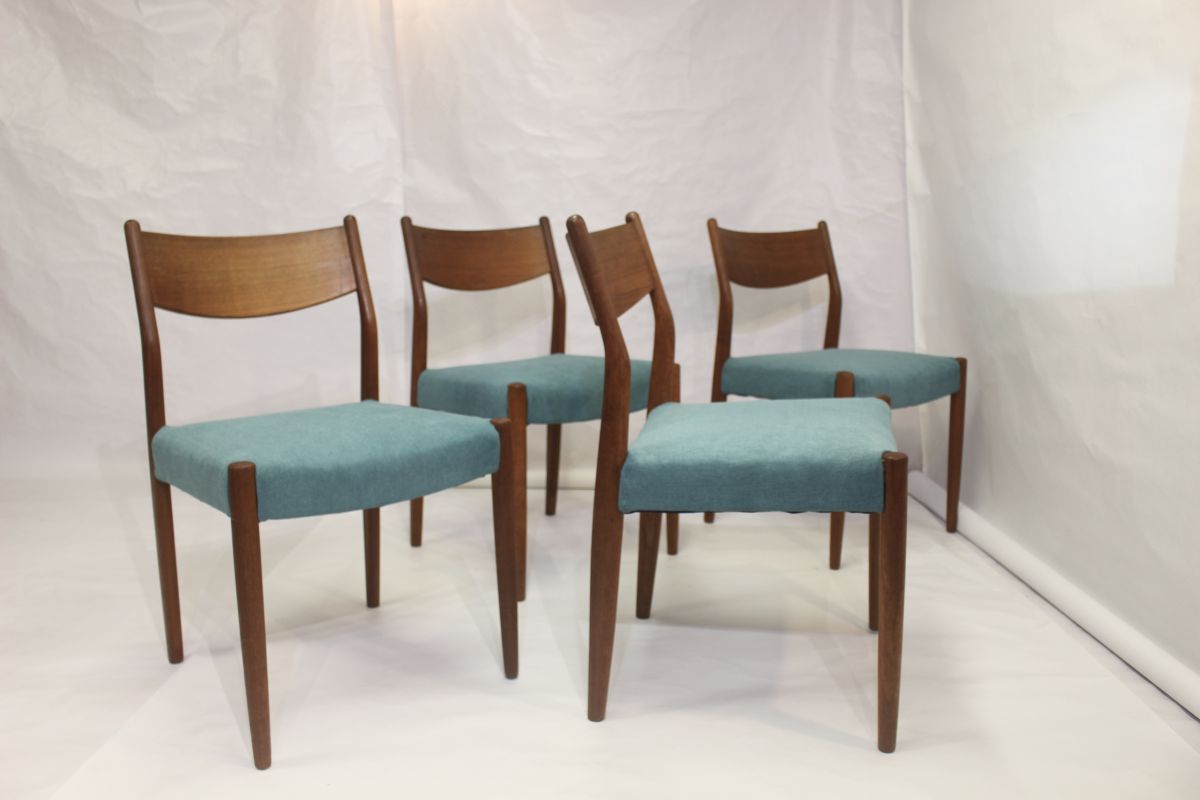 Séries de 4 chaises scandinaves créées par Cees Braakman en 1960 et éditées par U.S.M. Pastoe. Ces chaises en teck ont été entièrement restaurées. Structure bois en parfaite état. L’assise a été est restaurée et retapissé dans un tissu d’un beau lagon, anti tache.