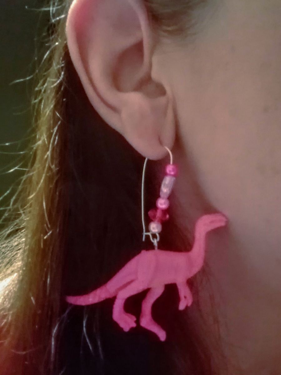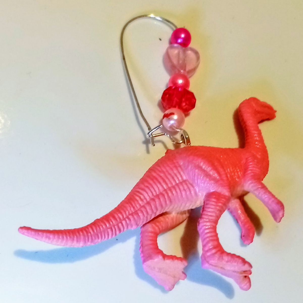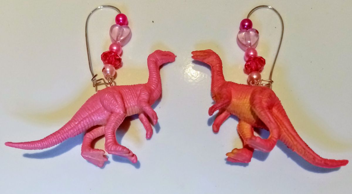 Ces boucles d’oreilles Vélociraptor confortables à porter ont été réalisées en détournant de véritables figurines de dinosaures miniatures faites de caoutchouc. Elles sont fixées grâce à des pitons argentés en acier inoxydable non allergénique , les dormeuses et les anneaux sont sans nickel non irritants et sont agrémentés de perles roses.