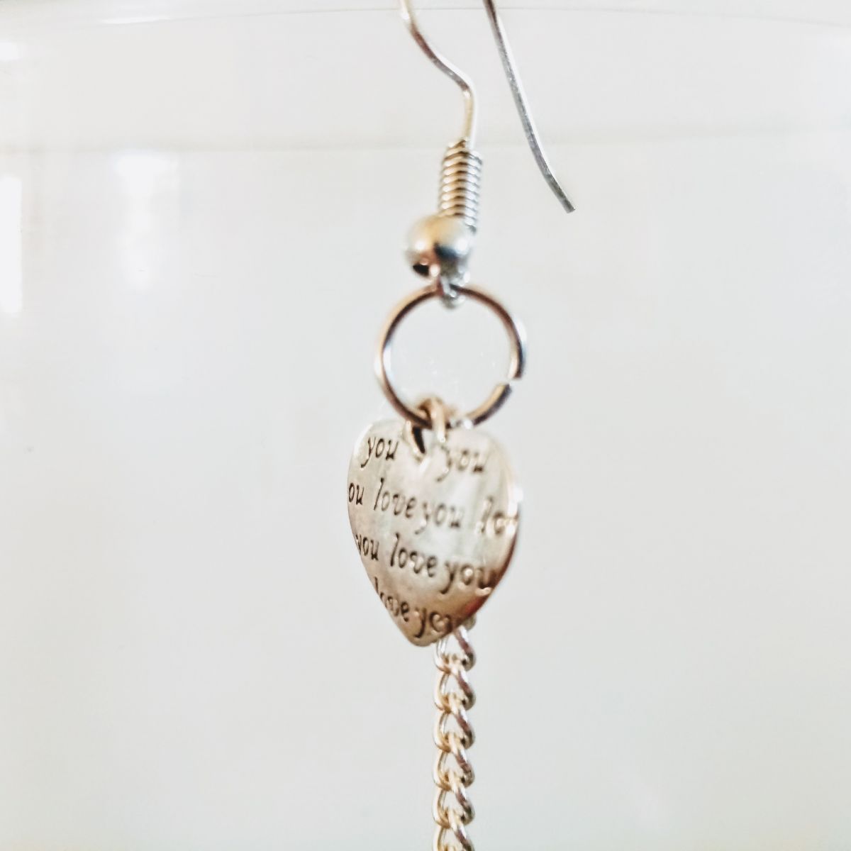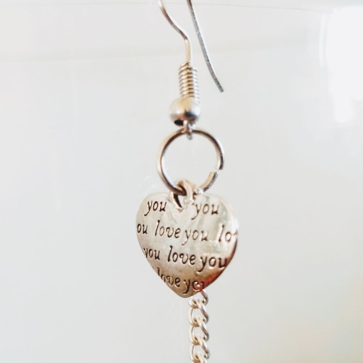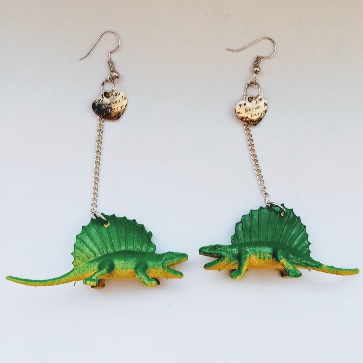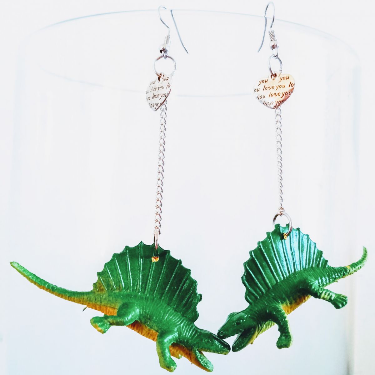 Ces boucles d’oreilles Spinosaurus confortables à porter, ont été réalisées en détournant de véritables figurines de dinosaures miniatures. Elles sont fixées grâce à des pitons. des crochets et des chaînettes argentés en acier inoxydable non allergénique. Elles sont agrémentées de cœurs argentés incrustés des mots "I love you".