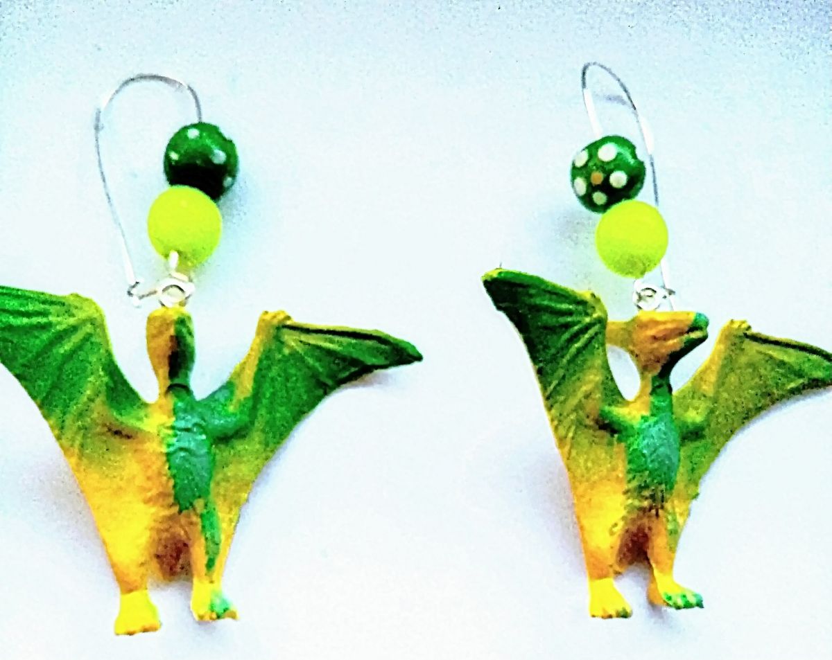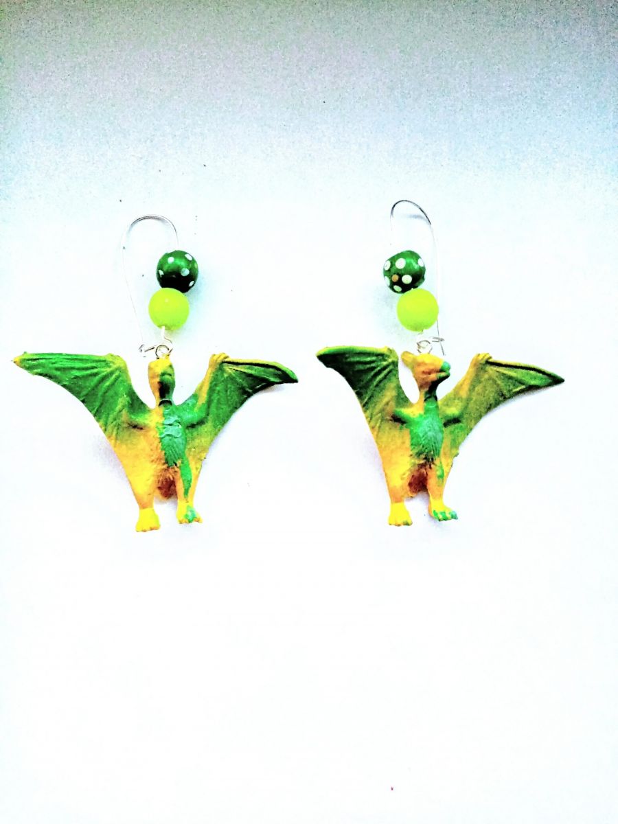 Ces boucles d’oreilles Ptérodactyle confortables à porter ont été réalisées en détournant de véritables figurines de dinosaures miniatures faites de caoutchouc. Elles sont fixées grâce à des pitons argentés en acier inoxydable non allergénique , les dormeuses et les anneaux sont sans nickel non irritants et sont agrémentés de perles vertes.