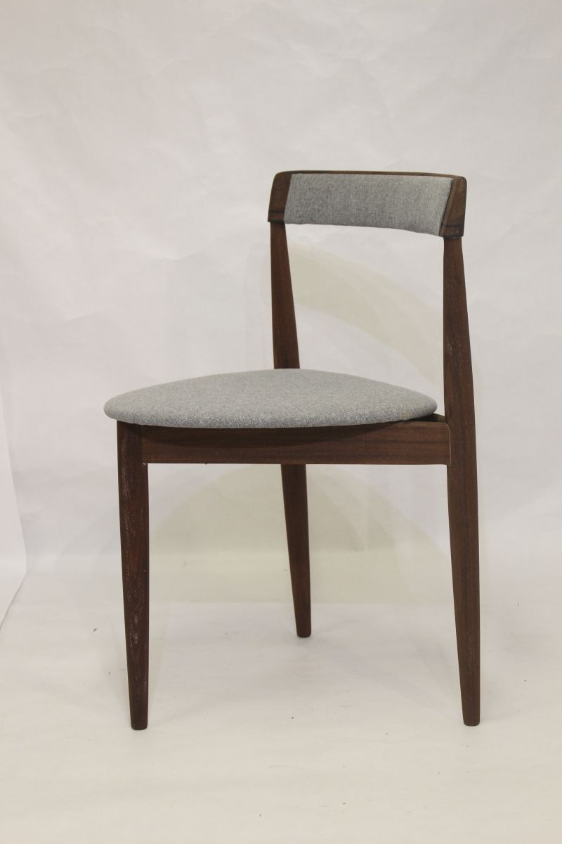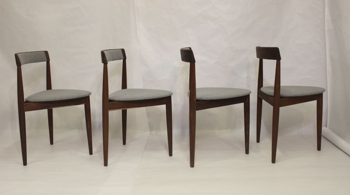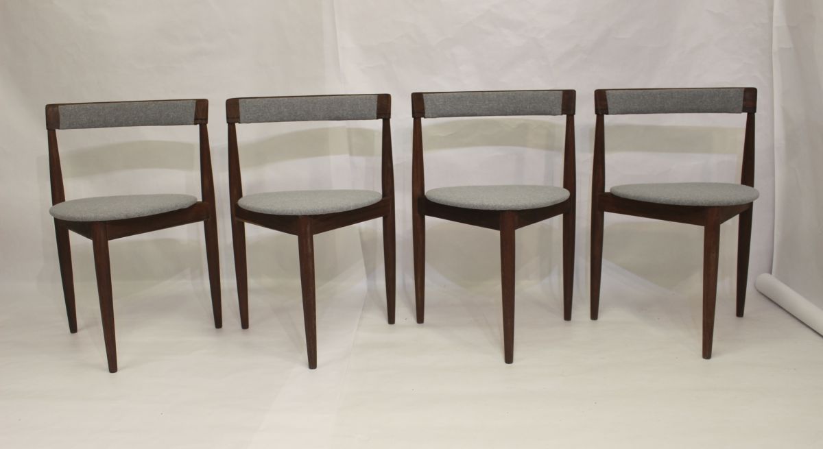 Lot de 4 chaises d'Hans Olsen (1912-1992) pour Frem Rojl Danemark. Suite de quatre chaises tripode, structure en teck, assise triangulaire garnie de tissu chiné bleu. Signature d'un cachet "fremjole made in Danemark"