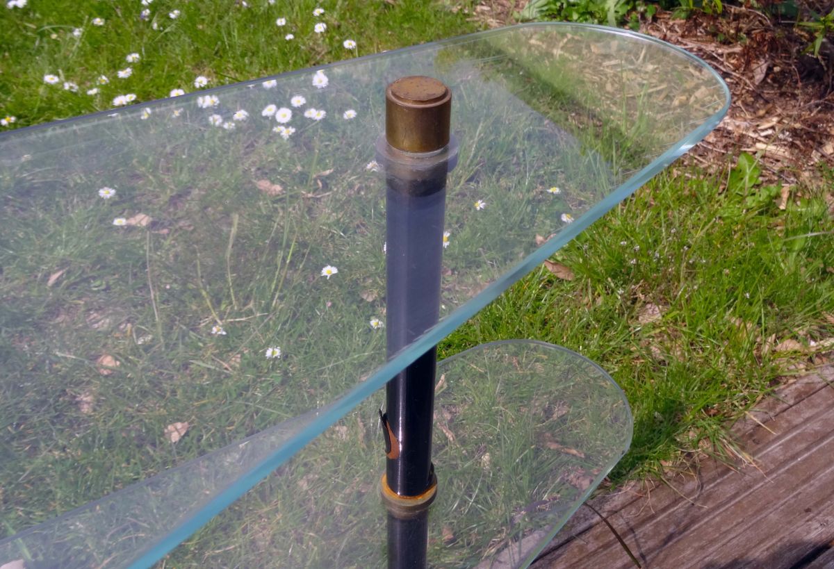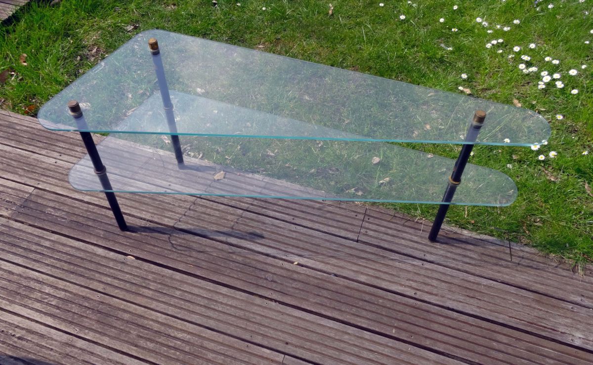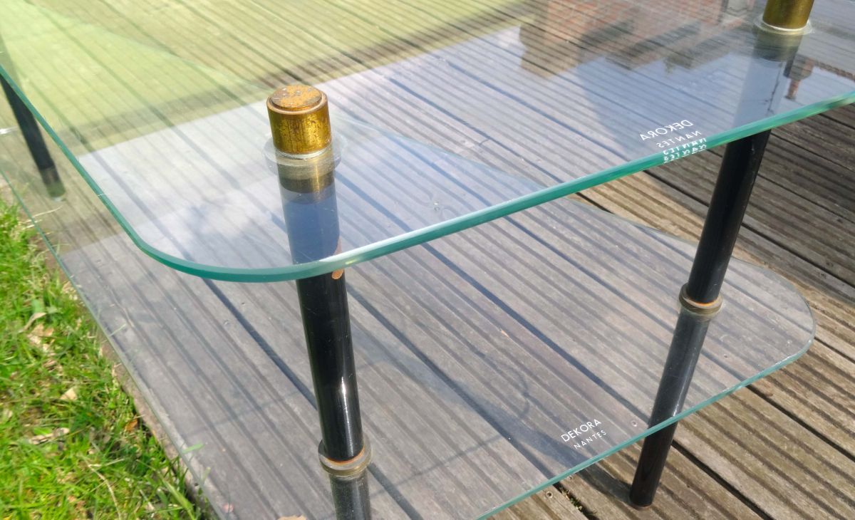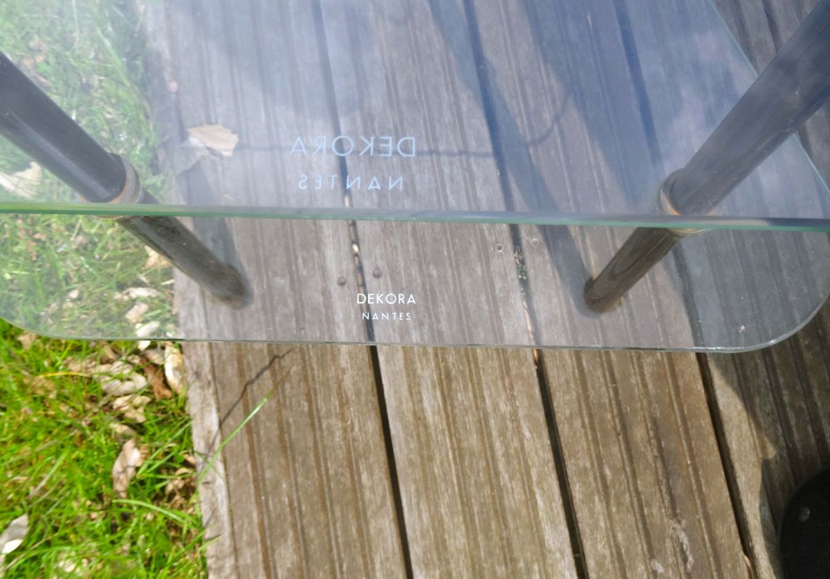 De forme triangulaire avec les angles arrondis, elle se compose de 2 plateaux en verre trempé (5 mm d’épaisseur) siglés DEKORA Nantes et de 3 pieds en métal laqué noir terminés par des embouts en laiton.