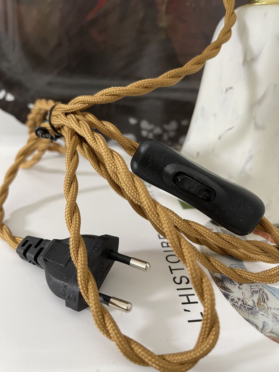Lampe baldeuse en verre de Clichy blanc électrifiée à neuf avec un câble électrique tissu torsadé marron caramel de deux mètres de longueur, une interrupteur et une fiche électrique de couleur noire.