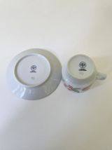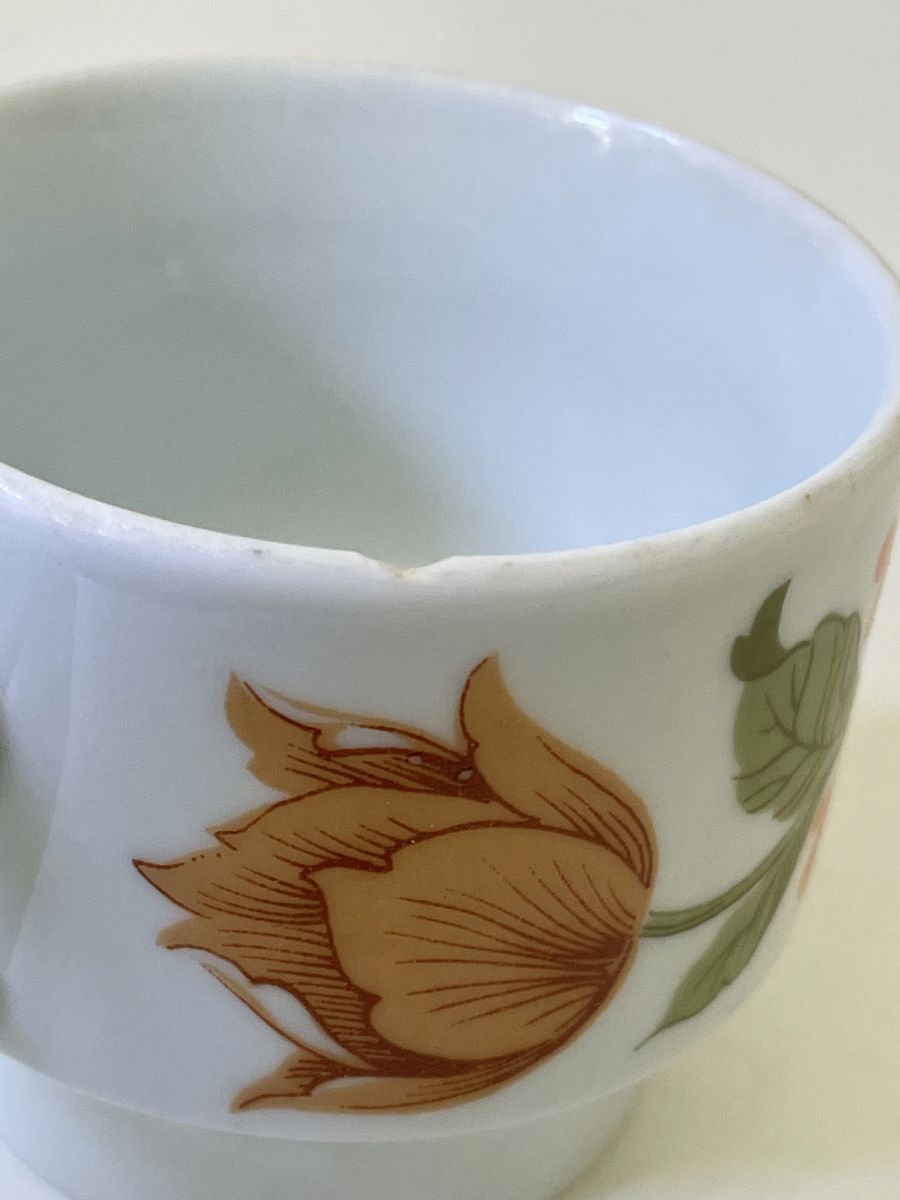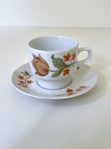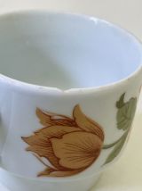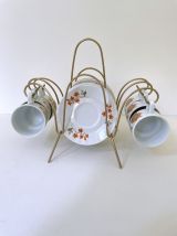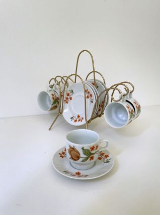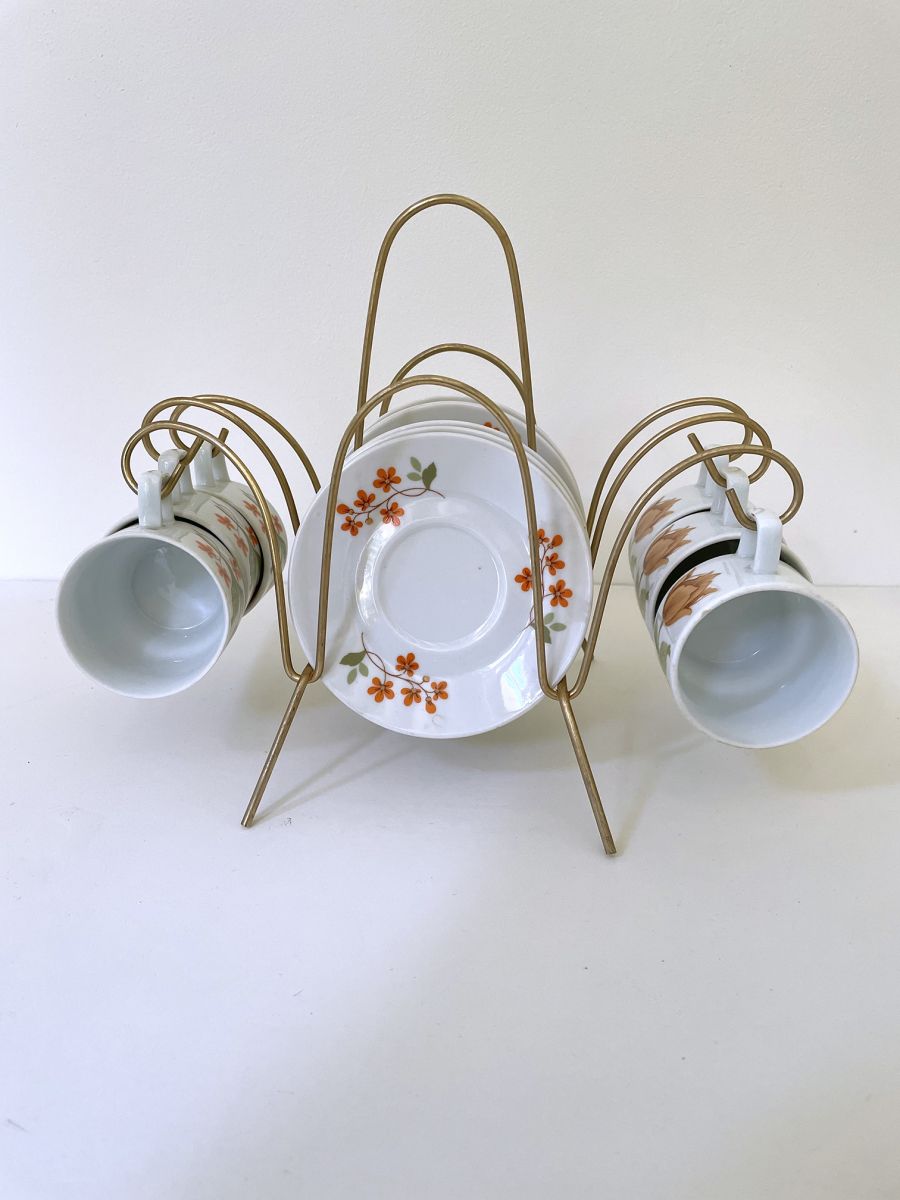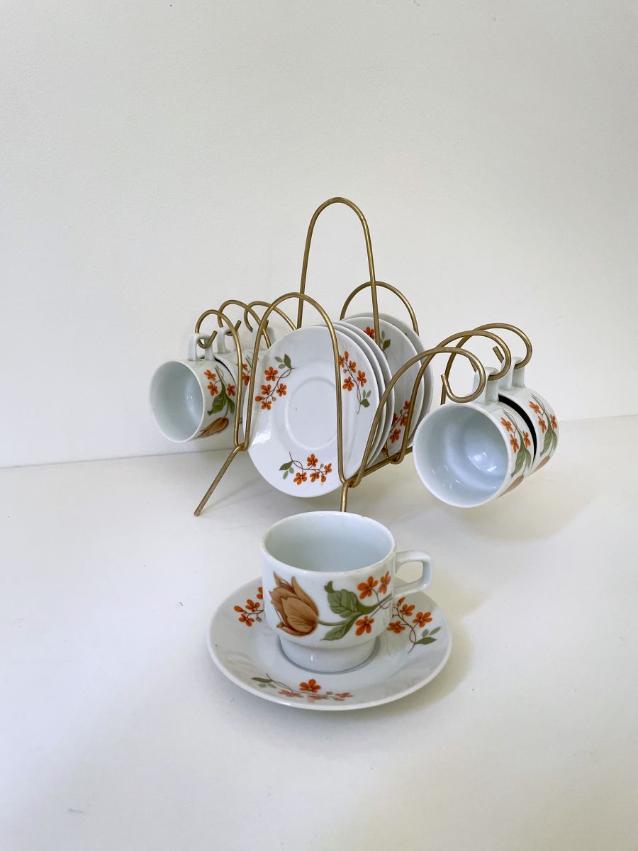 Service à café vintage années 70 en porcelaine, estampillé CP Colditz Made in GDR, comprenant 6 tasses et soucoupes + un support en laiton. Deux tasses sont un tout petit peu ébréchées (voir photo), mais c'est extrêmement discret, l'ensemble est en bon état.