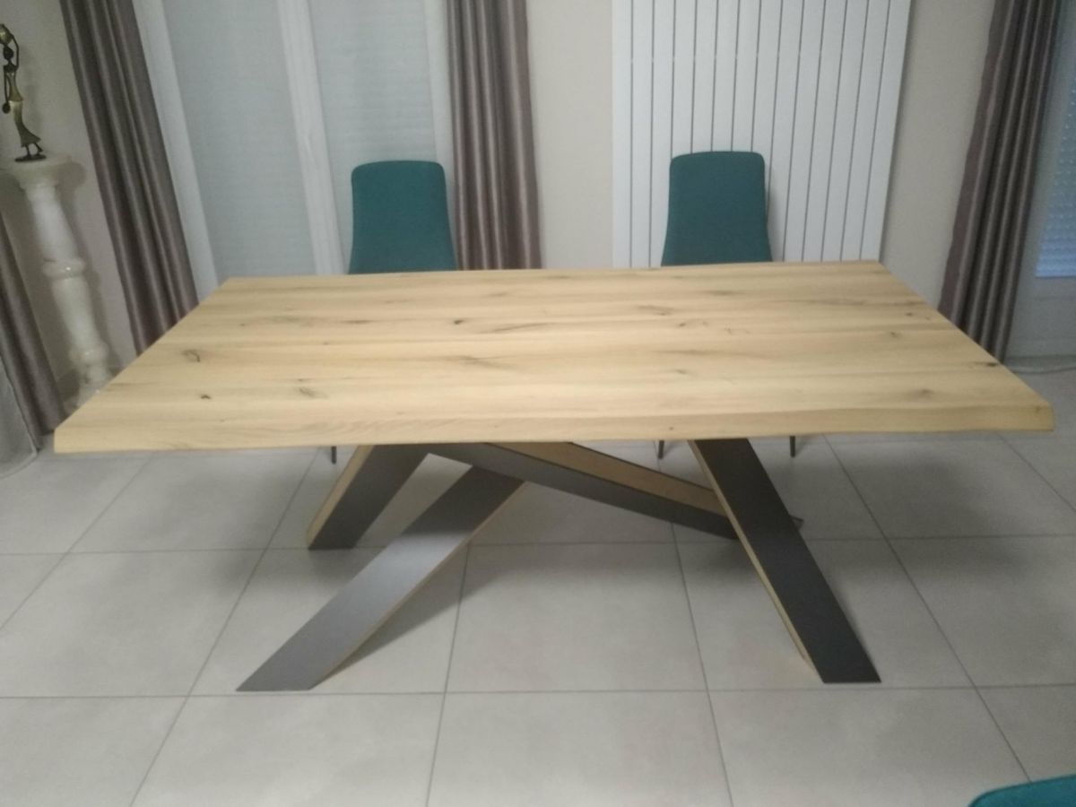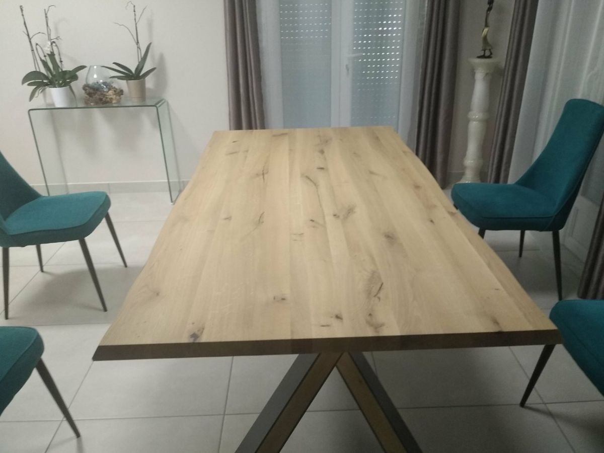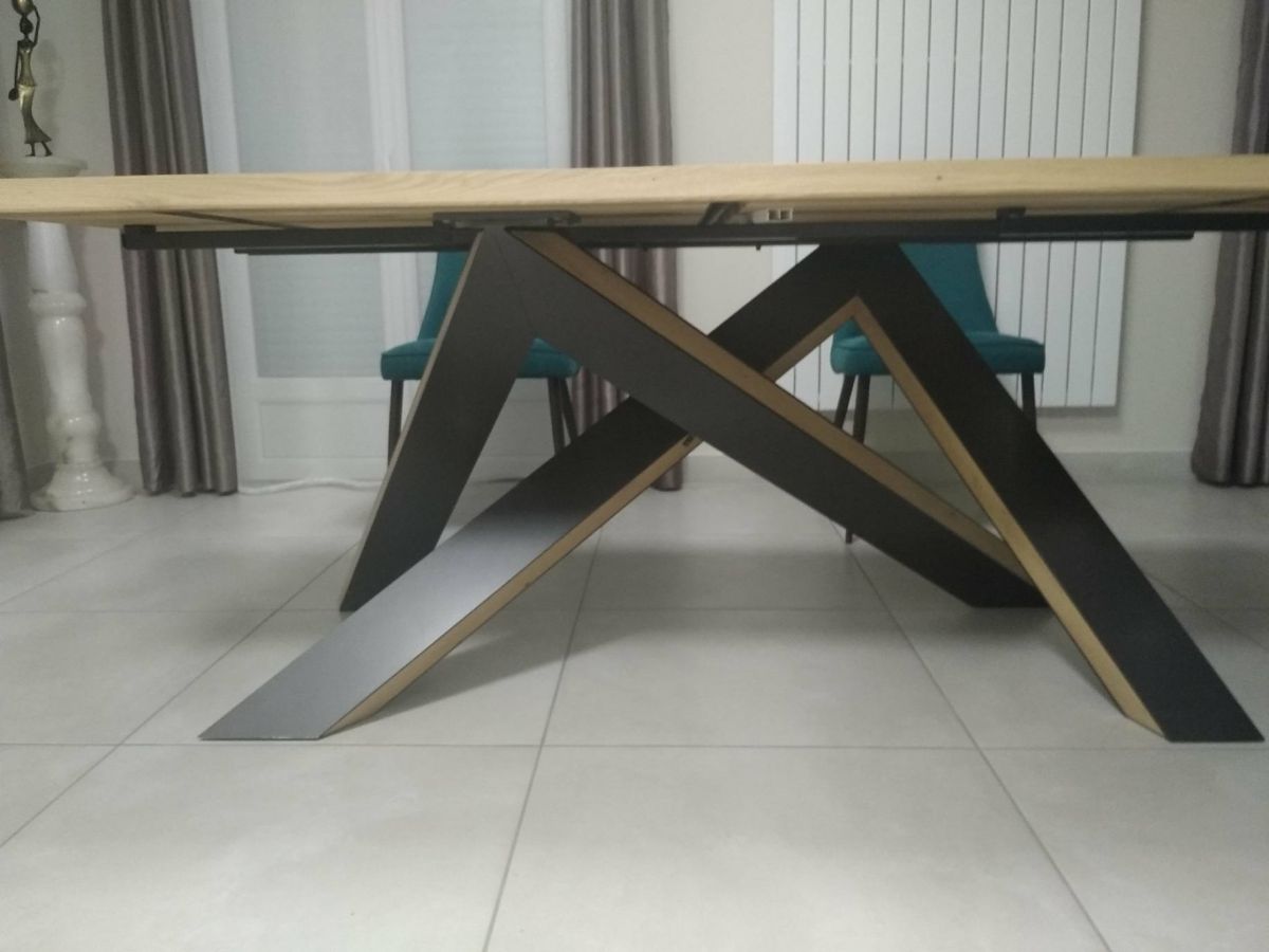 Vends pour cause de déménagement une table de salle à manger en chêne massif achetée chez Mobilier de France en mai 2020 (facture à l'appui), état neuf, pieds en format mikado métal et bois. Elle comprend également 2 allonges en bois massif de 0.45 de long. A venir retirer sur place.