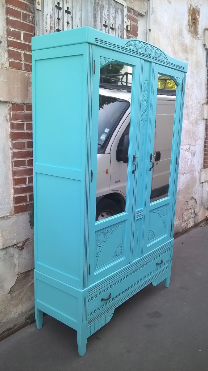 Grande armoire parisienne art déco. Elle a été poncé et repeinte en turquoise. Un coté penderie et coté étagère. Ouvrant a deux portes miroir avec fermeture a clé. Grand tiroir sur le bas. Elle est démontable, démontage remontage rapide. hauteur totale 205 cm. Longueur 126 cm. profondeur 45 cm.