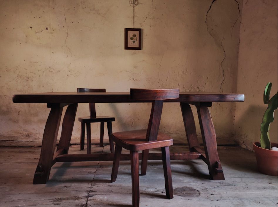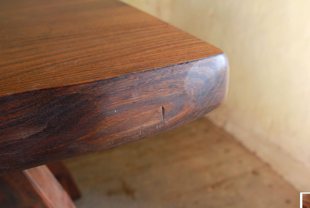 Edition: mikko nupponen. Orme massif. Plateau rectangulaire sculpté a bord irrégulier épaisseur 7cm. Pieds en angle fuseau, reliée par une traverse et croix. En trés bon état. Table de salle à manger "t" par olavi hänninen fin des années 50. Edition: mikko nupponen. Orme massif. Plateau rectangulaire sculpté a bord irrégulier épaisseur 7cm. Pieds en angle fuseau, reliée par une traverse et croix. En trés bon état. L1, 80 X l85cm X h77cm.