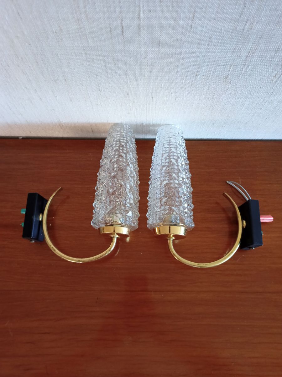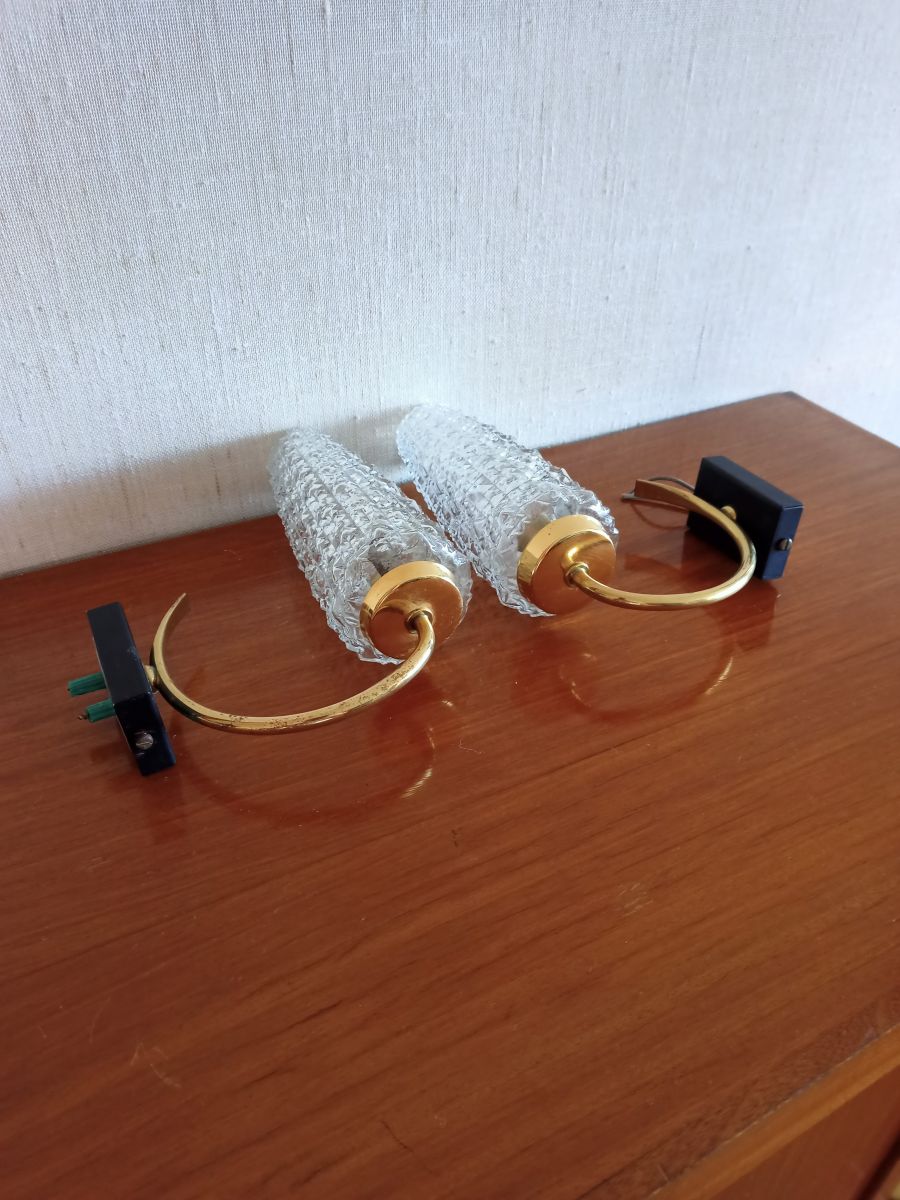 Magnifique paire d'appliques vintage en laiton. Globe en verre. Bon état, très légères traces d'oxydation sur la partie en laiton (voir photos) Système de branchement vendu en l'état. Idéal pour déco vintage.