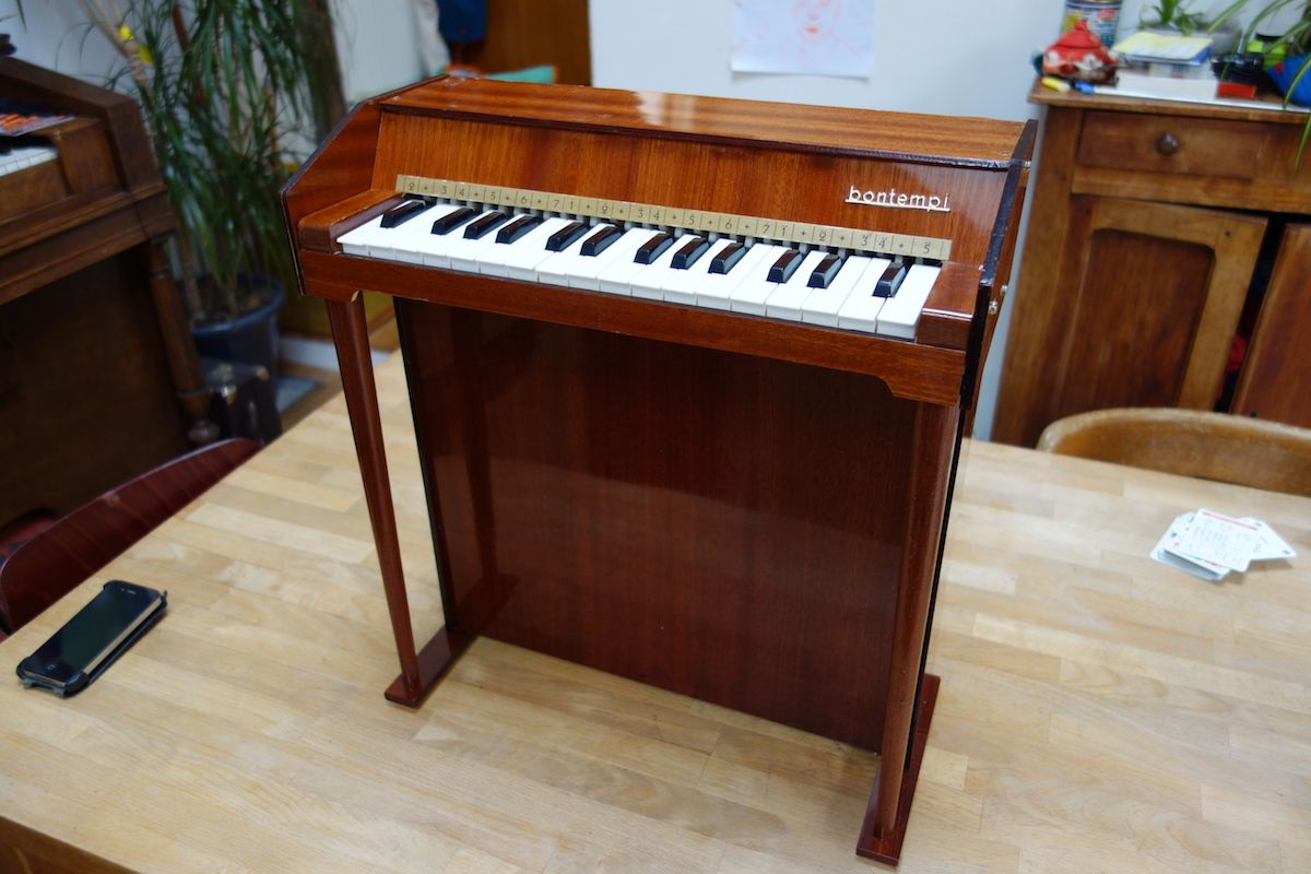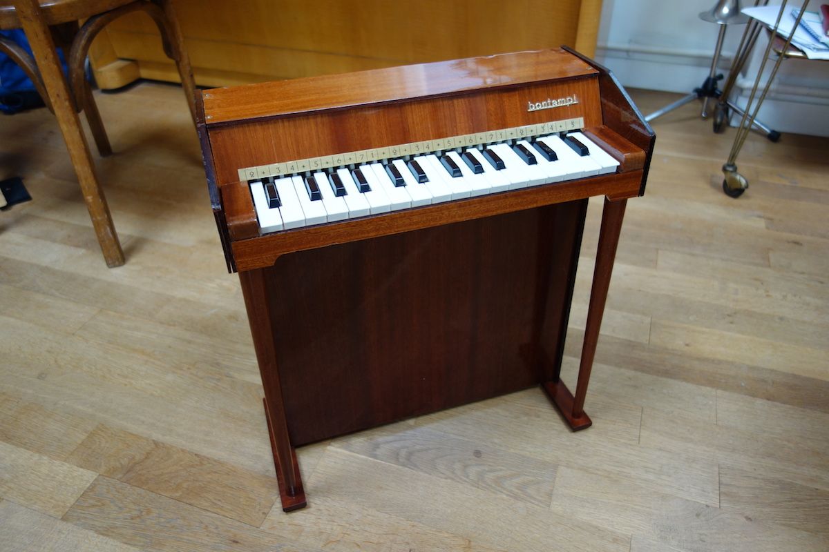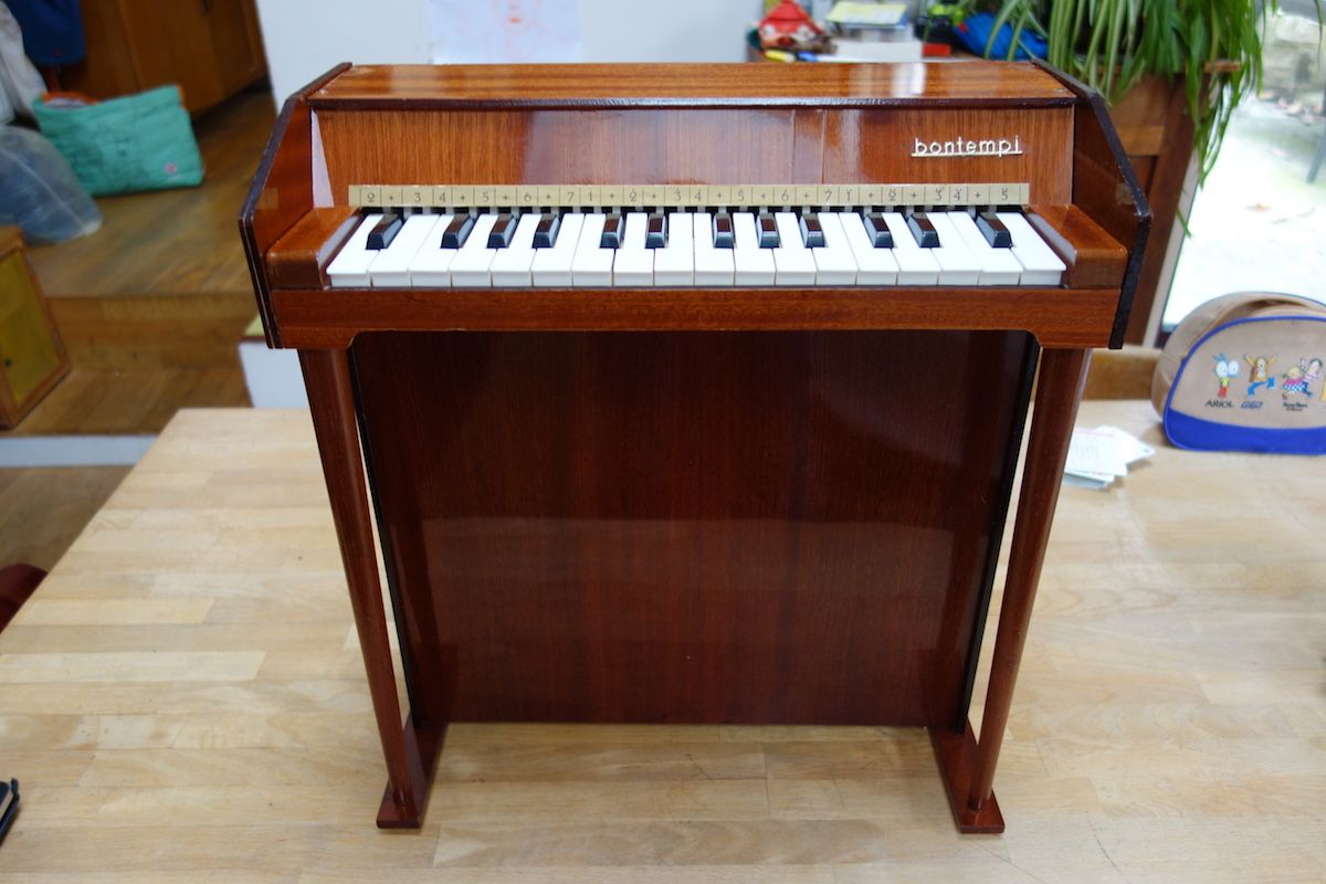 Piano jouet vintage fabrication italienne, plaqué acajou. Probablement début années 70 (après rachat du brevet michelsonne par Bontempi)