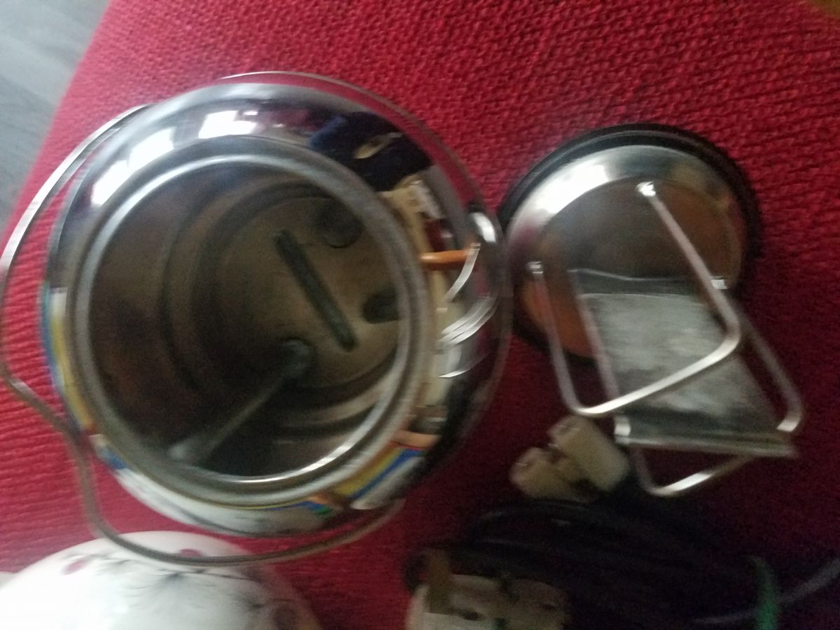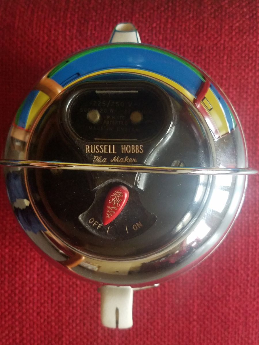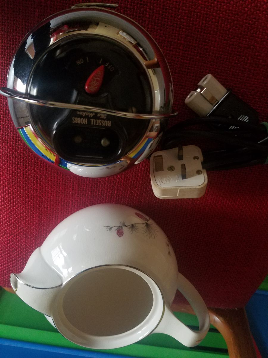 RARE! Electric tea pot (Tea maker), de la fameuse marque Anglaise Russell Hobbs. Tea pot en parfait état de fonctionnement et le pot en porcelaine ancienne également. Objet fonctionnel et très décoratif mais aussi emblème des foyers britanniques des années 60's...