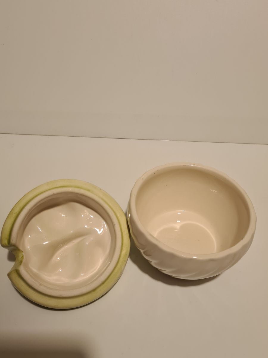 Sucrier céramique décor à la barbotine prunes, sans marque en excellent état, sans fêle Dimensions : H. 10cm X L. 10cm X P. 10cm X 320g