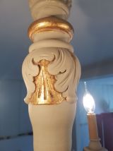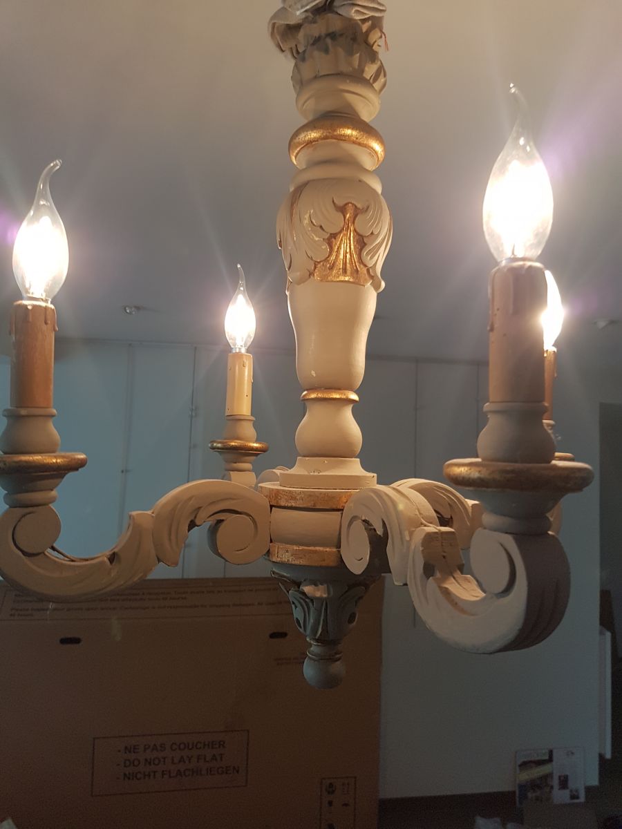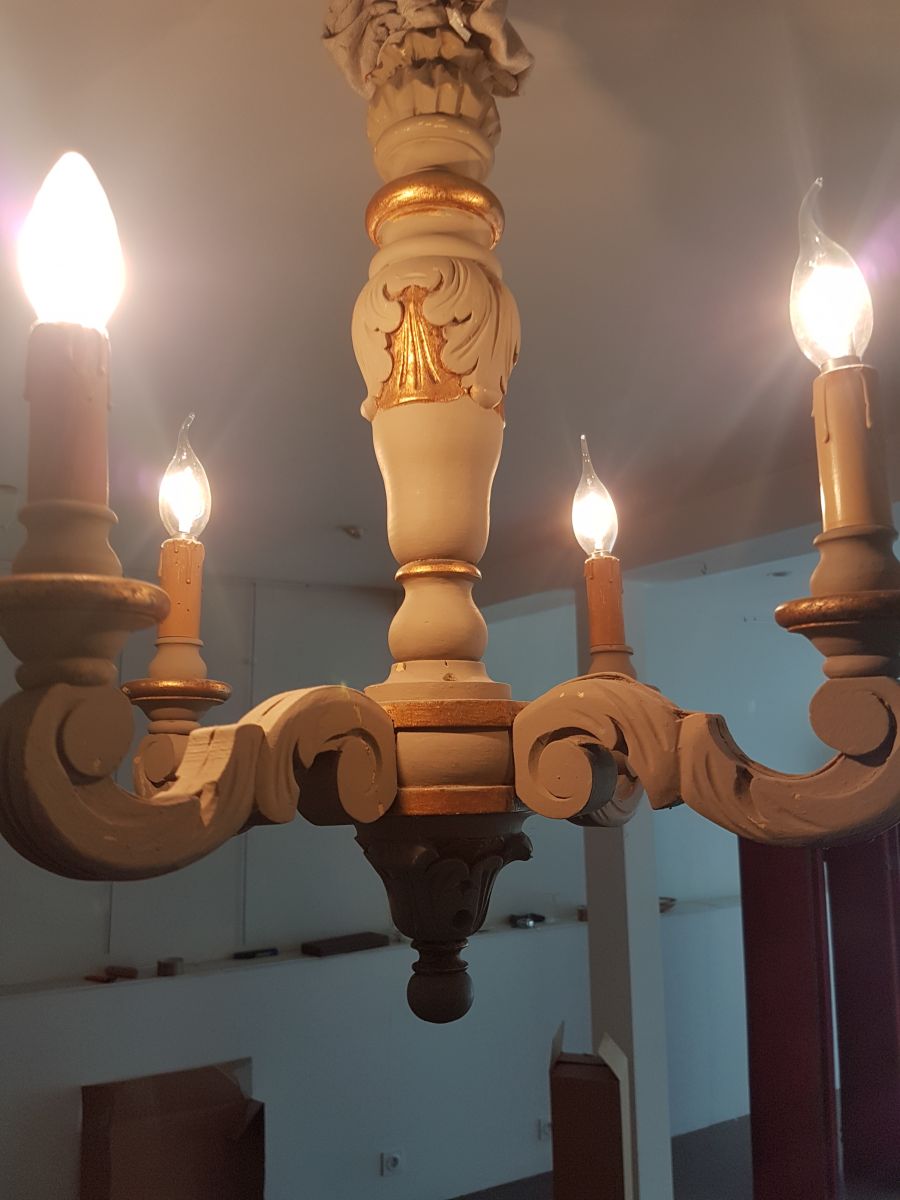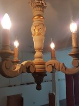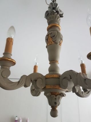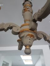 Lustre en bois peint en taupe et doré,installation electrique refaite à neuf. 4 lumieres.