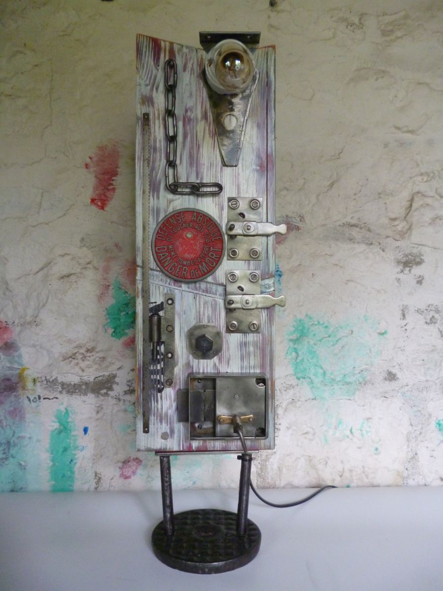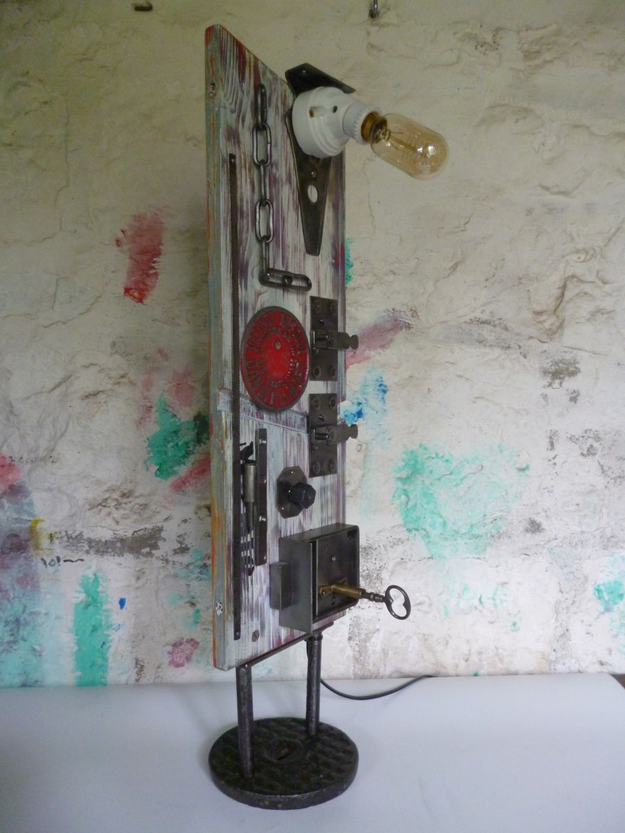 Lampe au design industriel realisee avec divers objets de recuperation . ( planche , gond , lame de scie , chaine , support ampoule en porcelaine , ect , ect .... ) .