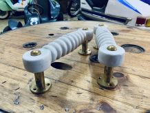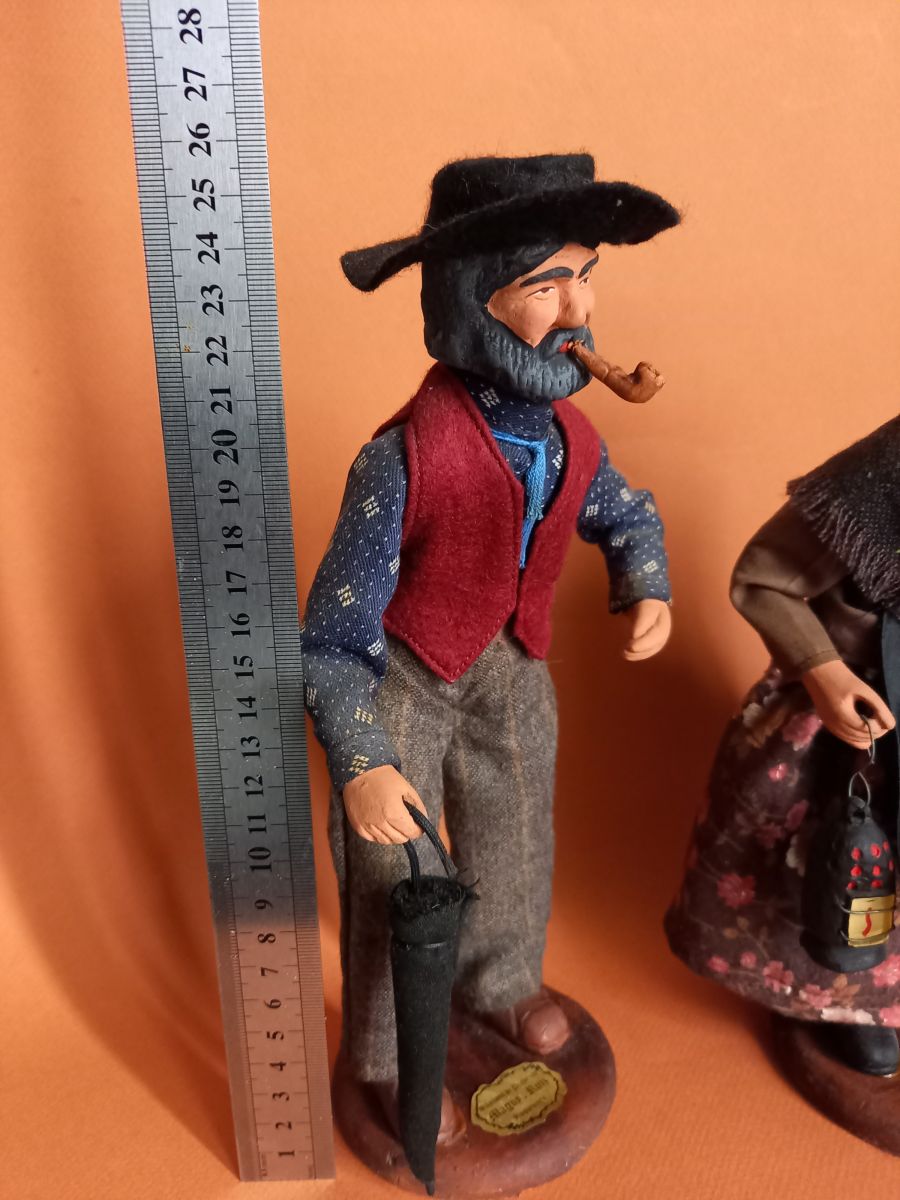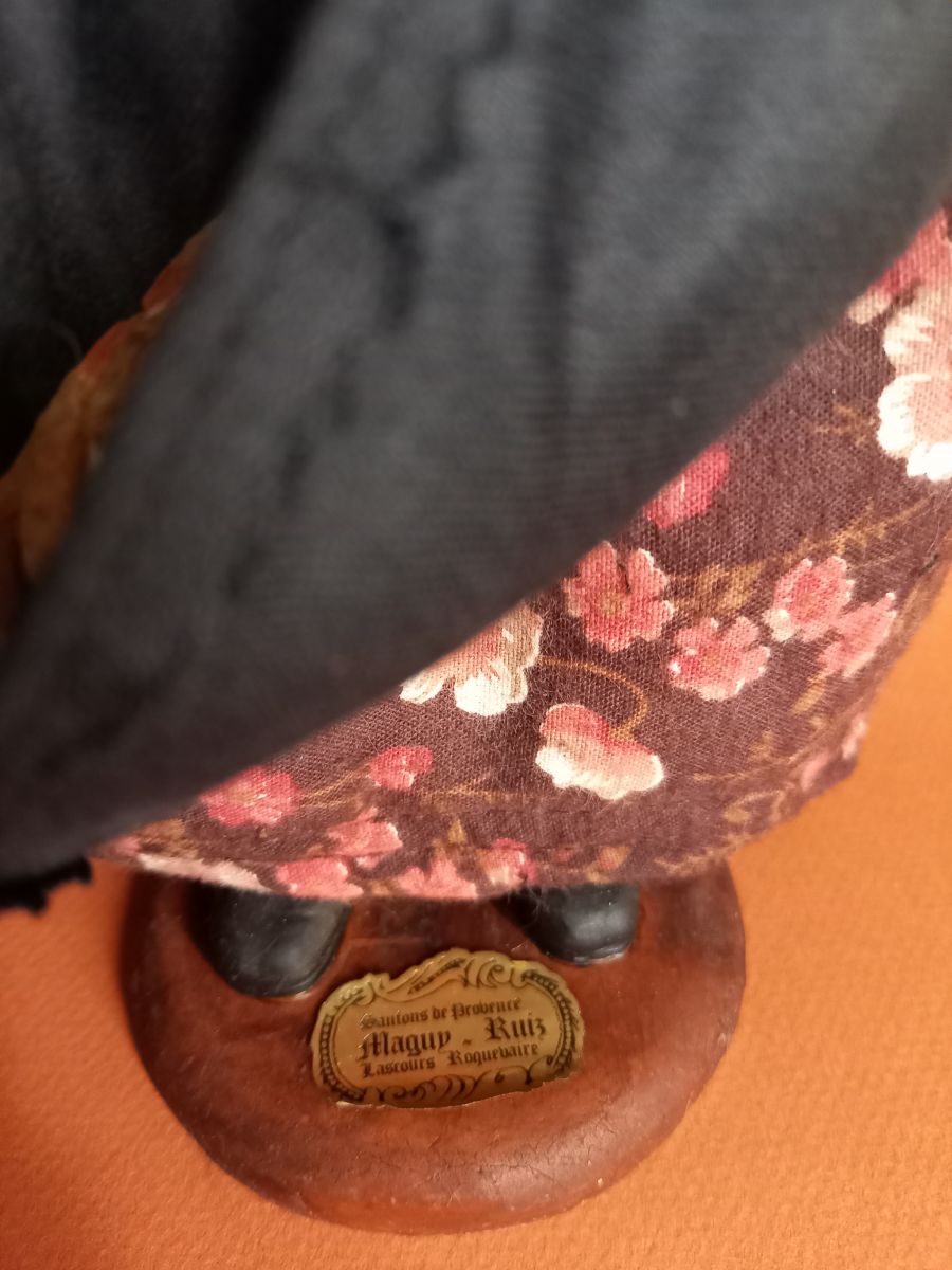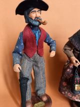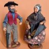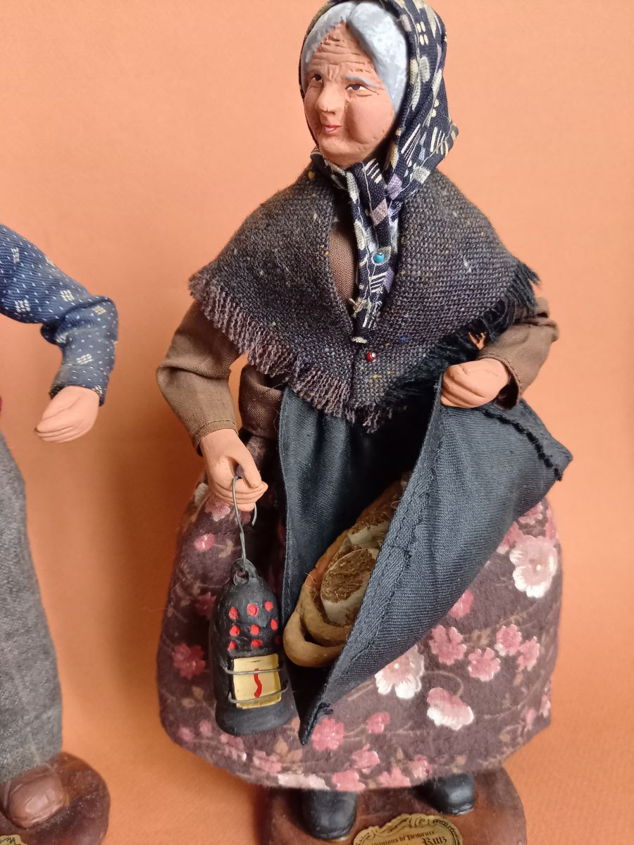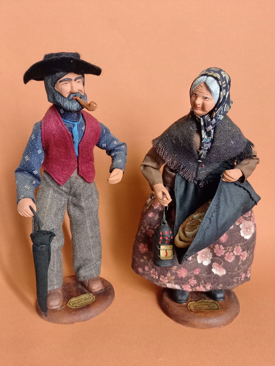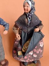 Je vous propose ces deux anciens santons provençaux en terre cuite de 25cm. Les bras sont mobiles. Les visages sont admirables. Il manque juste une anse au panier de la fromagère qui ne se voit pas ou peu. Tissus de belle qualité !