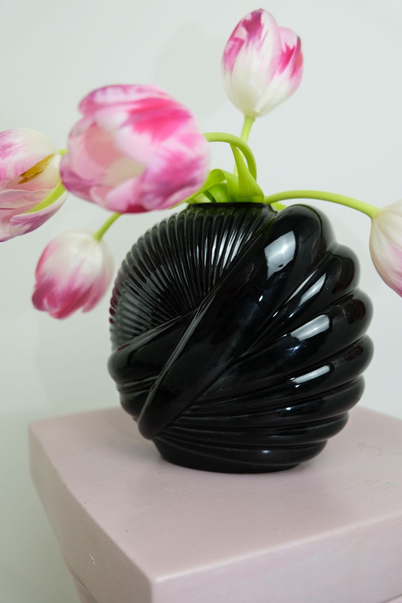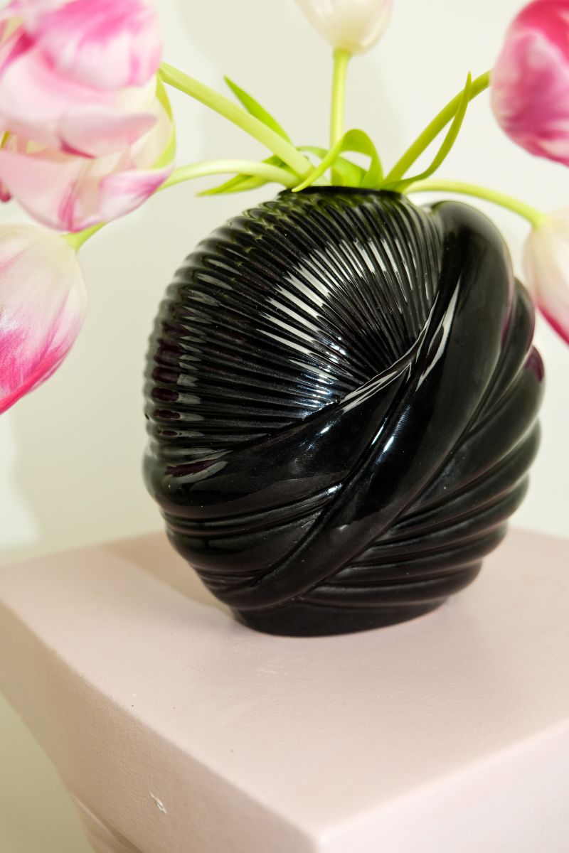 Magnifique vase rond noir, style Hollywood Regency avec stries. Date des années 80. En parfait état.