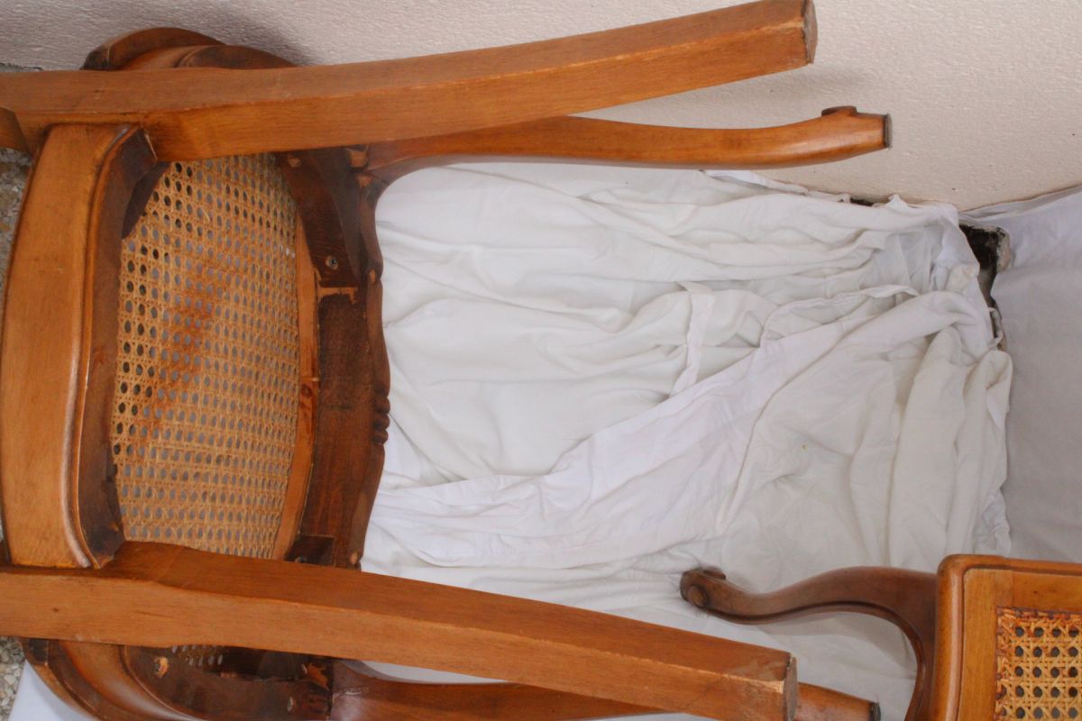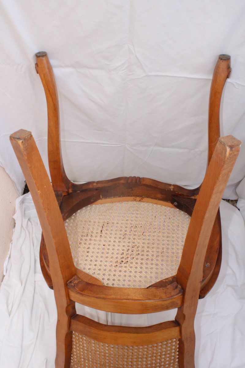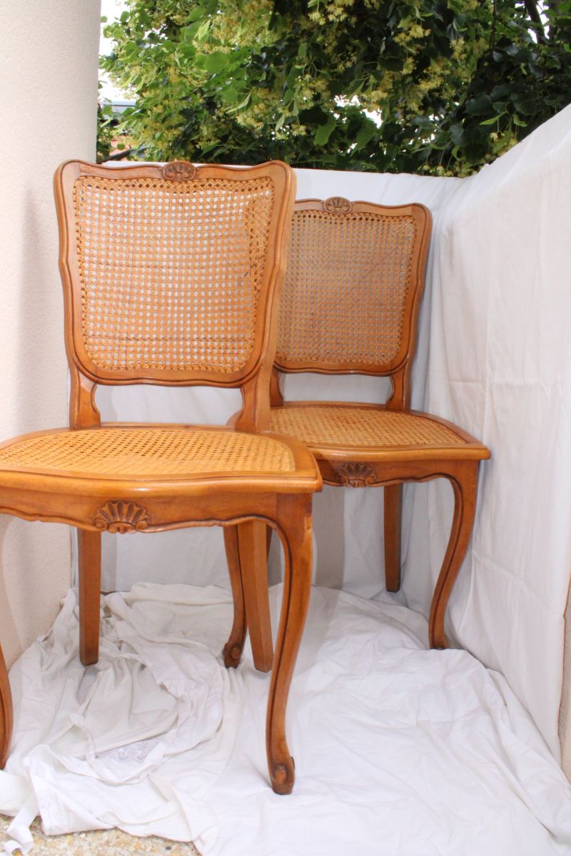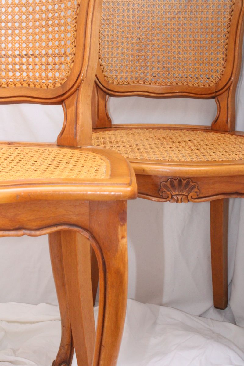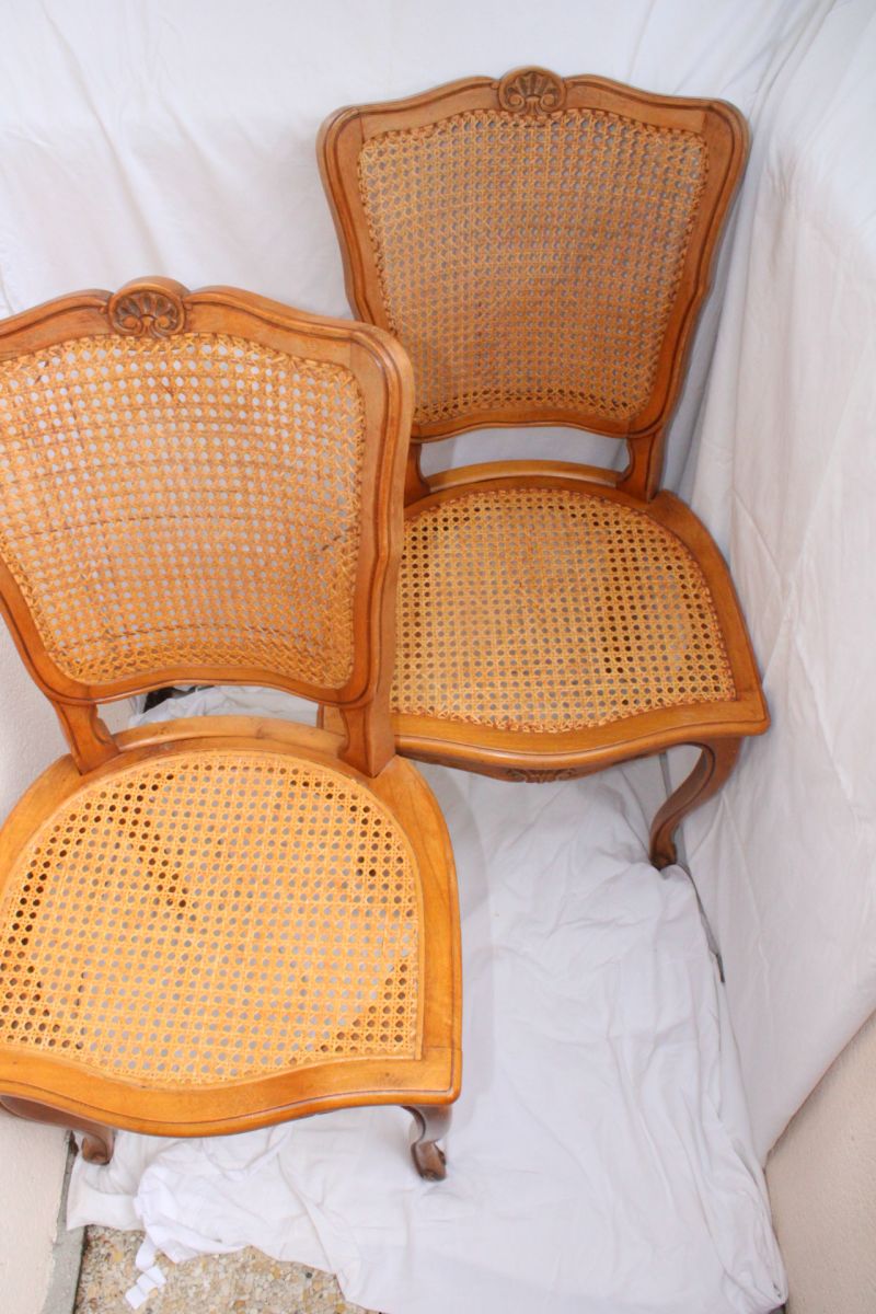 Chaises anciennes Louis XV appelée coquille de pieds cambrés en chêne claire. Le cannage de l'assise fut refait à neuf il y a un an. Le bois de l'envers de l'assise est très ancien. Cependant il n'y a pas de signature.