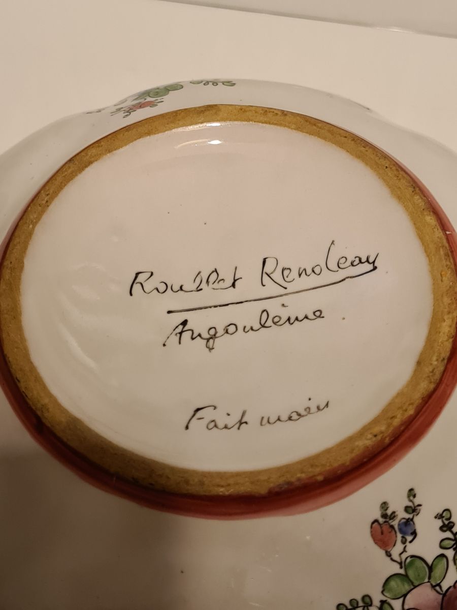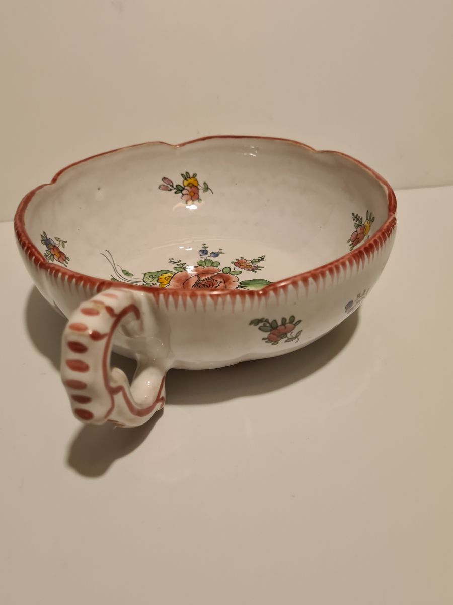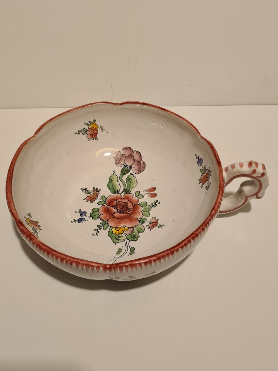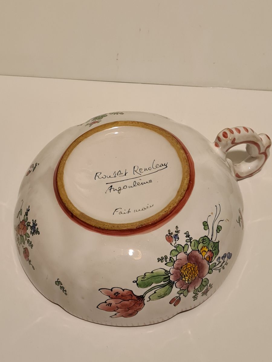 Coupe à anse en faïence d'Angoulème Roullet Renoleau au décor floral en excellent état, sans fêle Dimensions : H. 6,5cm X L. 19cm X P. 15cm X 418g