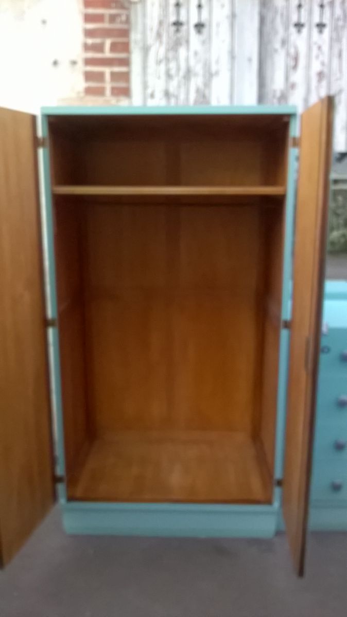 Armoire commode asymétrique mint. Elle a été entièrement poncé et repeint en vert Mint. Quatre grand tiroirs, un miroir qui peu être enlevé. Quelque marque du temps sur le miroir. Coté armoire une étagère penderie. Le meuble est en deux parti, montage quatre vis. Fermeture a clé fonctionnel.