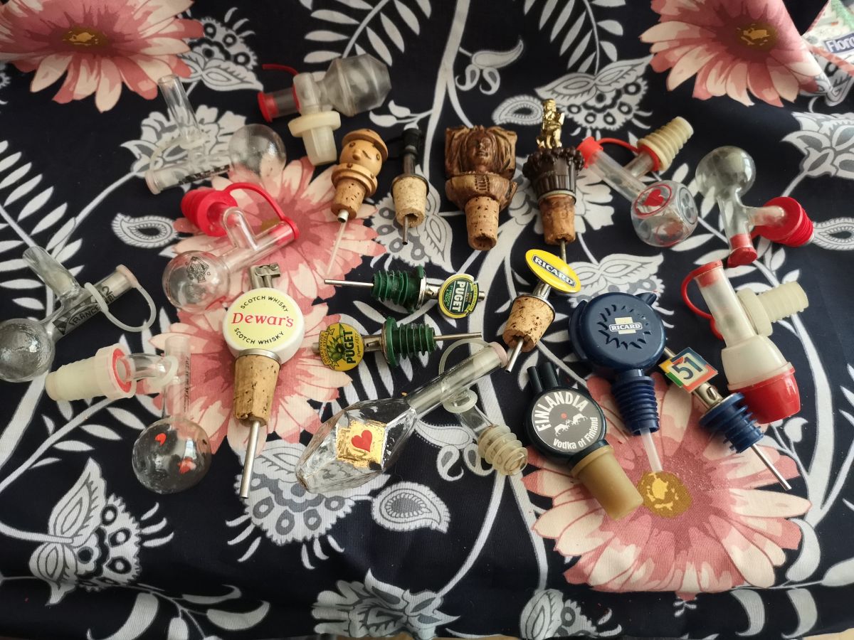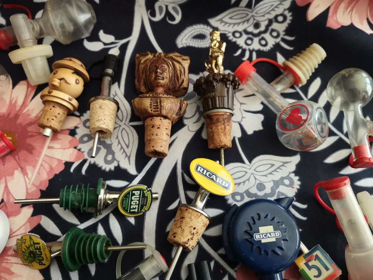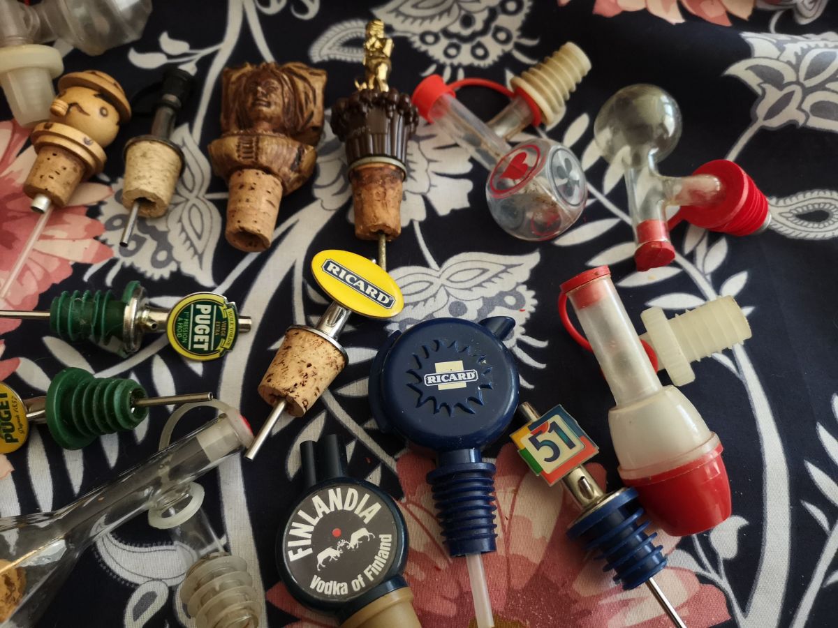 gros lot de bec verseurs boissons de bistrot verre plastique métal bouchon lot en très bon état .