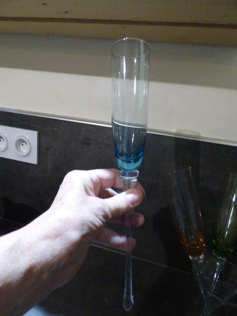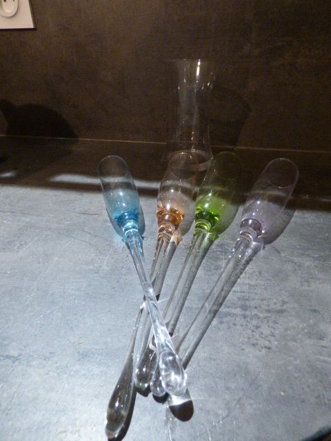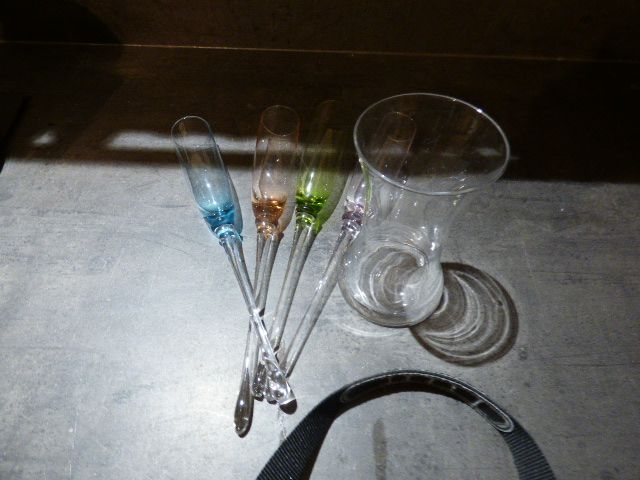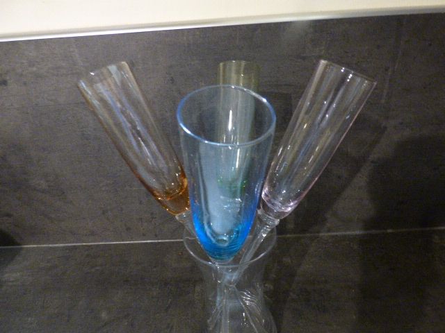 4 coupes à Champagne neuves de couleur irisée. Dans un support en verre. Original date des années 60.