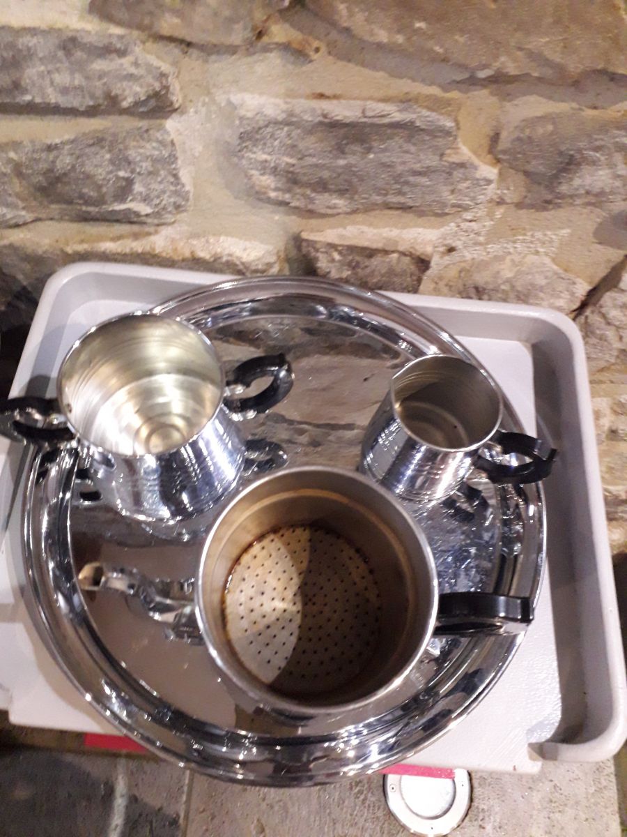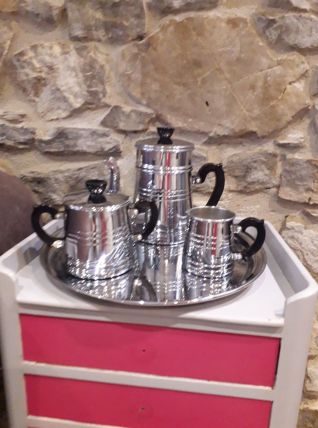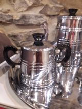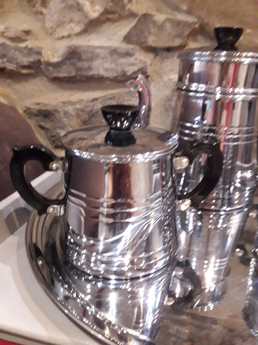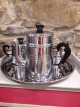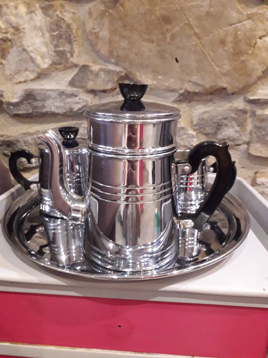 Très beau service de 4 pièces en cuivre chromé et bakélite de la marque Menesa comprenant la cafetière avec filtre, le sucrier, le pot à lait et le plateau en miroir.
