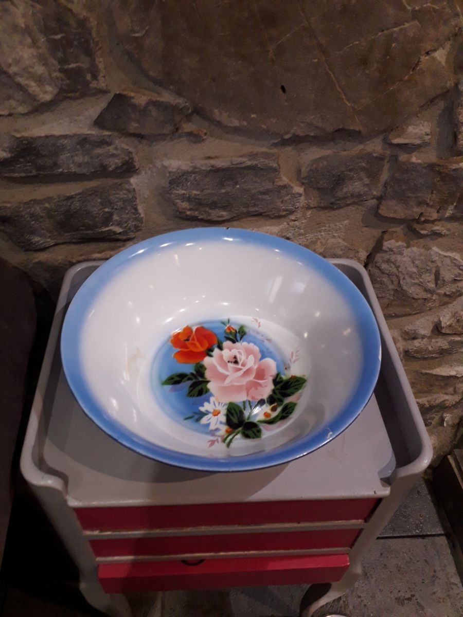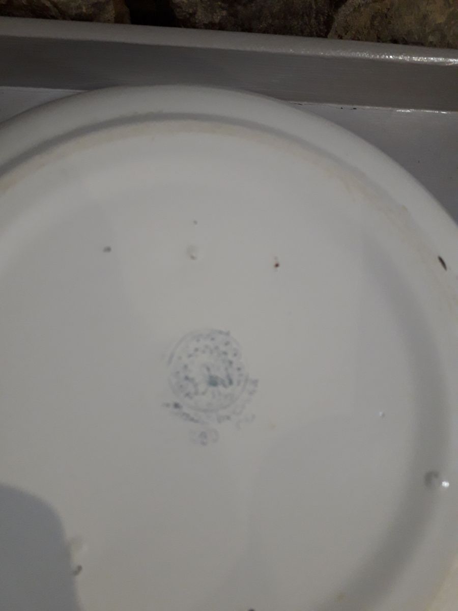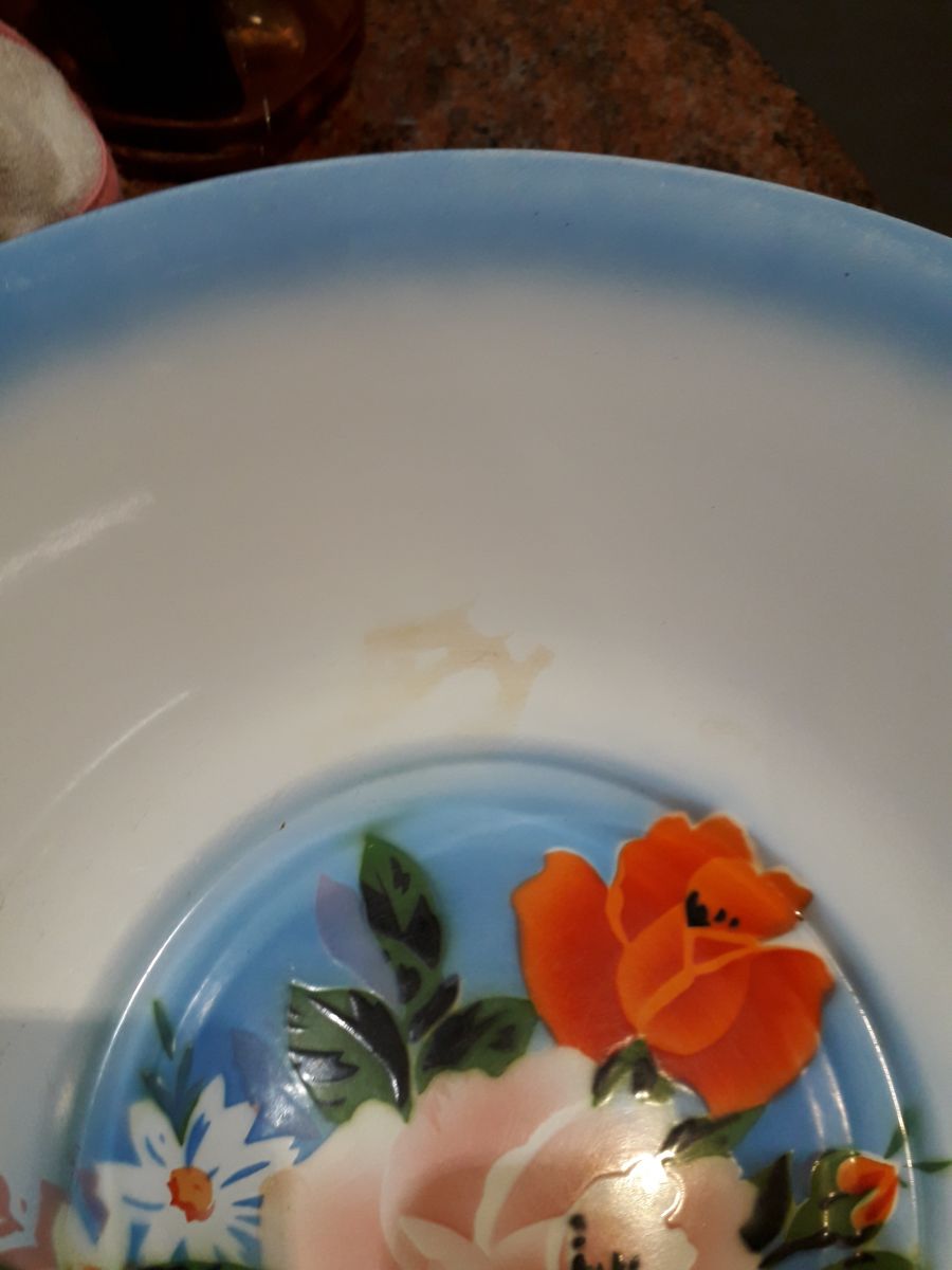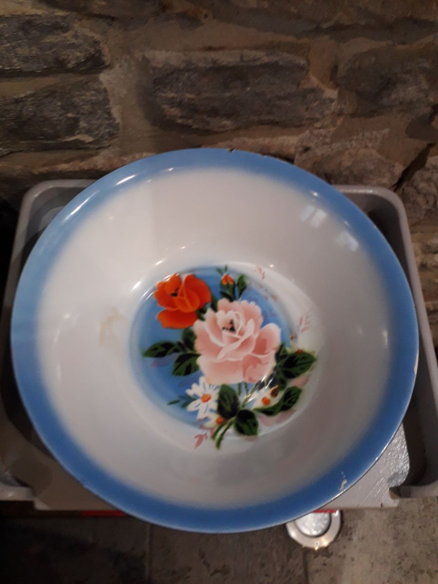 En bon état vu son grand âge ( quelques traces sur le dessous, et sur les bords, 1 tâche à l'intérieur voir photos). Extérieur blanc, intérieur liseré bleu, motifs roses.