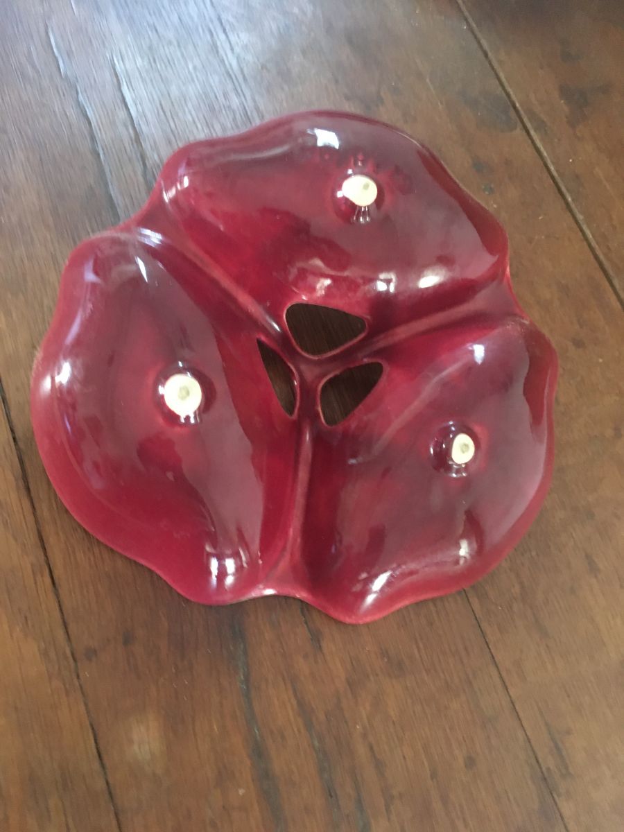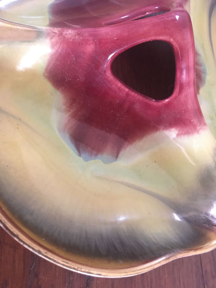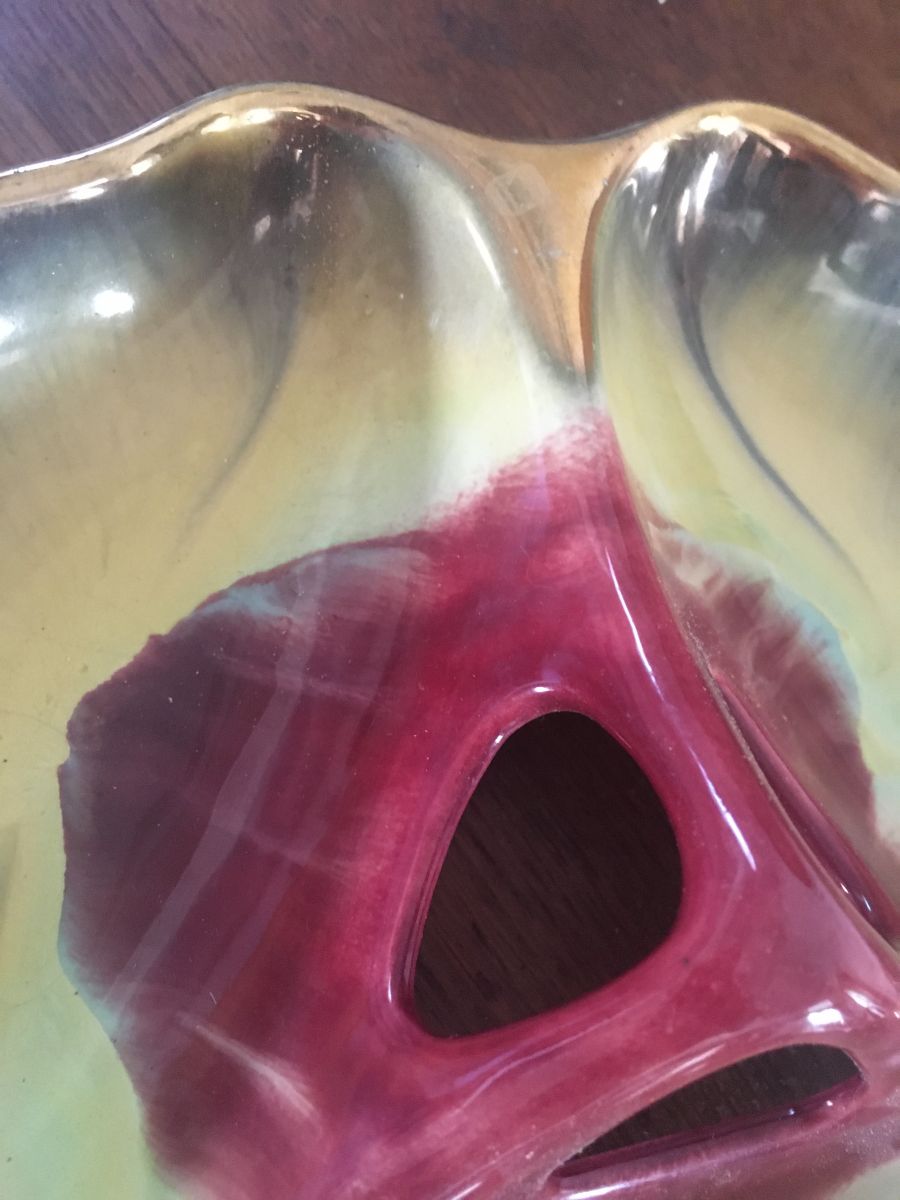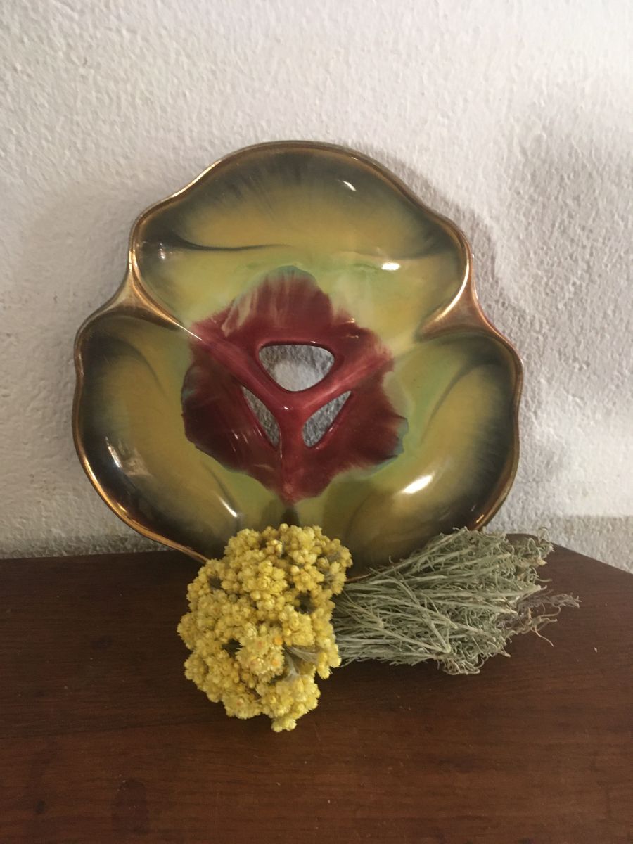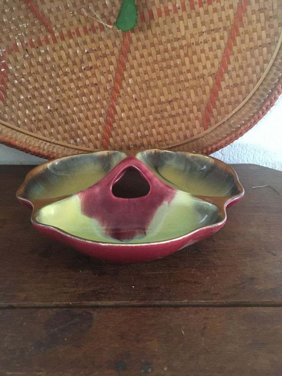 Plat serviteur vintage à la forme de feuille.Il se compose de 3 compartiments ourlés de doré.