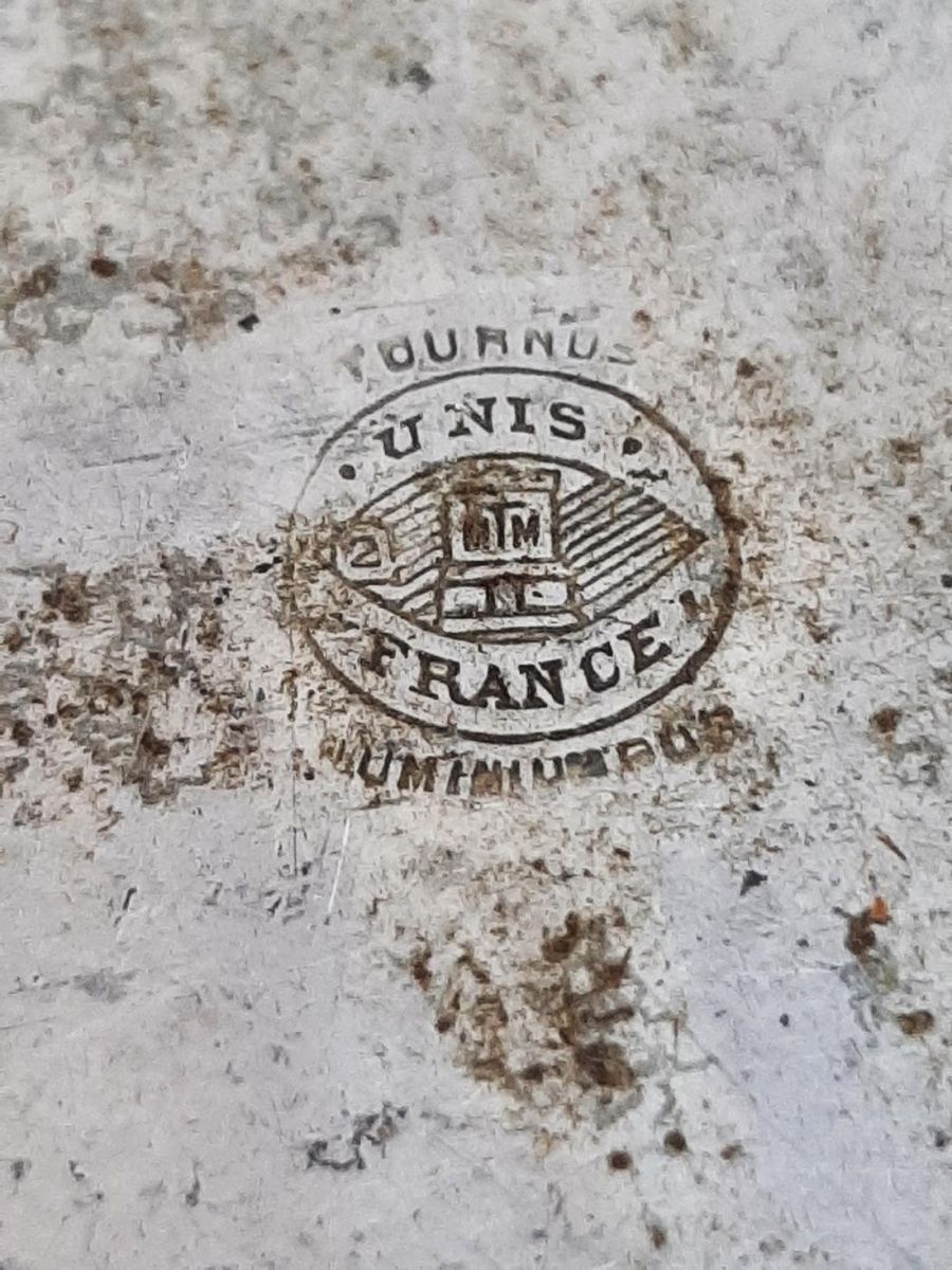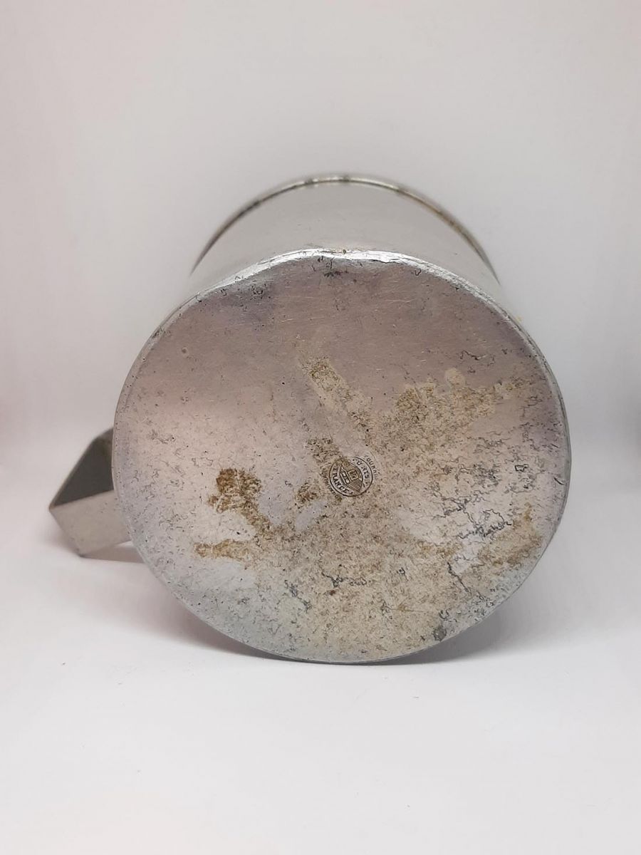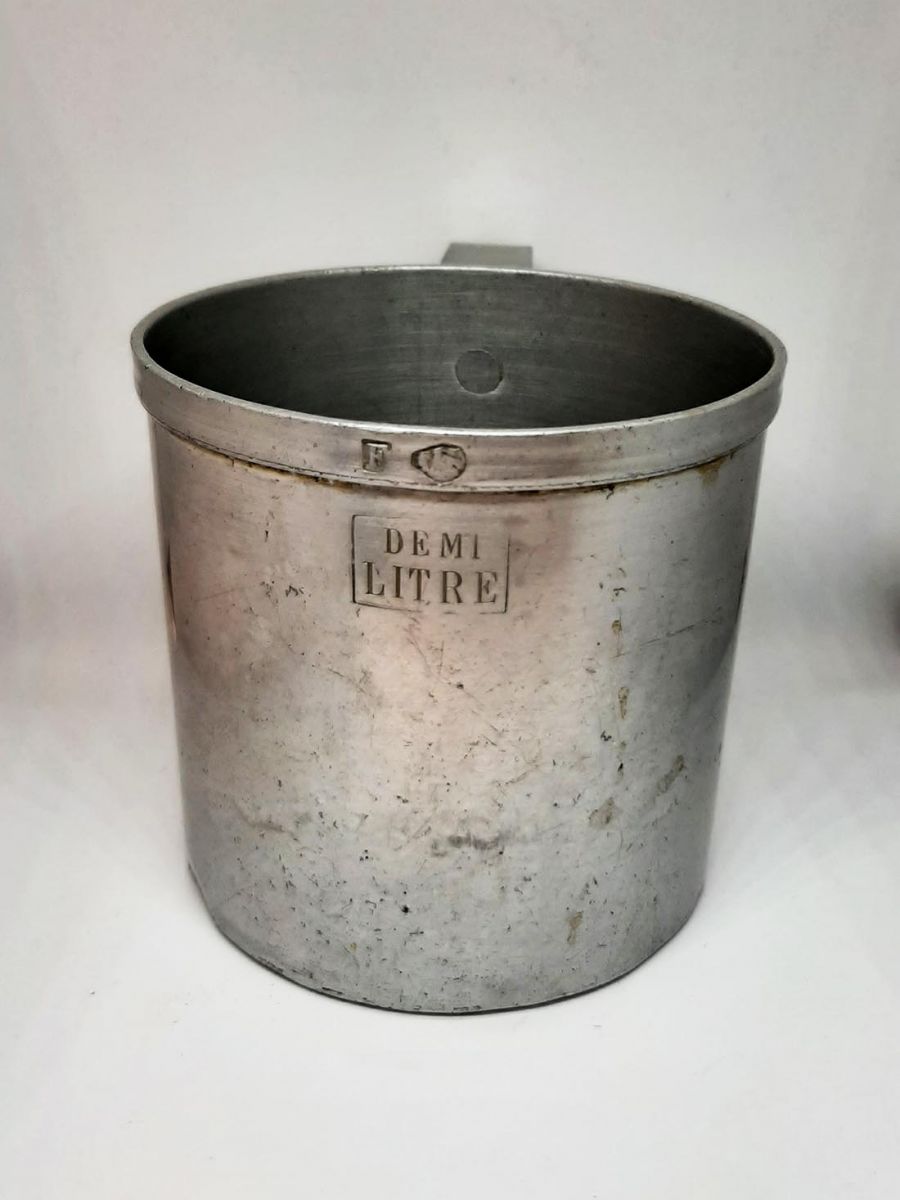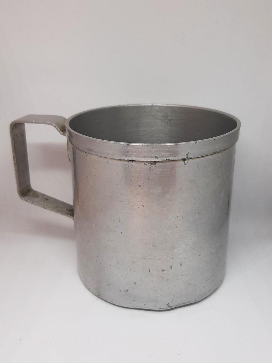 Tasse de l'armée en aluminium pur de marque "Tournus". Elle peut contenir 1/2 litre d'eau. Marquage en dessous du gobelet le logo "Unis France" de la marque "Tournus". Objet de collection.