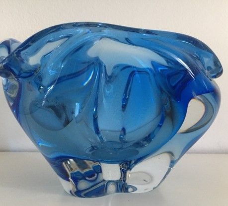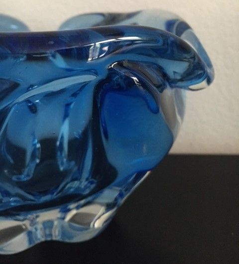 Les verriers de Murano sont réputés par leur technique à créer des couches de différentes couleurs à partir du verre fondu.La Verrerie est massive (1 cm epaiiseur), translucide et doublée d’un bleu océan profond. Cette pièce a été fabriquée de manière artisanale.