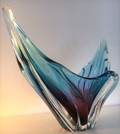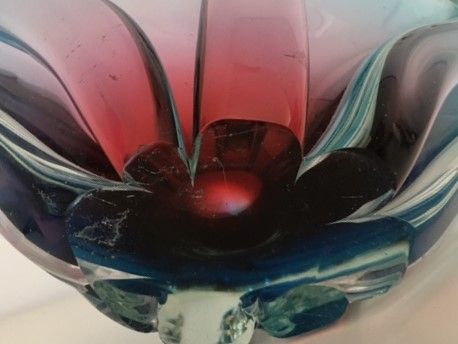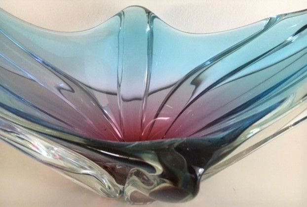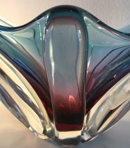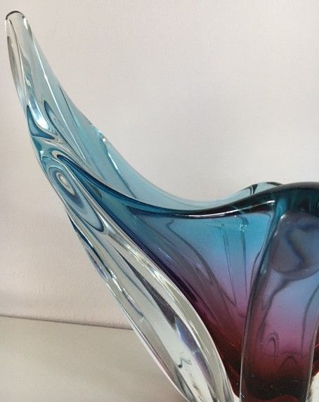 Les verriers de Murano sont réputés par leur technique à créer des couches de différentes couleurs à partir du verre fondu.La Verrerie est massive (1 cm epaiiseur), translucide et doublée d’un bleu turquoise sur la partie haute (2/3 environ) et d’un rose parme sur le bas (1/§3 environ) et d’un rose parme. Cette pièce a été fabriquée de manière artisanale et date des années 1960 environ