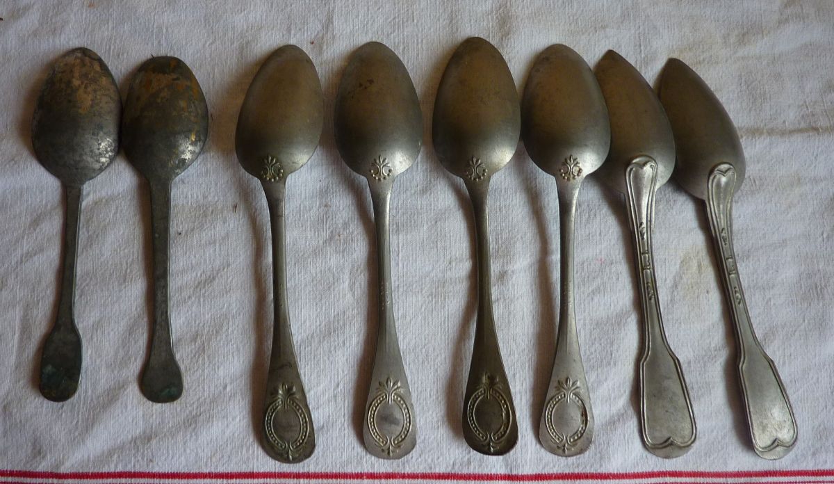 Lot de 8 cuillères anciennes en étain dont 2 format pour bouillie enfant. Longueur 20 cm, et 12,5 cm pour les petites. Bel objet de décoration en très bon état de conservation. Retrait sur place à Orsay (91) contre paiement en espèces uniquement. Si expédition des frais supplémentaires seront à payer par l'acheteur.