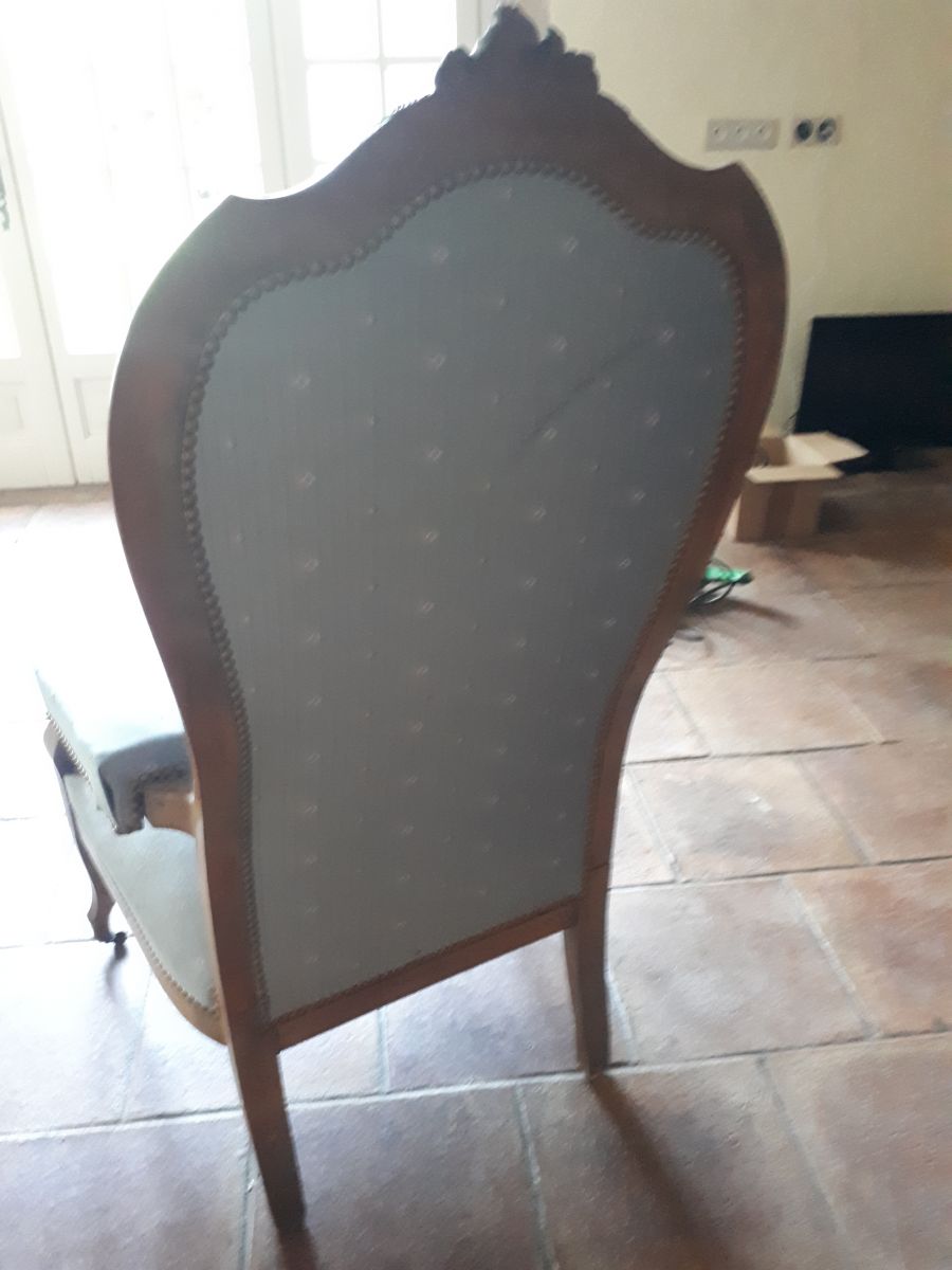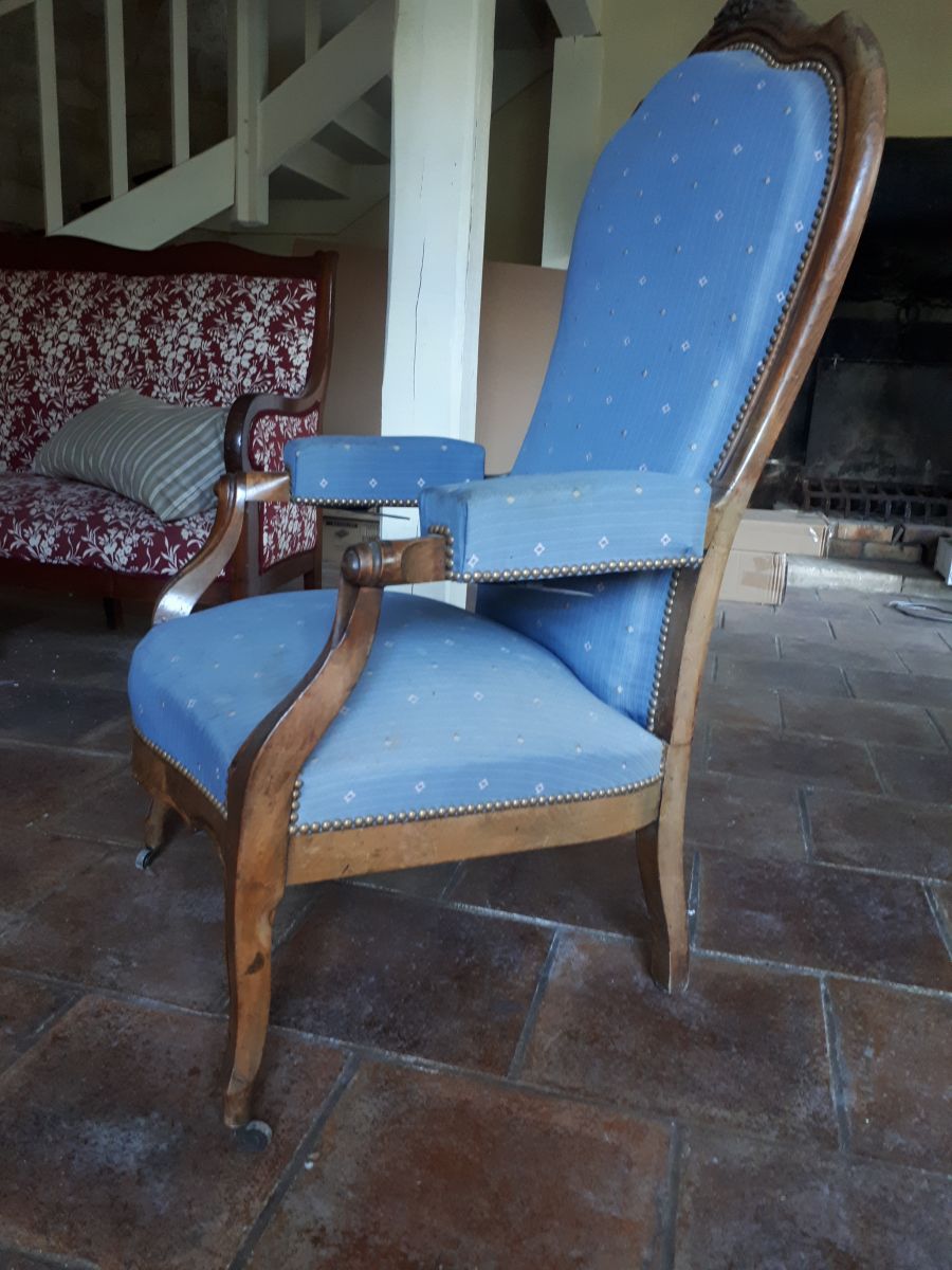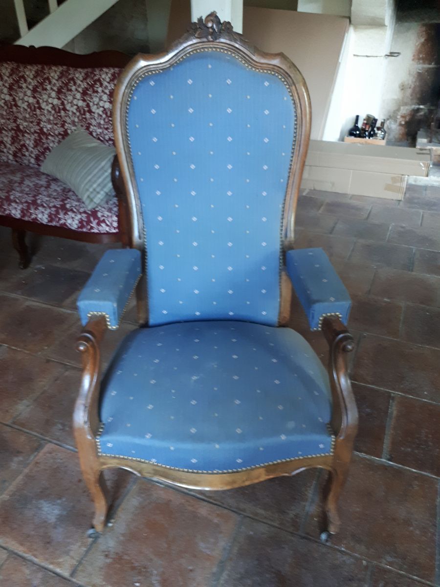Vends fauteuil ancien style voltaire avec cremaillere qui permet une légère inclinaison du dos du fauteuil.