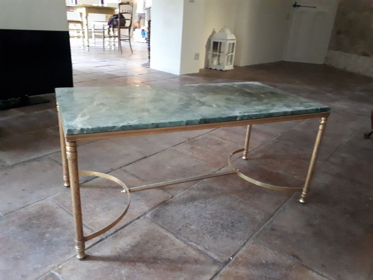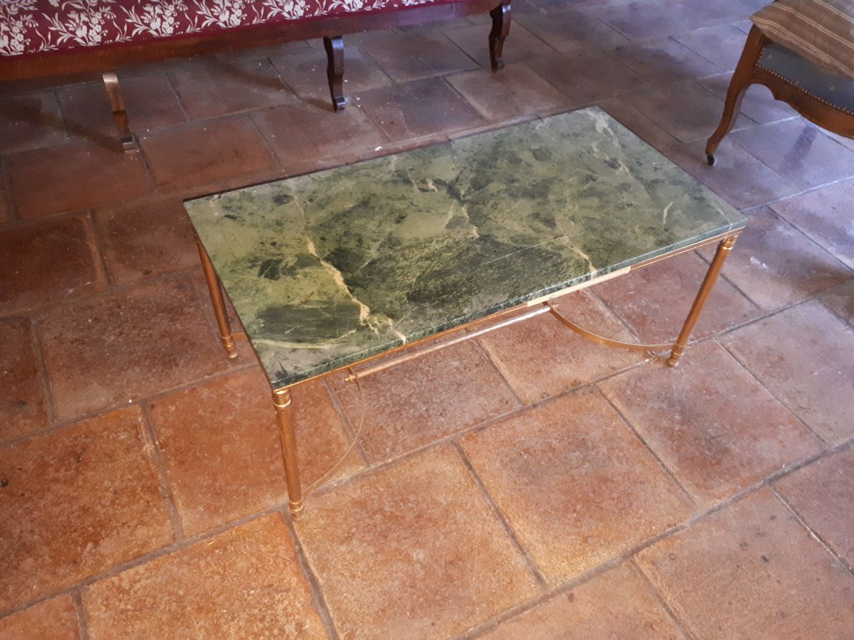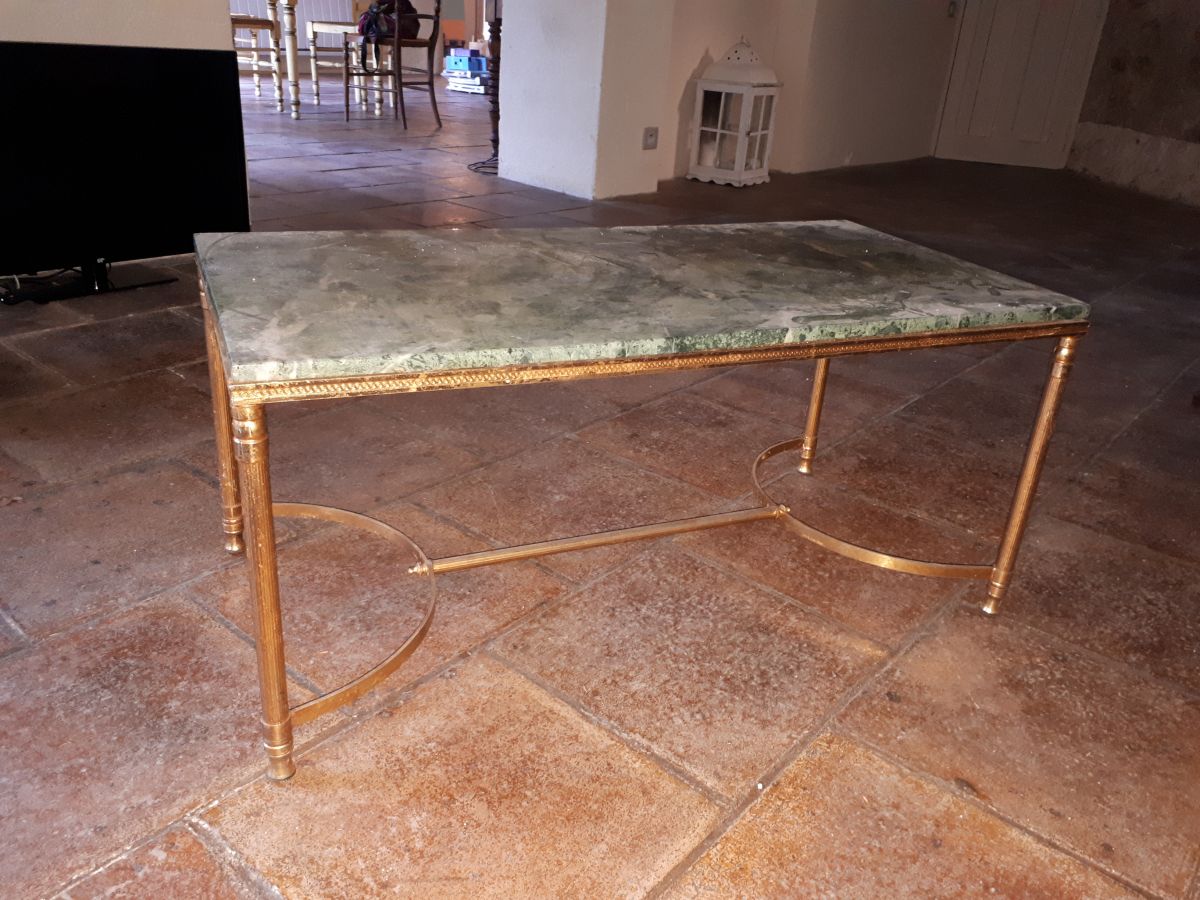 Jolie table de salon des années 60, dans le style néoclassique. Plateau amovible en marbre vert, structure en laiton travaillé dans le style de la maison Baguès. Idéal pour une touche "art déco" dans votre salon !
