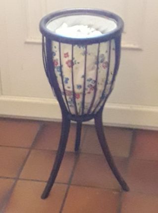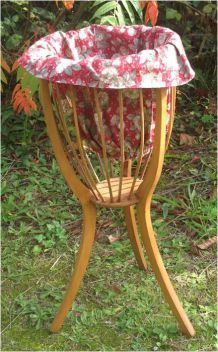 Très joli panier à couture ancien, tripode, peu encombrant, en bois foncé, panier interne plastifié à motifs fleuris.