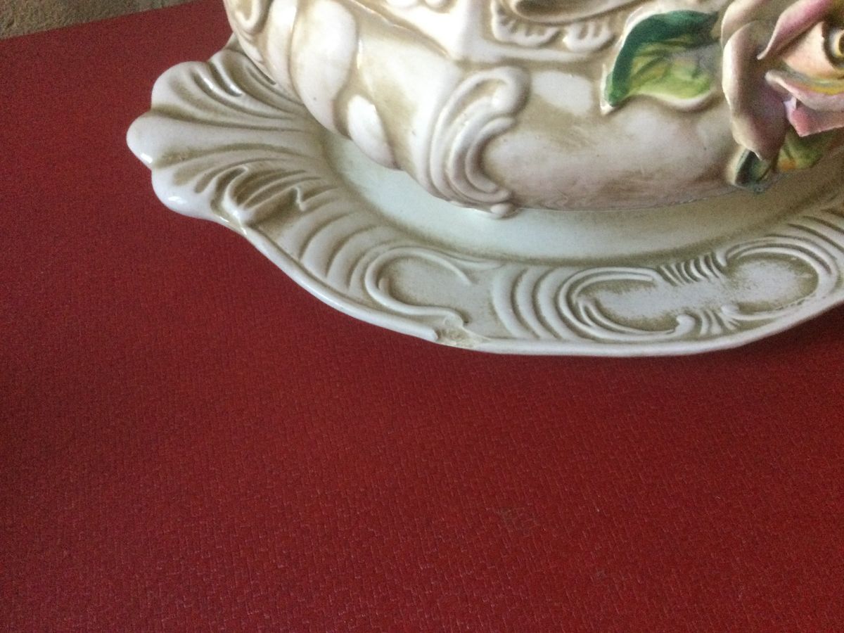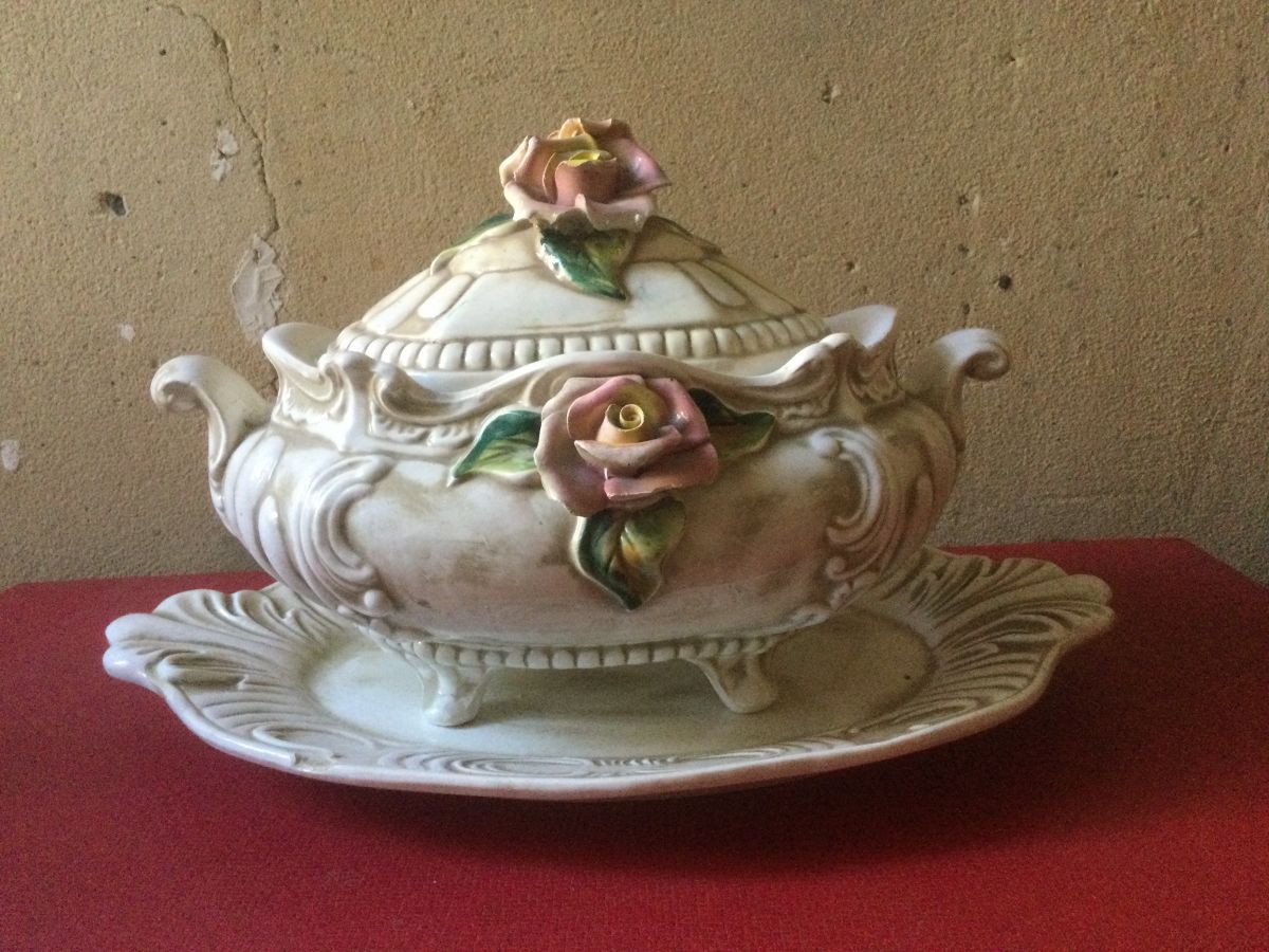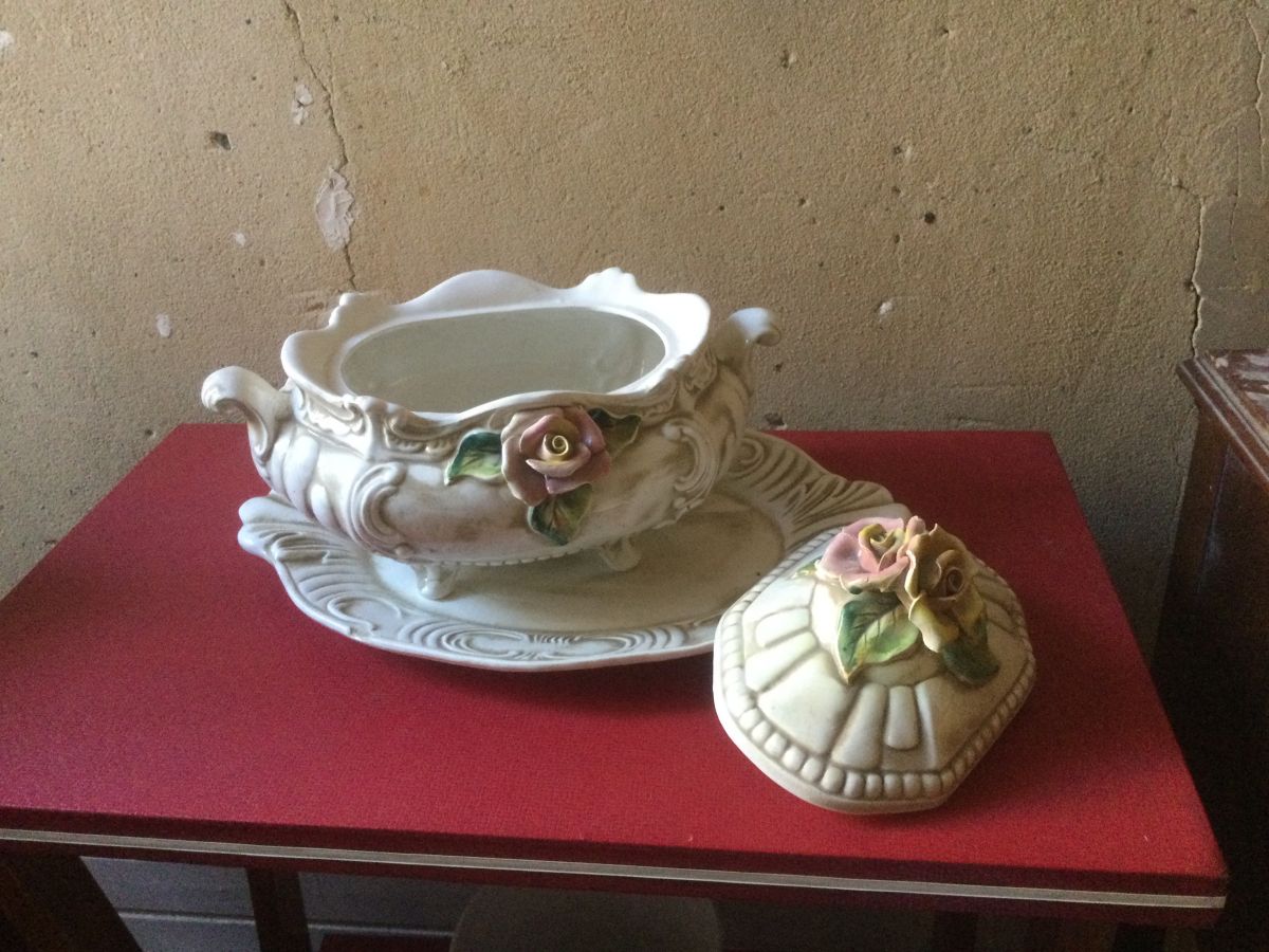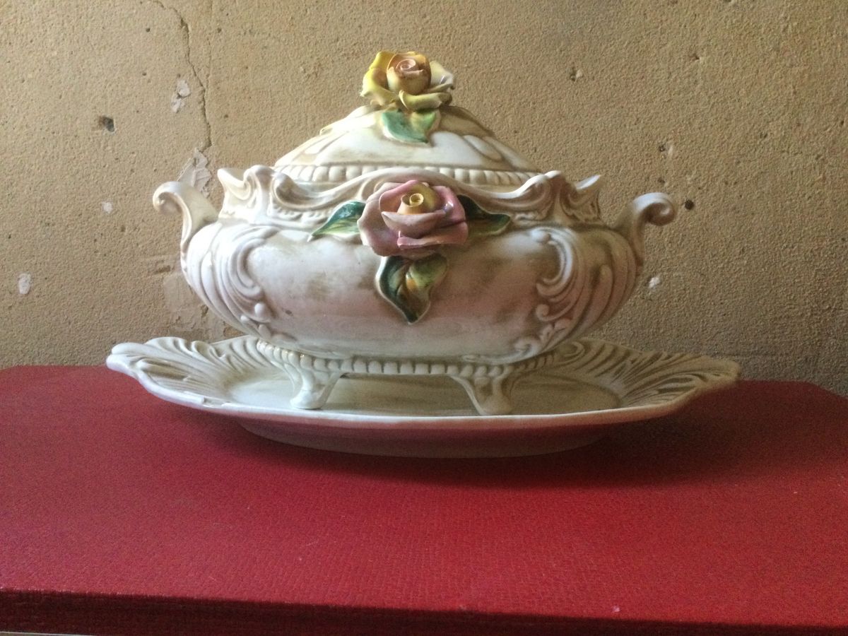 Très jolie soupière décorative Italienne en porcelaine , avec son plat , marque Capodimonte , fleurs en barbotine