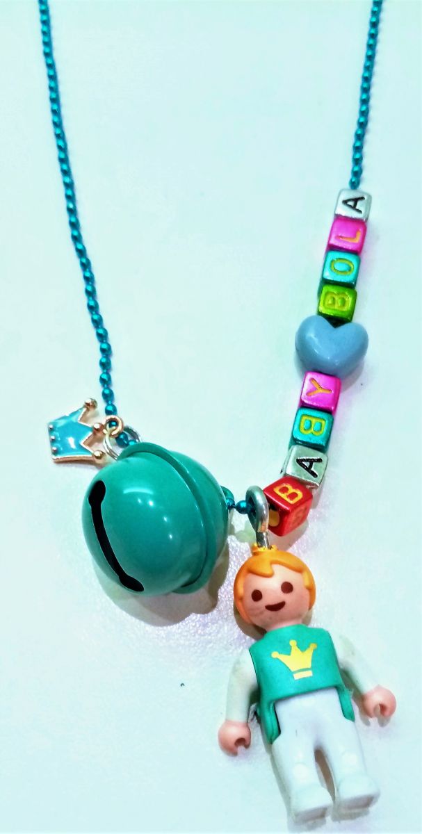 Ma collection de 4 modèles sont des chaînes à billes colorées en acier, sans nickel, non allergénique, composé d'un grelot assorti qui émet un joli son harmonieux lorsqu'il roule sur le ventre des futures mamans. Sur chaque modèle se trouve un e figurine de bébé Playmobil et des ornements différents et personnalisables.
