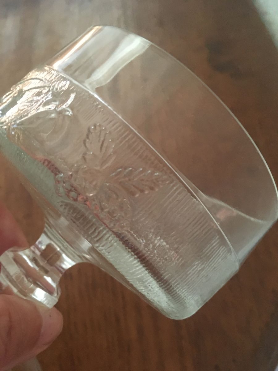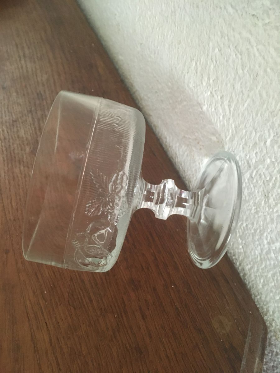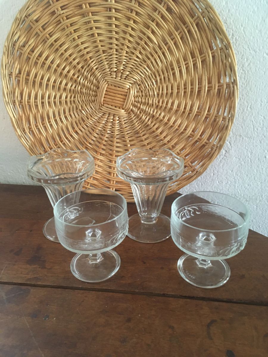 Lot quatre coupes à glaces vintage, dépareillées pour 2 modèles.2 à la forme de tulipes cannelées, sur pied ( 10 x 12 cm) et 2 à la bordure de fruits ( 9 x 10 cm)