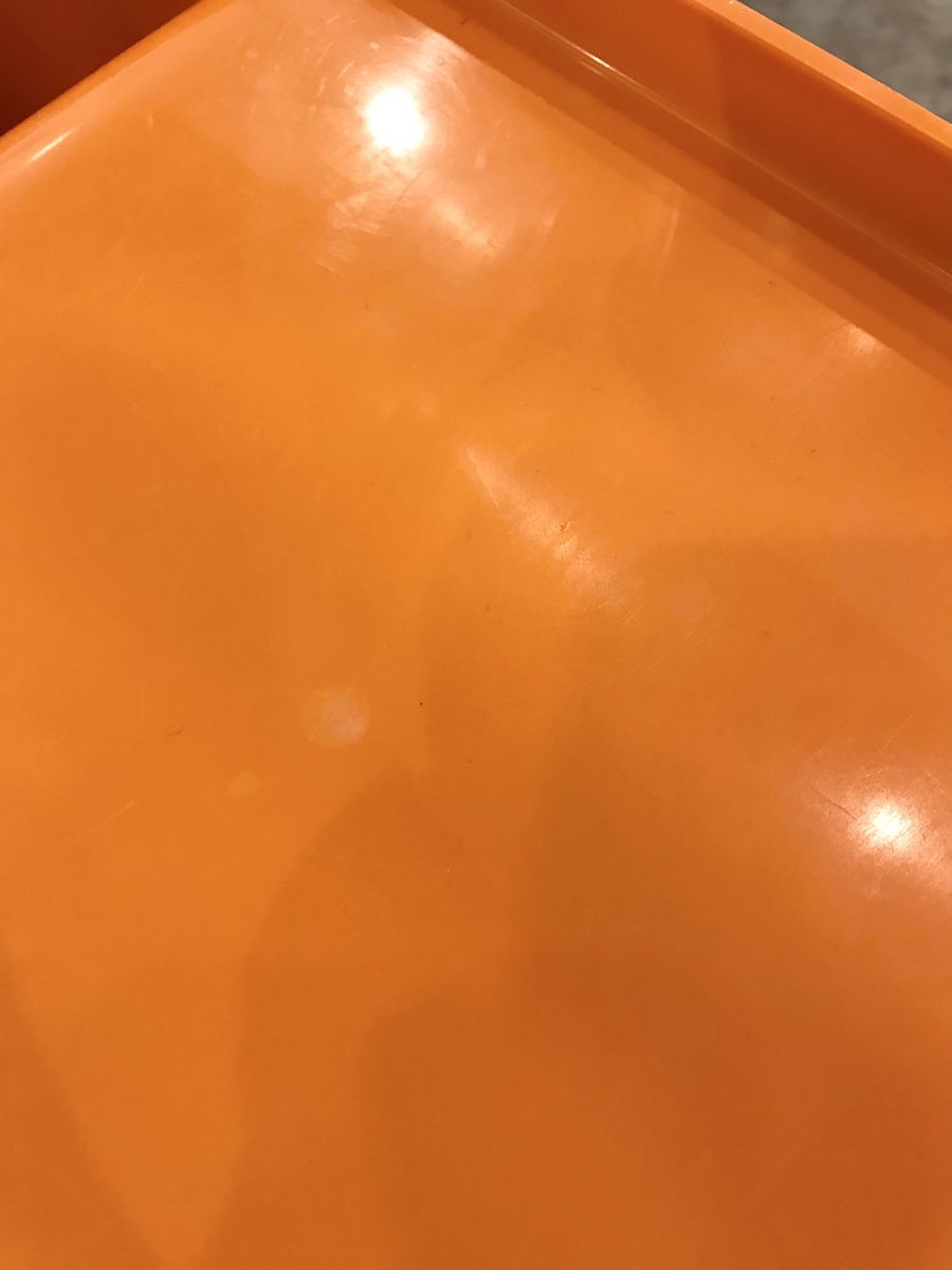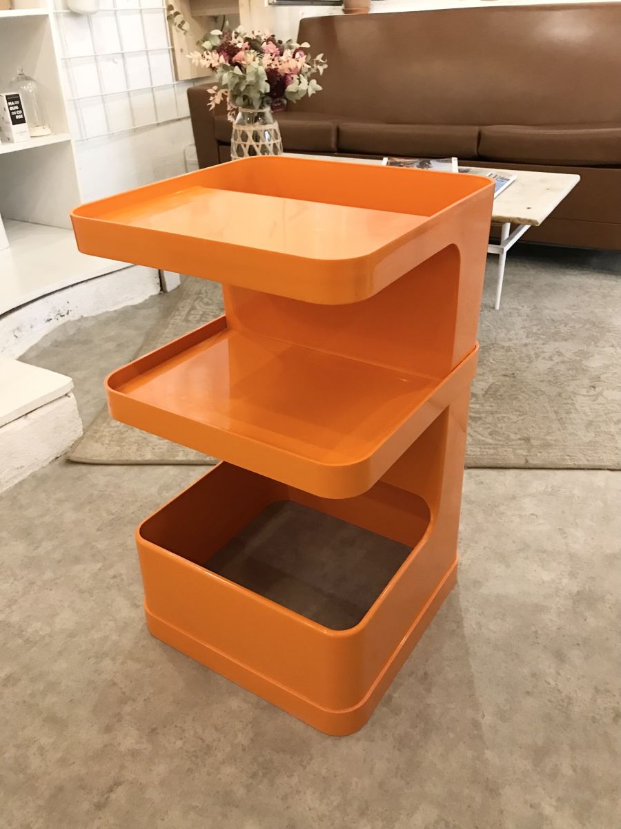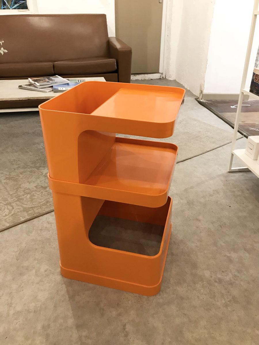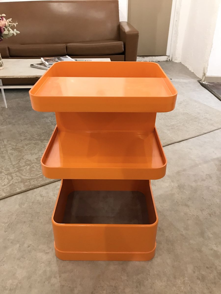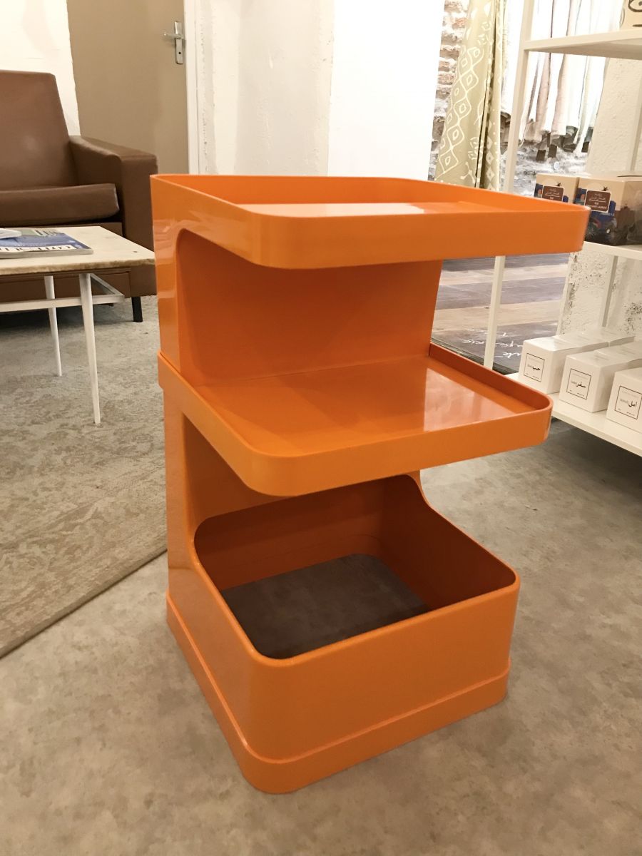 Beau chevet/desserte/bar typique des années 70, design similaire aux éditions « flair » pour prisunic. Très bon état mis à part deux petites taches rondes blanche sur le plateau du haut