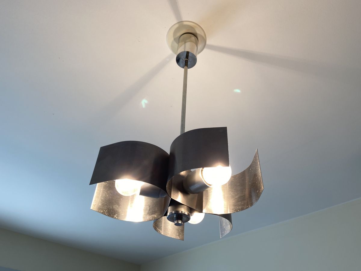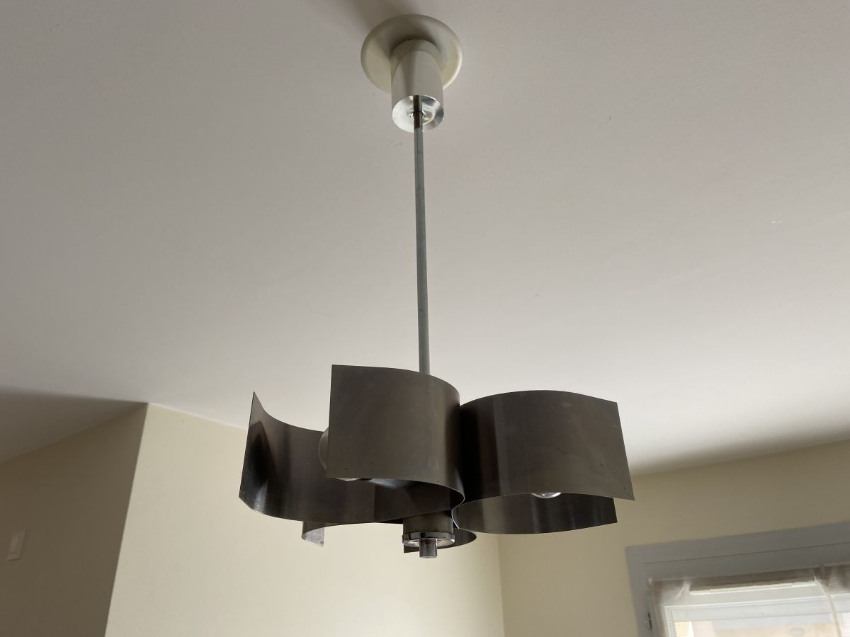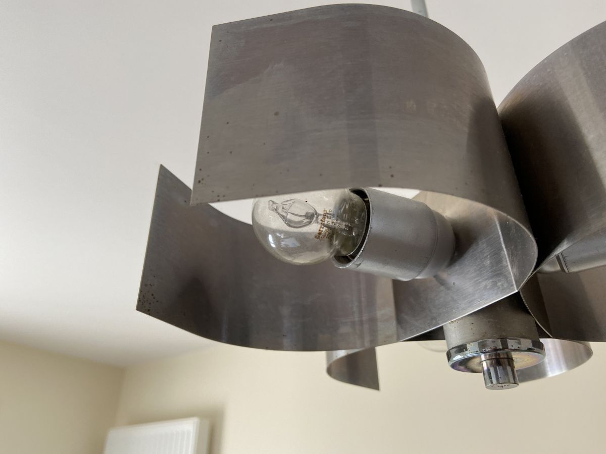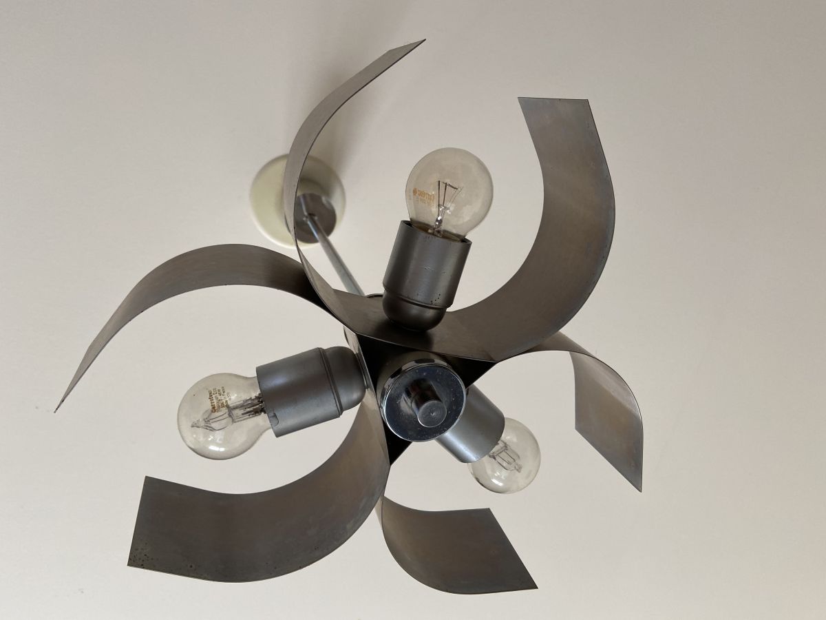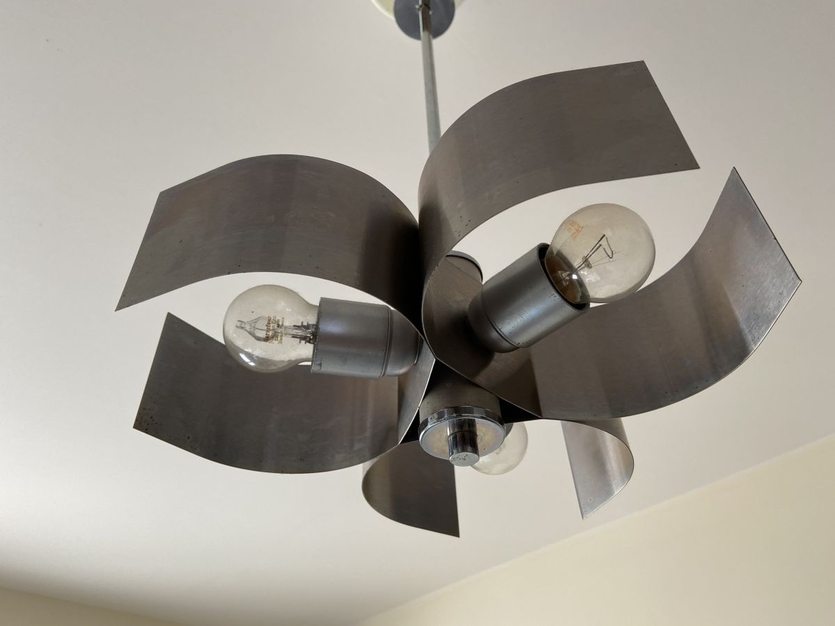Suspension des années 70 de style Space Age, métal chromé, 3 ampoules, hauteur 53cm, diamètre 30cm, bon état.