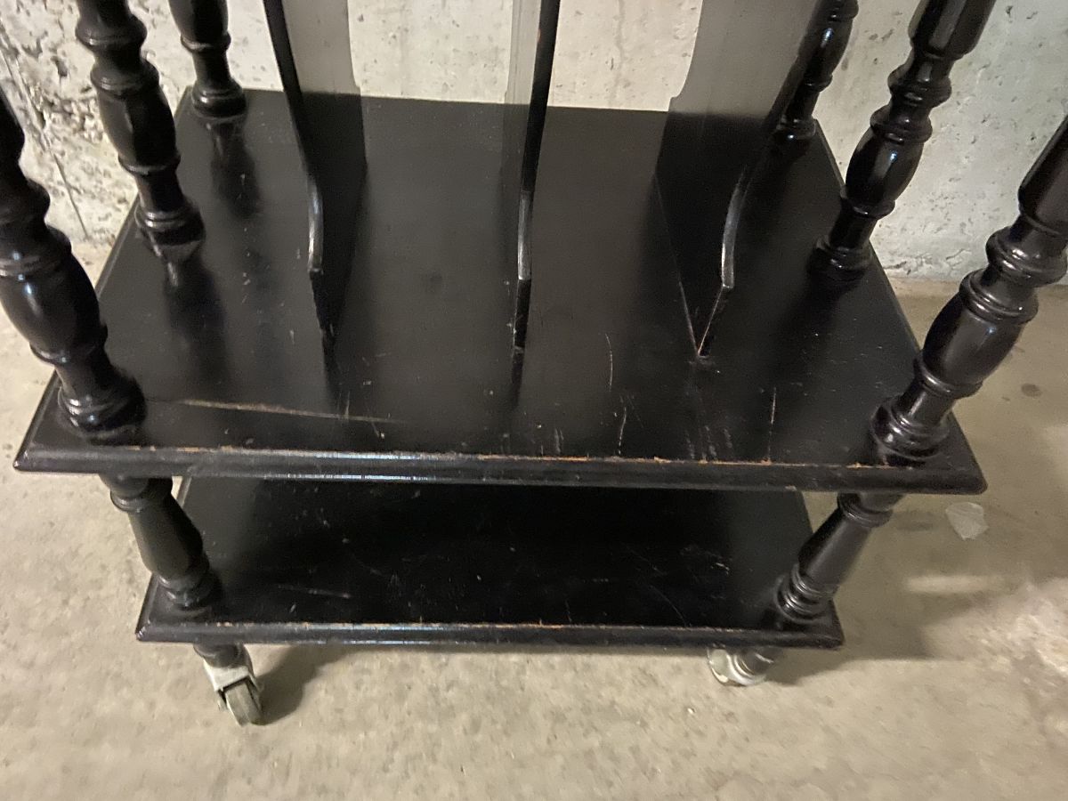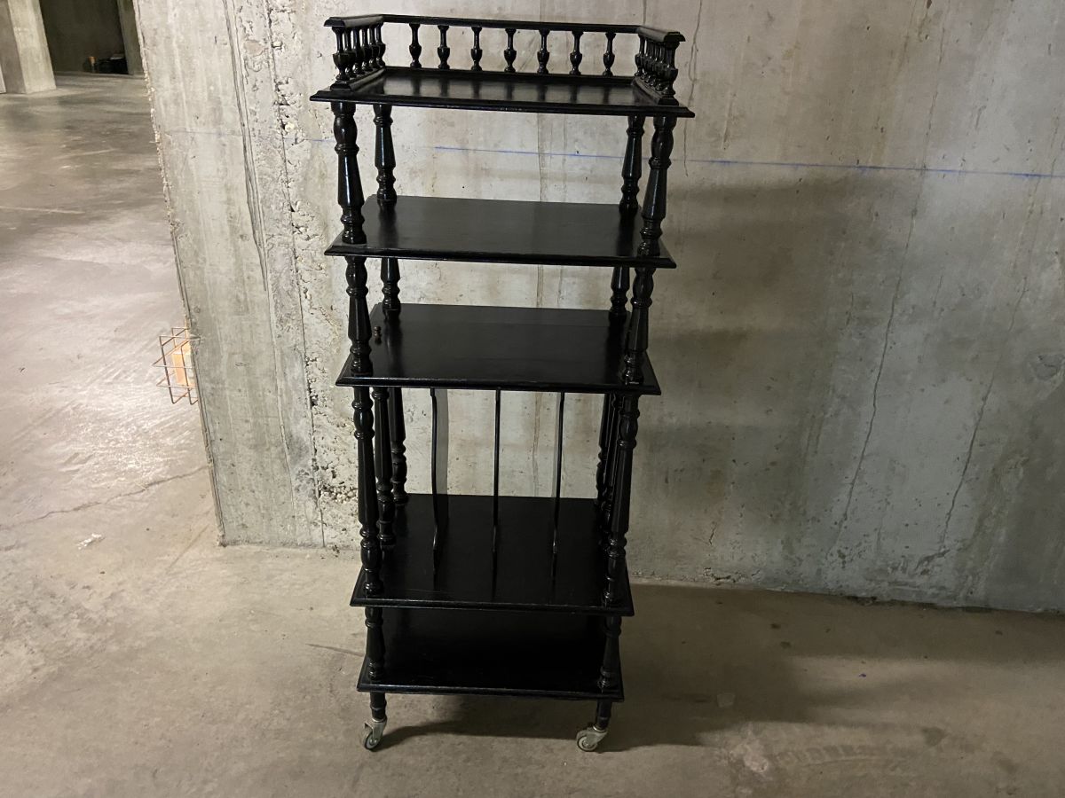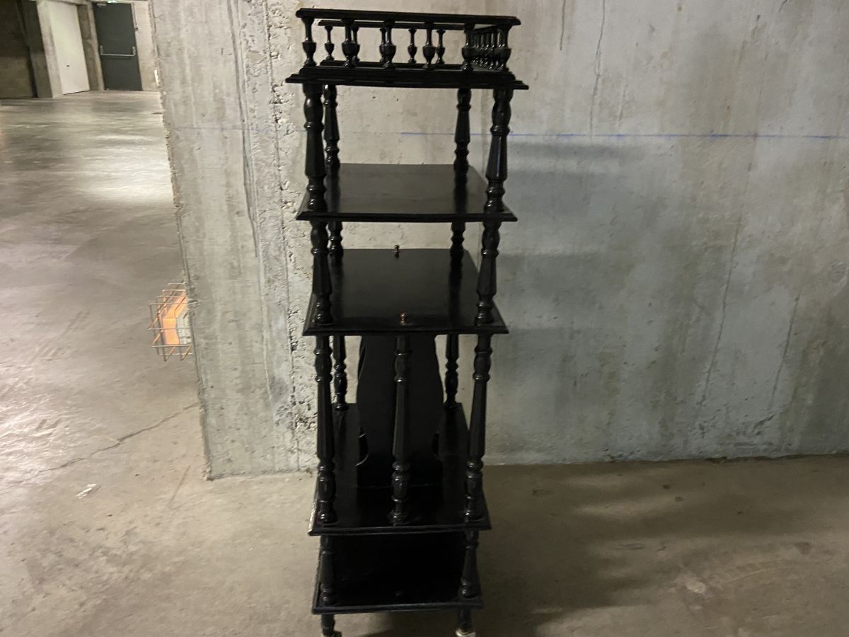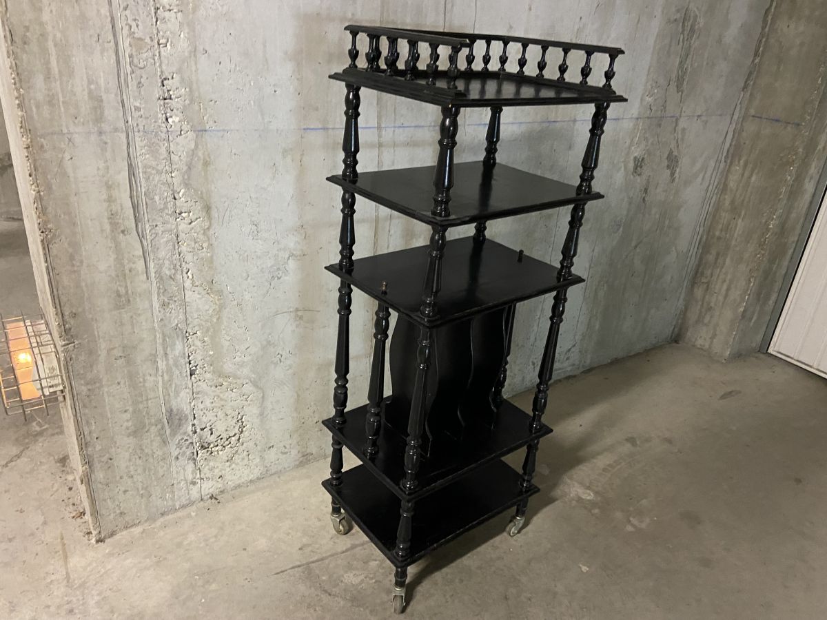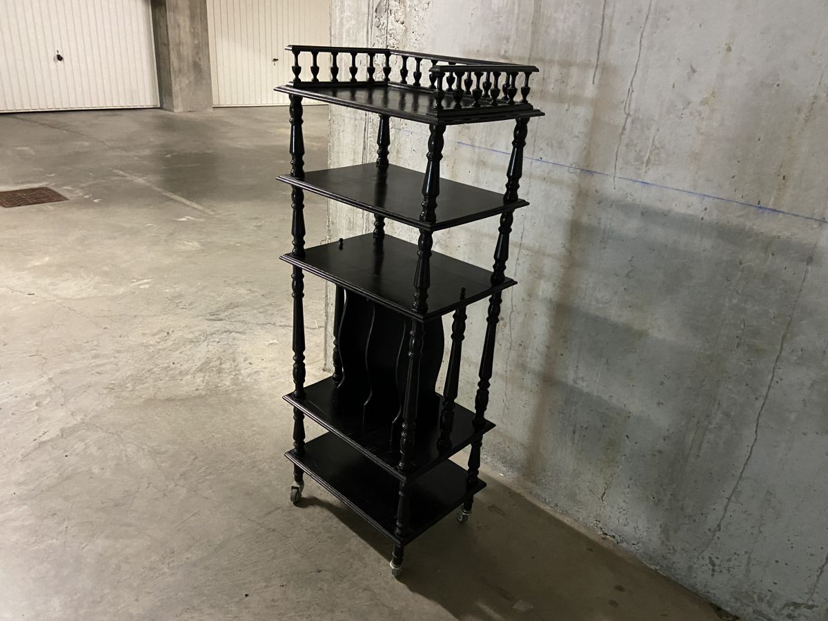Meuble de musique de style Napoléon 3 en bois noirci, 5 plateaux, 1 étage dédié aux disques, sur roulettes donc très facilement déplaçable, quelques traces d’usage normal, dimensions (cm) : L.47xH.123xP.34, bon état.