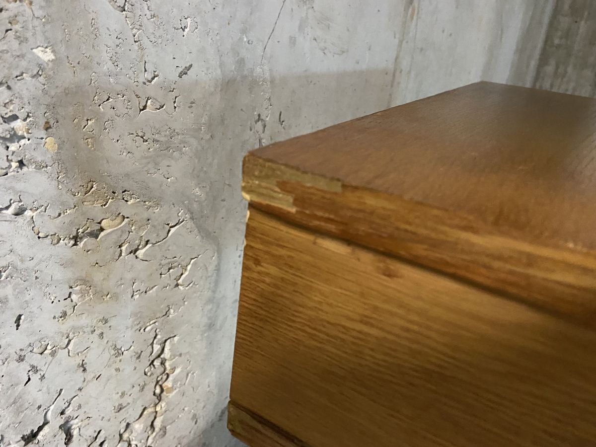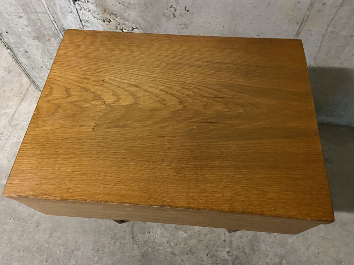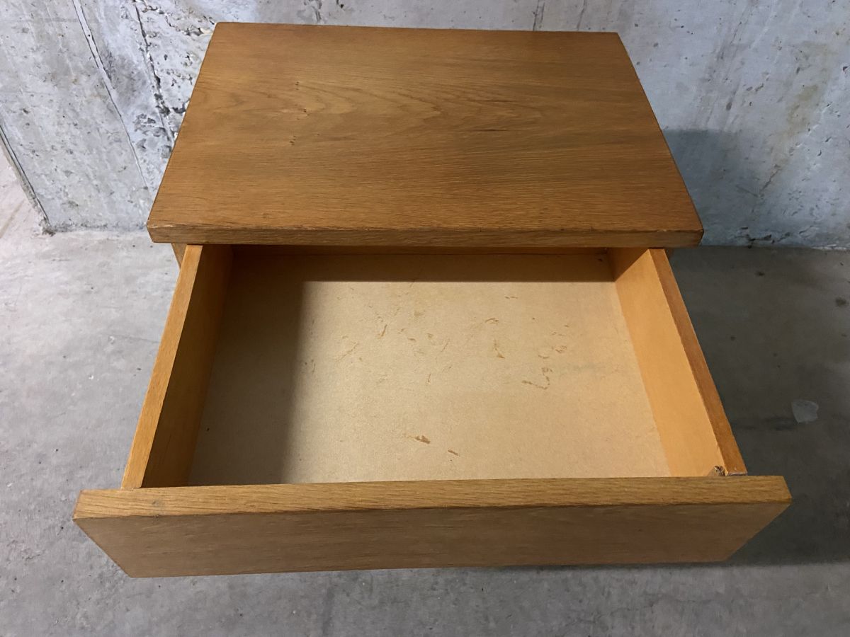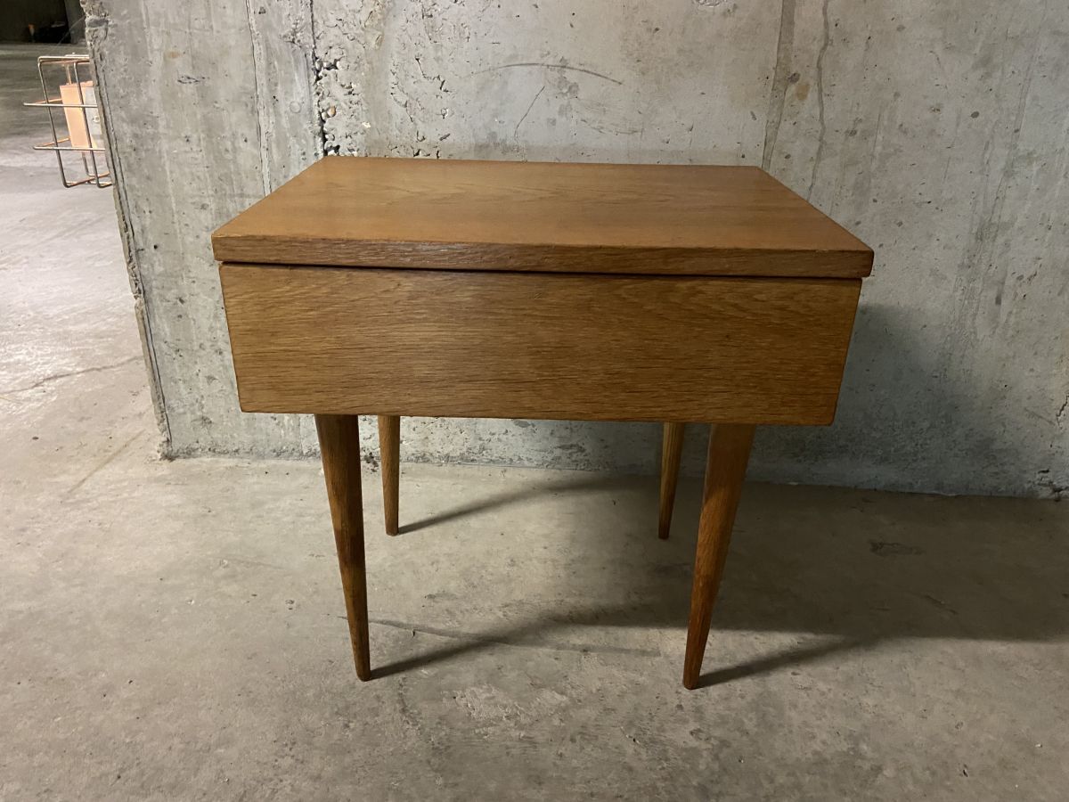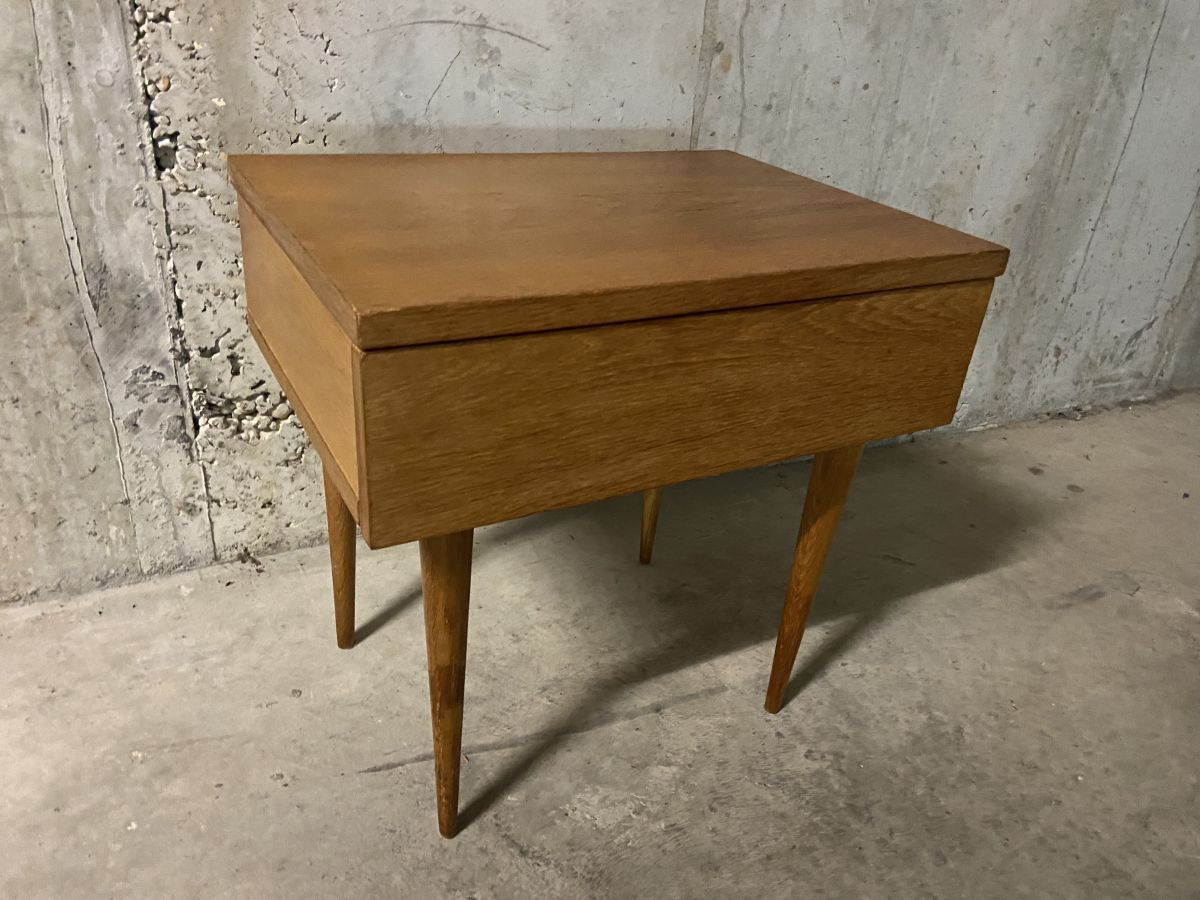 Petit chevet des années 60 en bois massif et placage, 1 tiroir, pieds fuseaux, petits manques sur l’arrière de la bande de champ (voir photos), dimensions (cm) : L.45xH.44xP.33, bon état général.