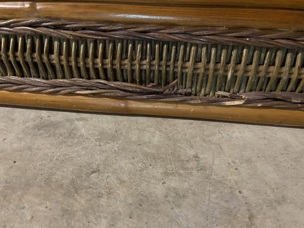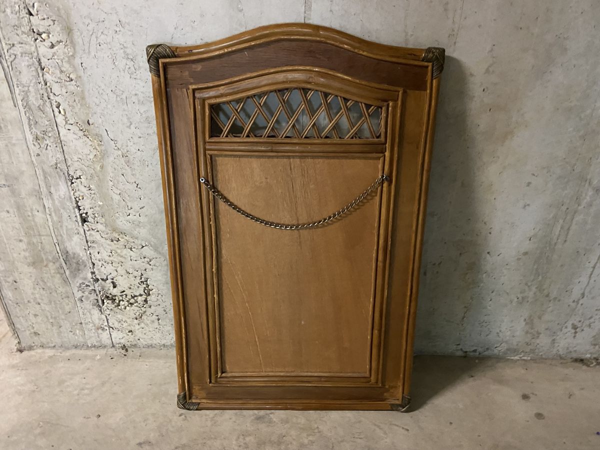 Miroir en rotin des années 60, quelques manques de brins au bas du cadre (voir photos) mais sans conséquence sur l’esthétique, chaînette à l’arrière pour le suspendre, hauteur 87cm, largeur 55cm, miroir 34x51cm, superbe pièce.