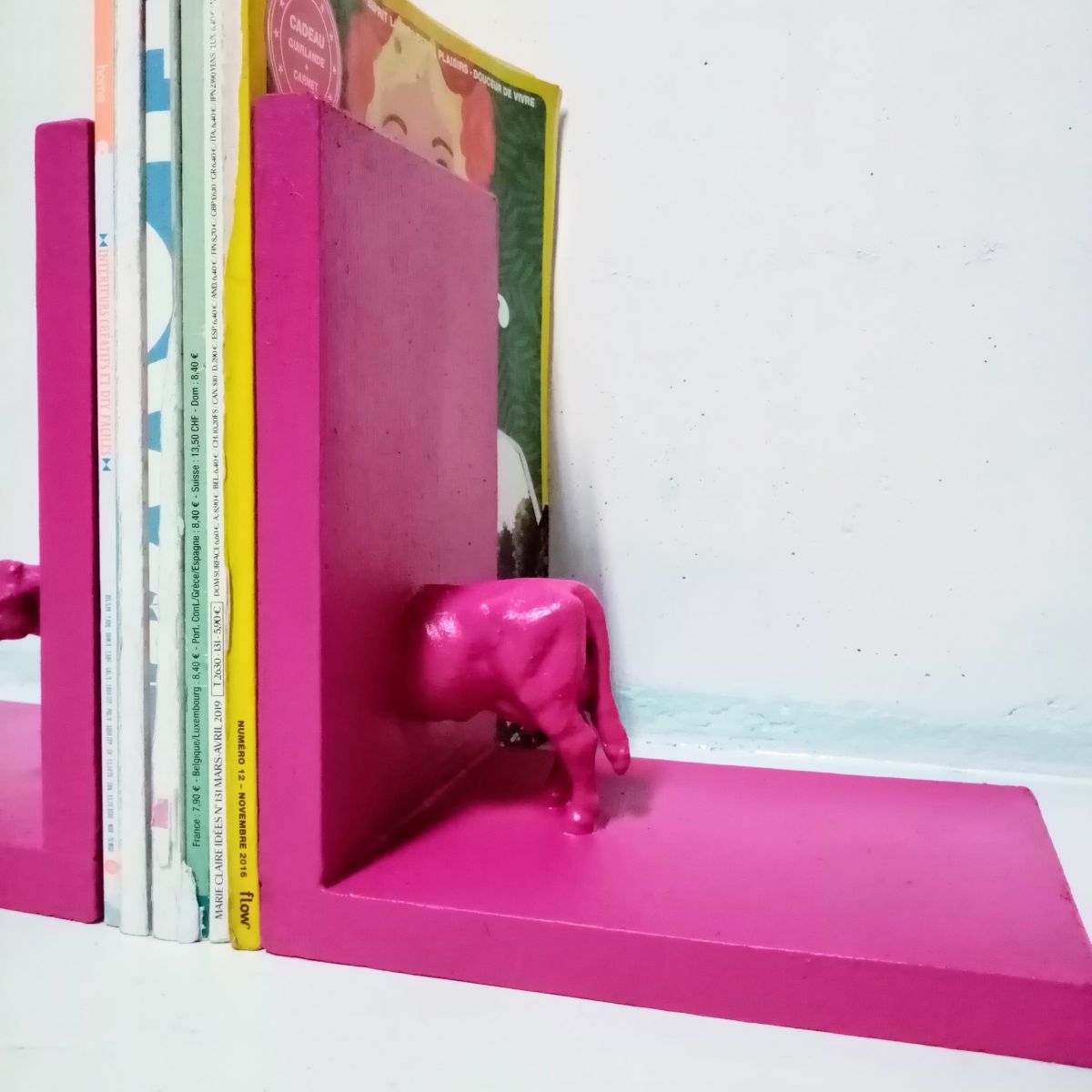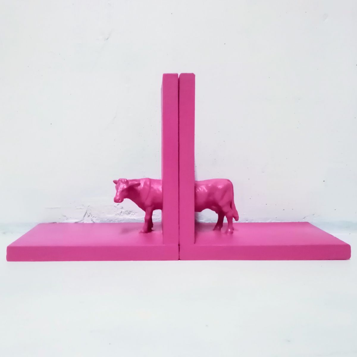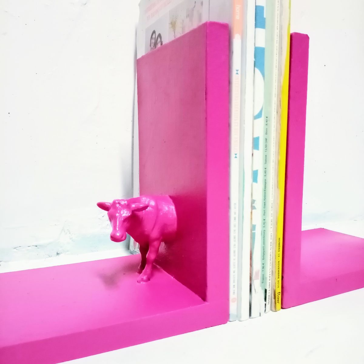 Voici un ensemble de 2 serre livres à la fois utiles et amusants. Cette paire de serre-livres avec deux demie figurines de vache en rose fuchsia, est à assembler pour reconstituer le petit animal. A la fois pratiques et décoratifs, ces serre-livres mettront de la couleur sur les étagères des enfants ou des adultes et de l'ordre dans les livres de chacun. Sur les angles en bois, on a fixé les deux moitiés de la figurine, puis on les a peint de blanc primaire et de plusieurs couches de rose fuchsia satiné. Ils seraient jolis, placés dans la chambre d'un petit adepte des animaux ou d'un amoureux de la nature et la ferme ne manquant pas d'humour!!