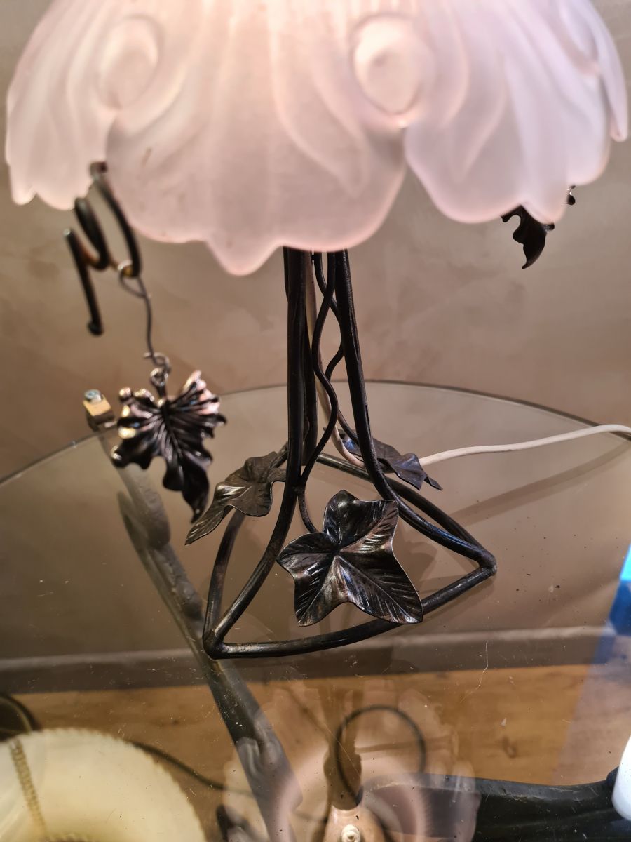 lampe fer forgé , avec belle abat jour verre blanc moulé opaque 22x35