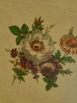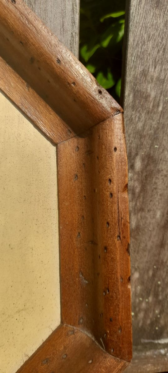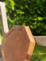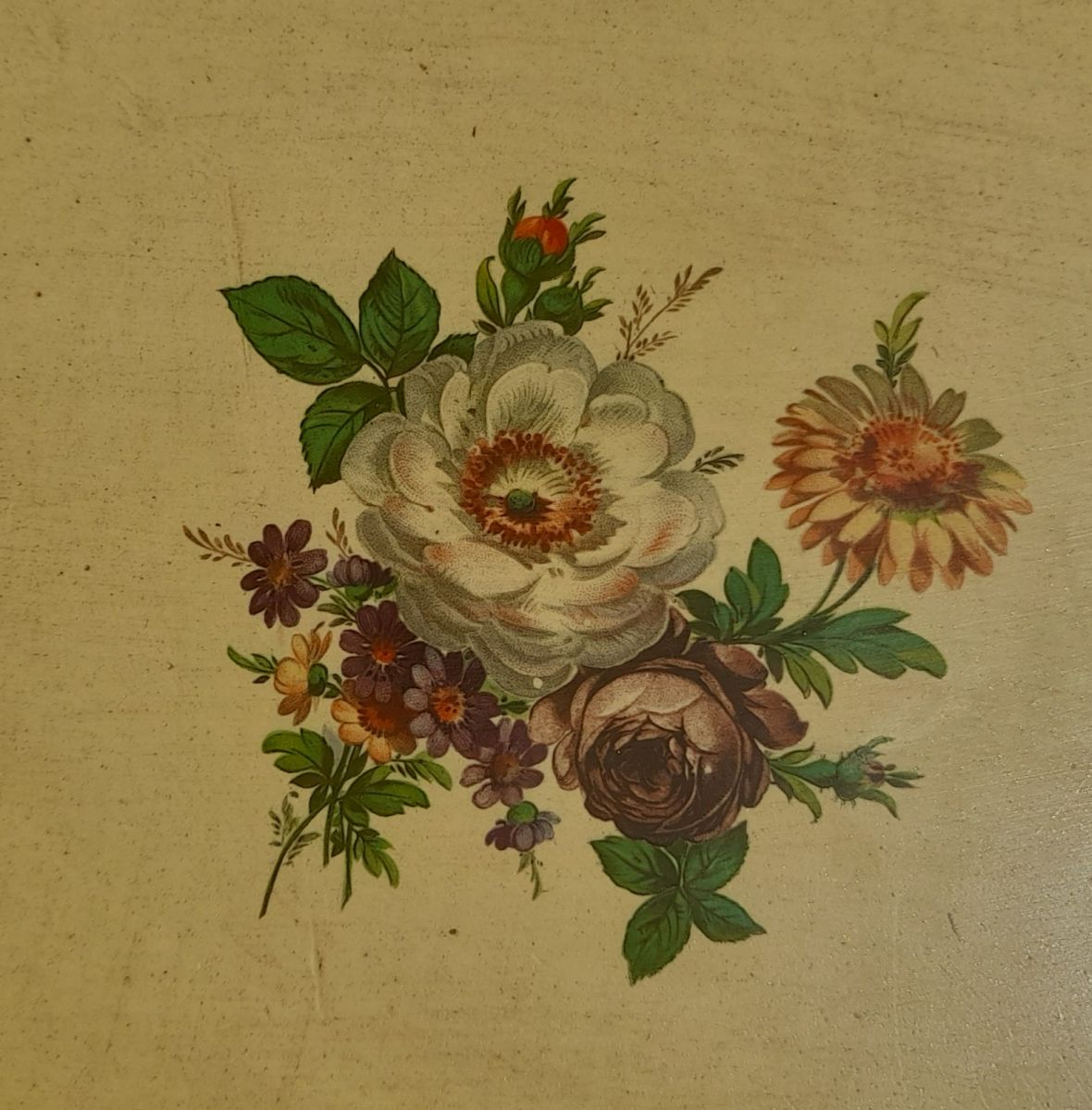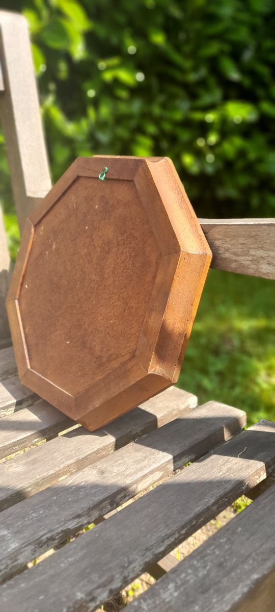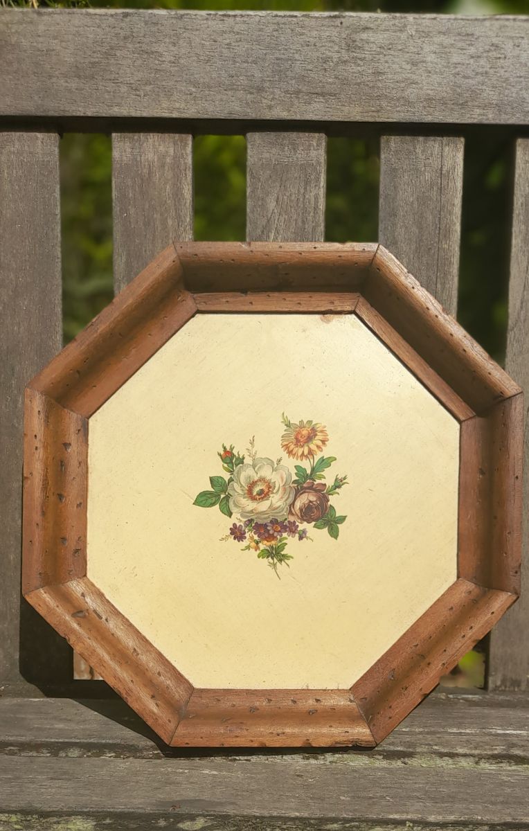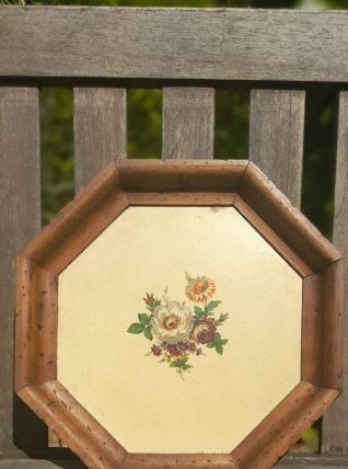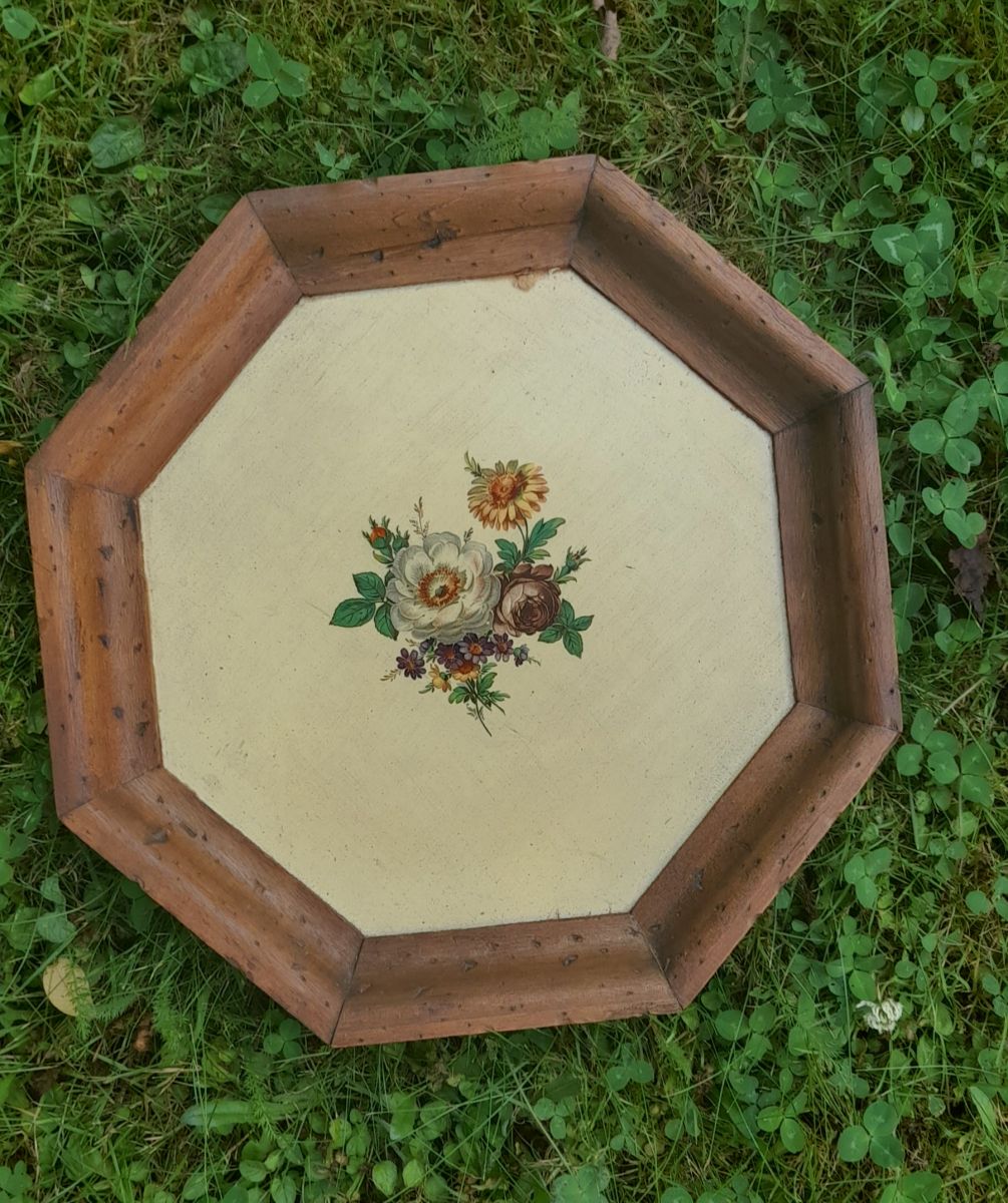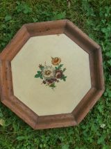 Petit plateau octogonal tout en bois, joli décor floral sur fond jaune harmonieux. L'encadrement possède des marques d'usure, telles que d'anciennes vermoulures qui ont été traitées. A noter une petite tâche en haut à droite du panneau. Cet objet date des années 20 environ, les traces dues à l'âge sont incontournables, il n'en reste pas moins charmant. Peut être accroché au mur, un petit crochet fixé au dos le permet.